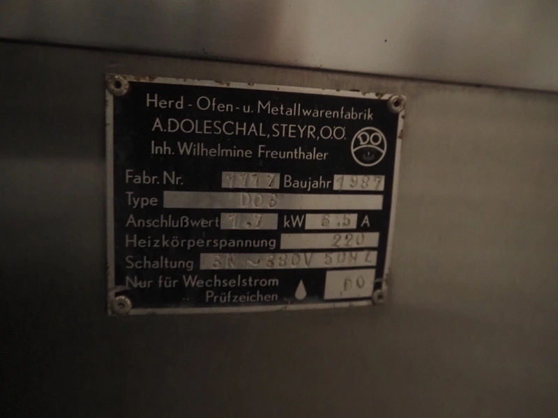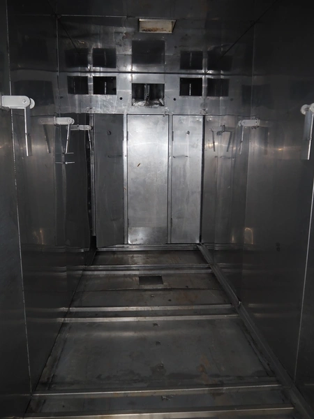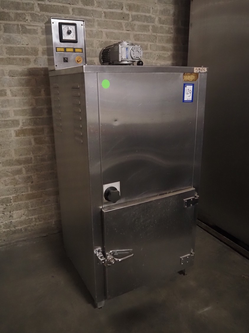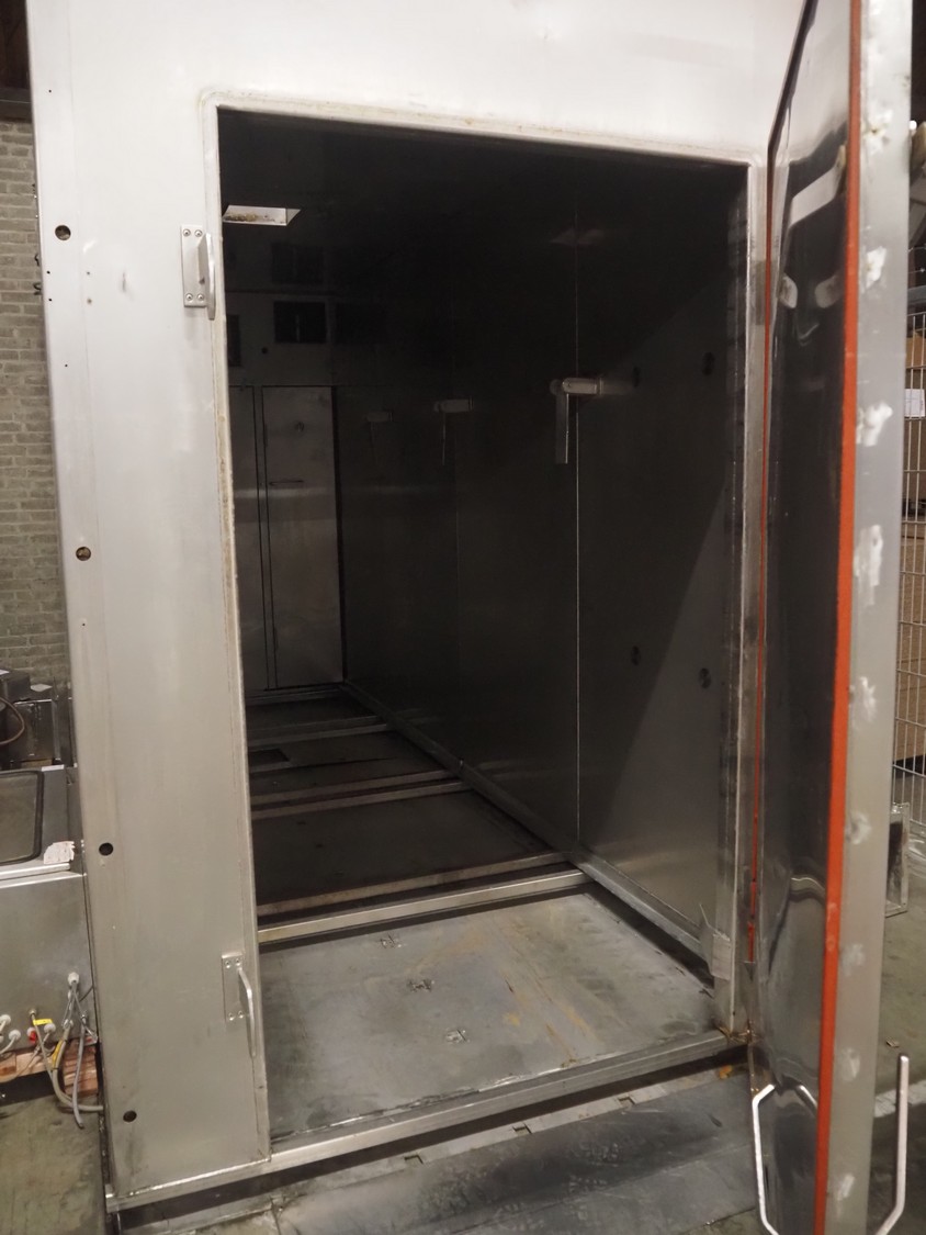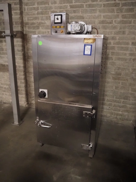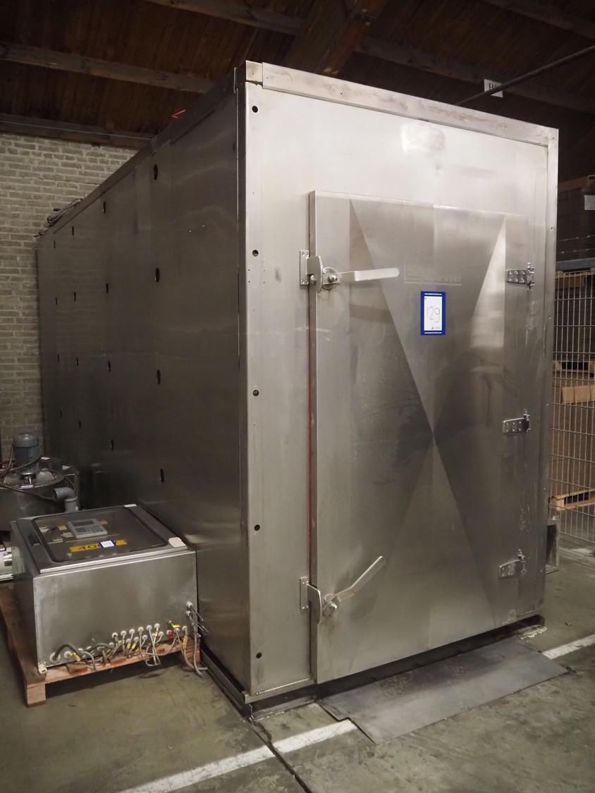 Schroter GmbHSchröter smoking and cooking chamber, type: W4, year of construction: 08/91, 230/400 V, 50 Hz, 12 kW, steam heated, 135 kg per hour, inside dimensions: 4200 mm x 1600 mm x 2600 mm, total dimensions: 4300 mm x 1750 mm x 2850 mm, Smoke generator for wood chips, dimensions: 720 mm x 650 mm x 1650 mm, 3 pallets with s/s switch cabinet and parts. cooking and smoking chamber, inside dimensions: 1330 mm x 1360 mm x 2100 mm, total dimensions: 2000 mm x 1600 mm x 2600 mm.