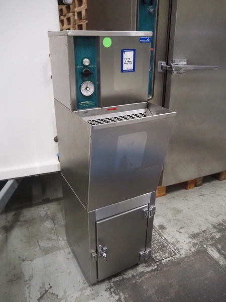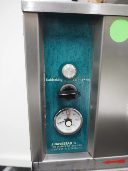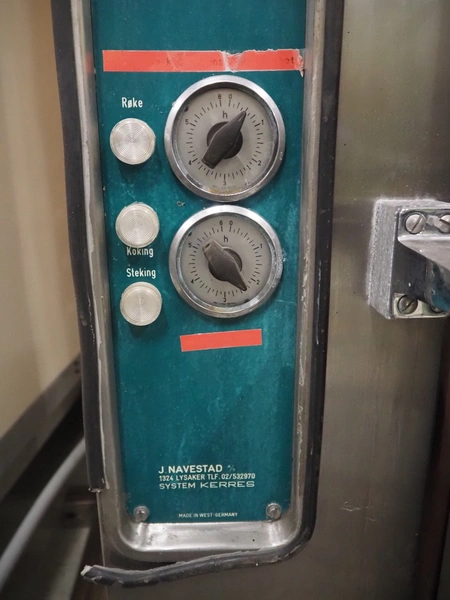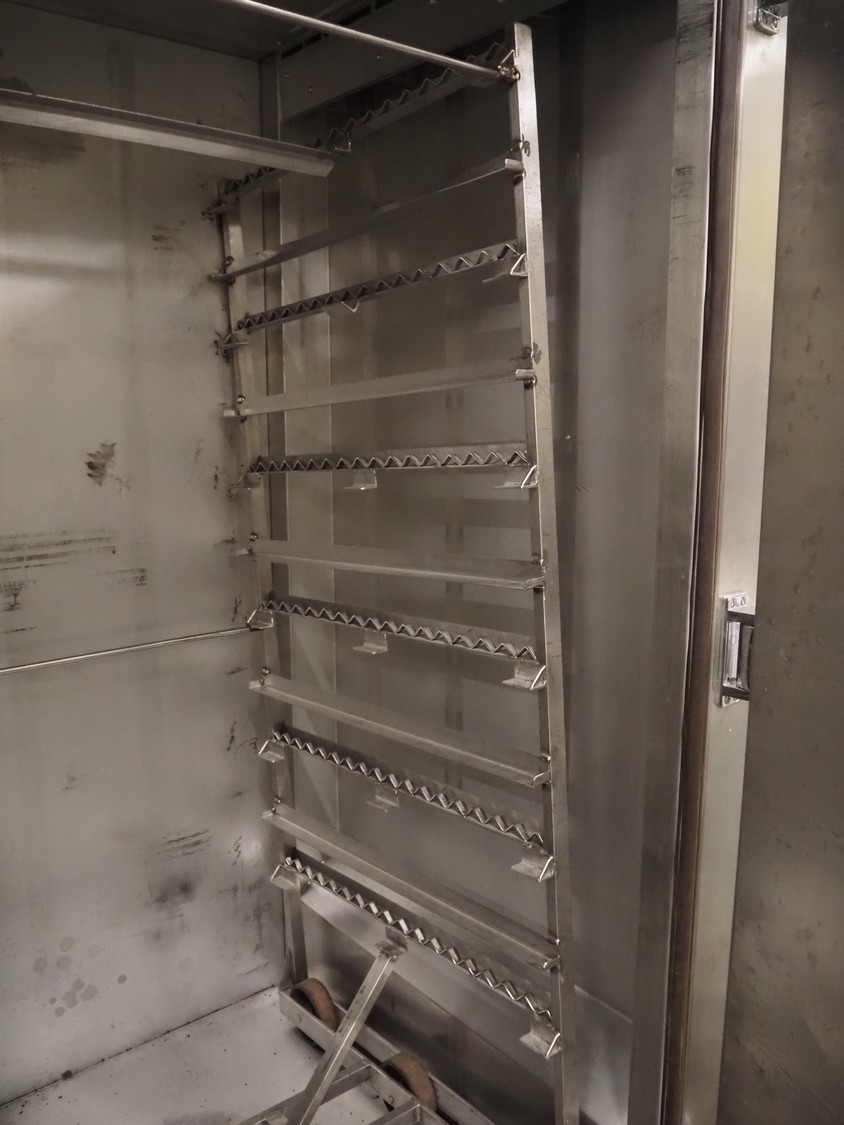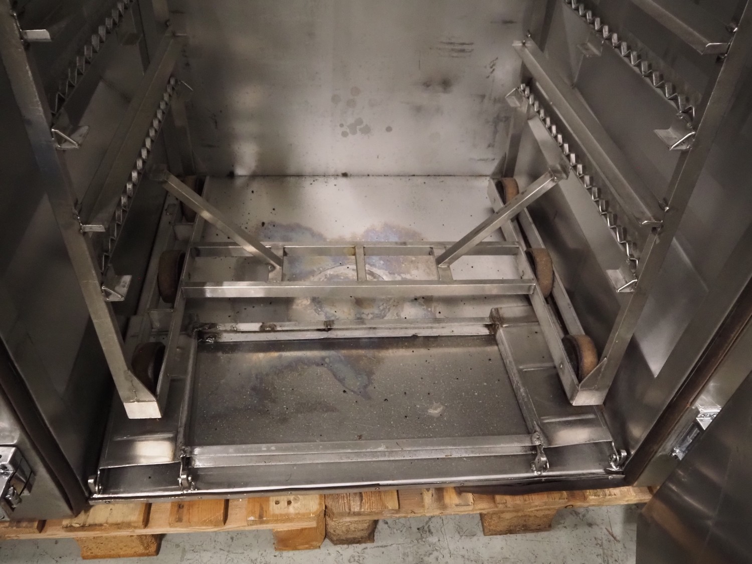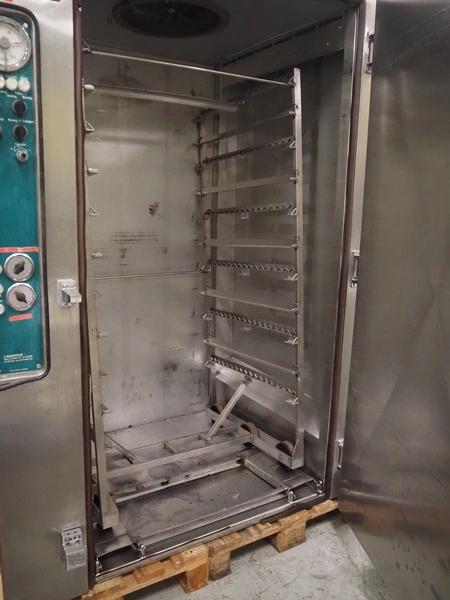 Kerres cooking and smoke chamber, inside dimensions: 950 mm x 1000 mm x 1900 mm, total dimensions: 1500 mm x 1130 mm x 2500 mm. Including s/s smoke trolley, 11 floors, dimensions floors: (11x) 840 mm x 770 mm, dimensions trolley: 910 mm x 780 mm x 1700 mm and Kerres smoke generator, dimensions smoke generator: 700 mm x 400 mm x 1400 mm.