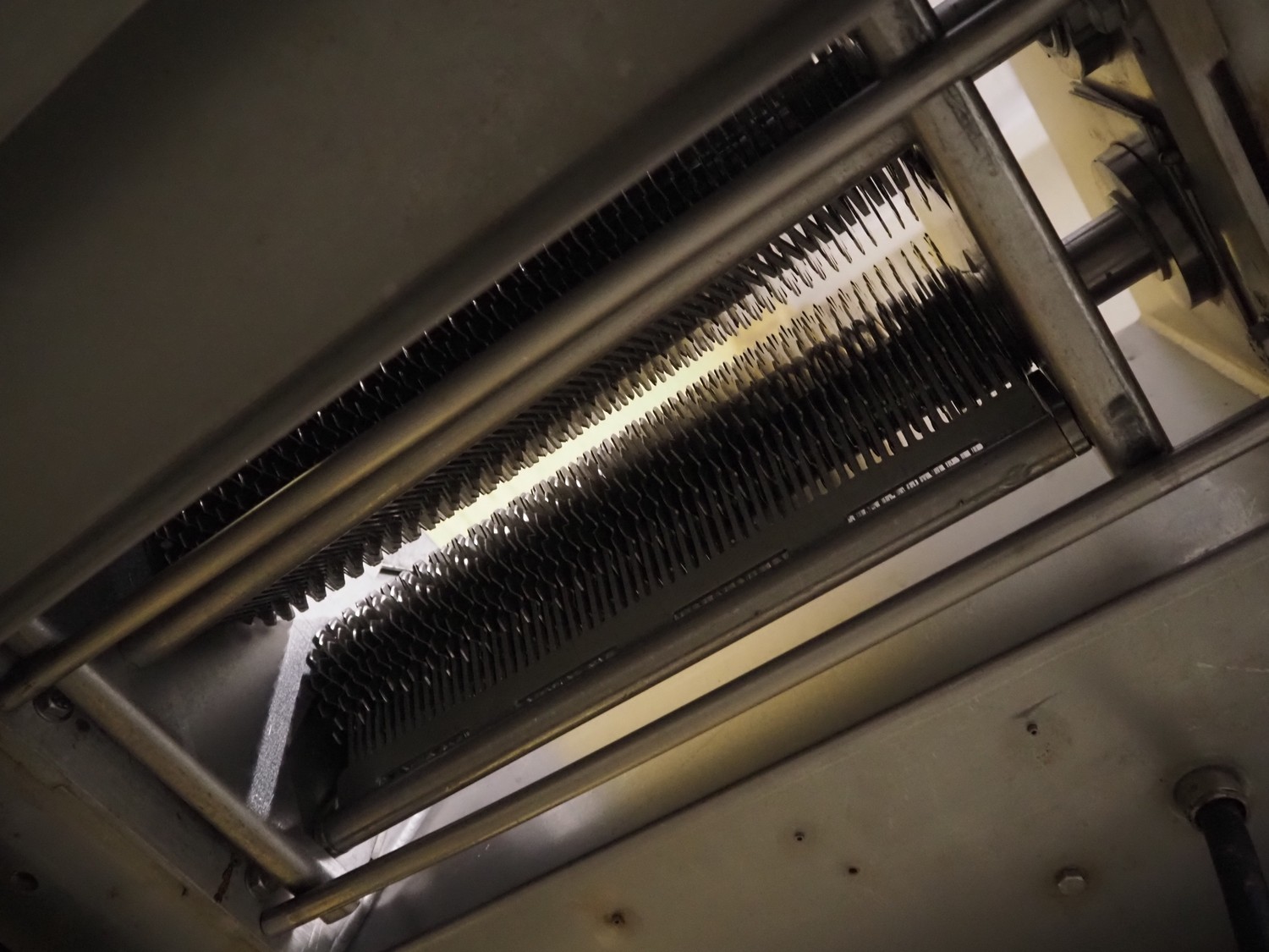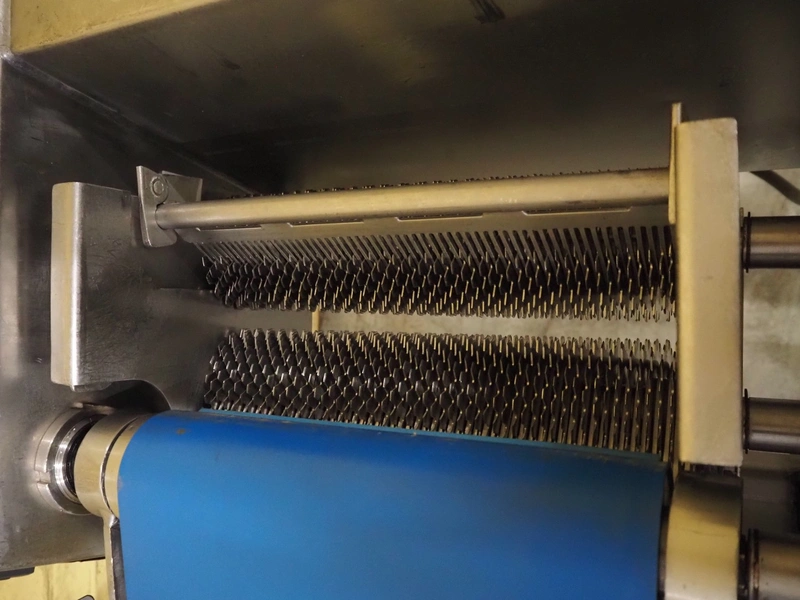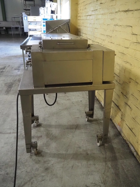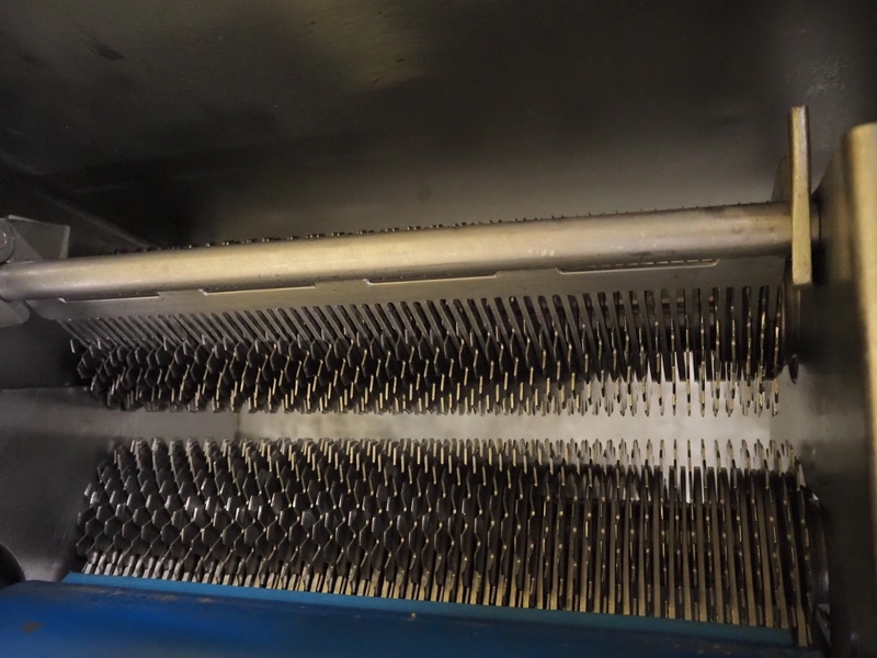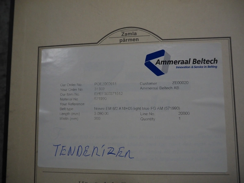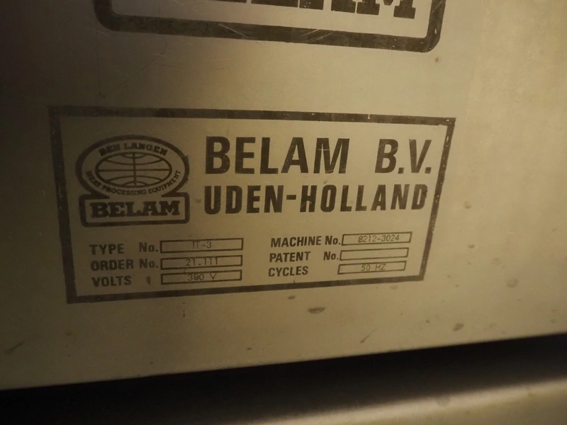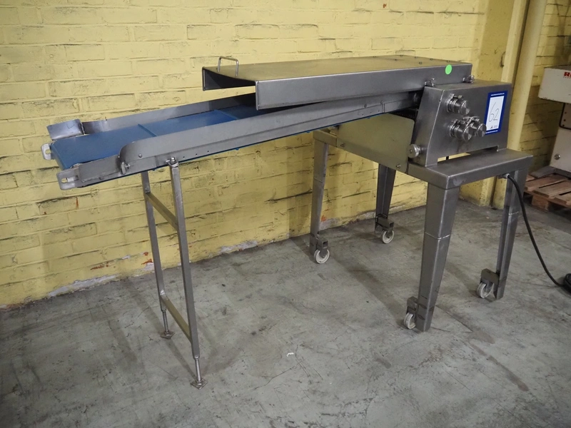 Belam B.V. mobile tenderizer, type: IT-3, machine number: 8212-3024, 380 V, 50 Hz, plastic infeed belt with dividers, belt width: 300 mm, divider height: 5 mm, distance between dividers: 300 mm, working width: 340 mm, total dimensions: 1950 mm x 940 mm x 1220 mm.