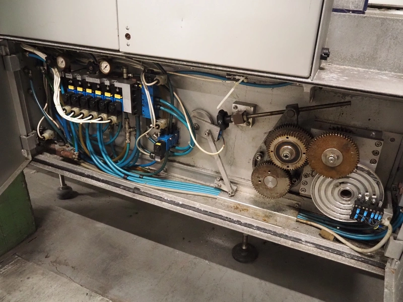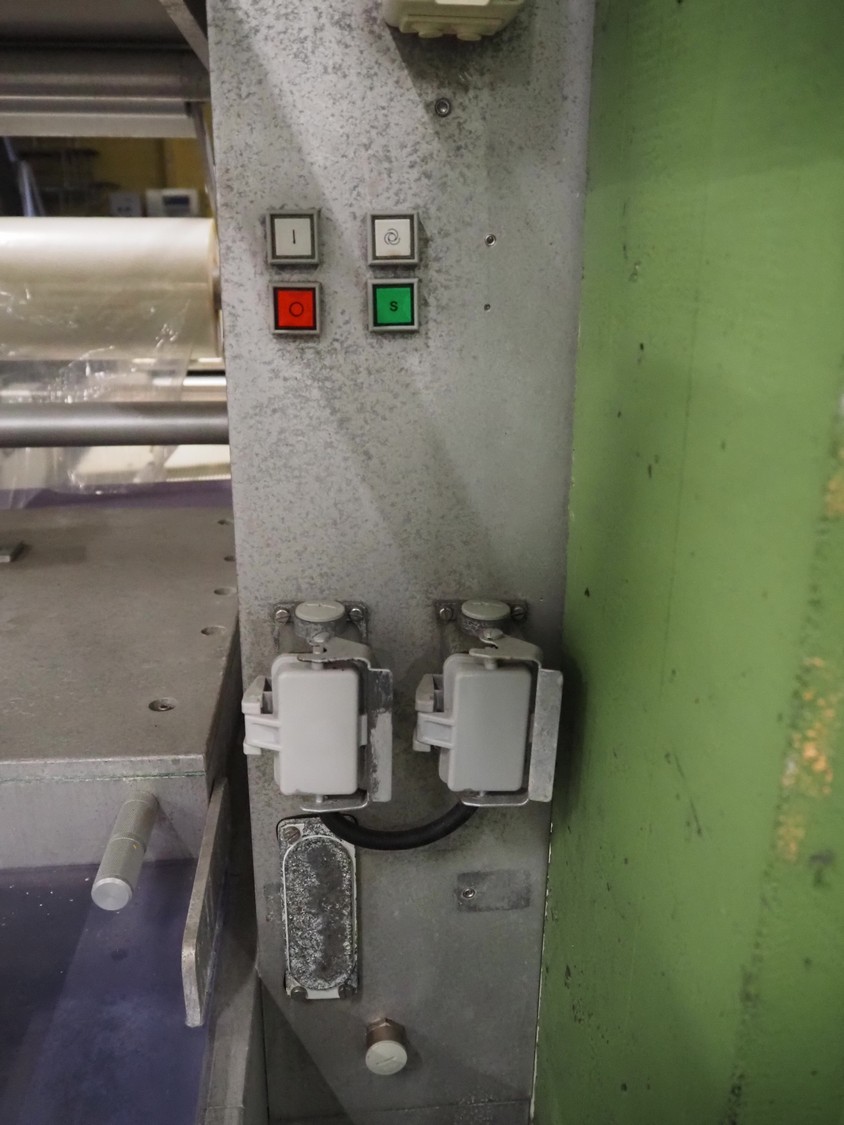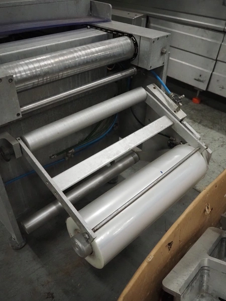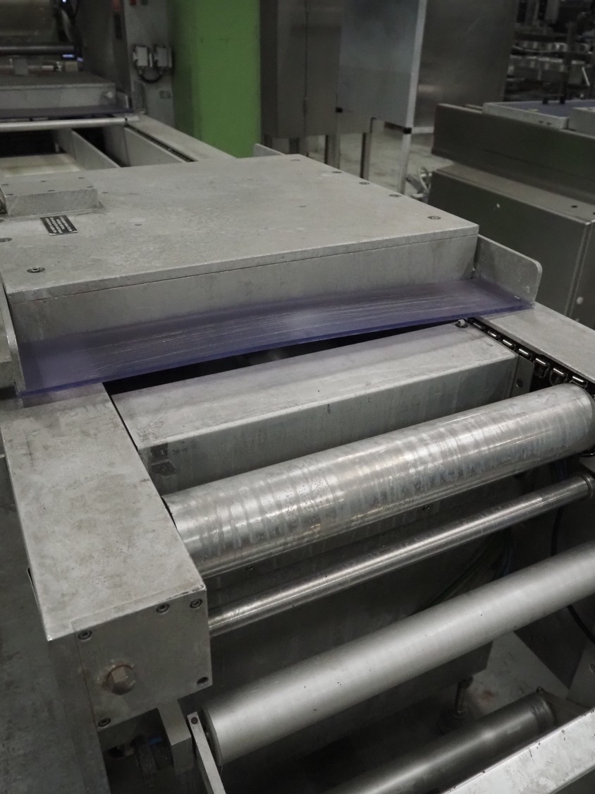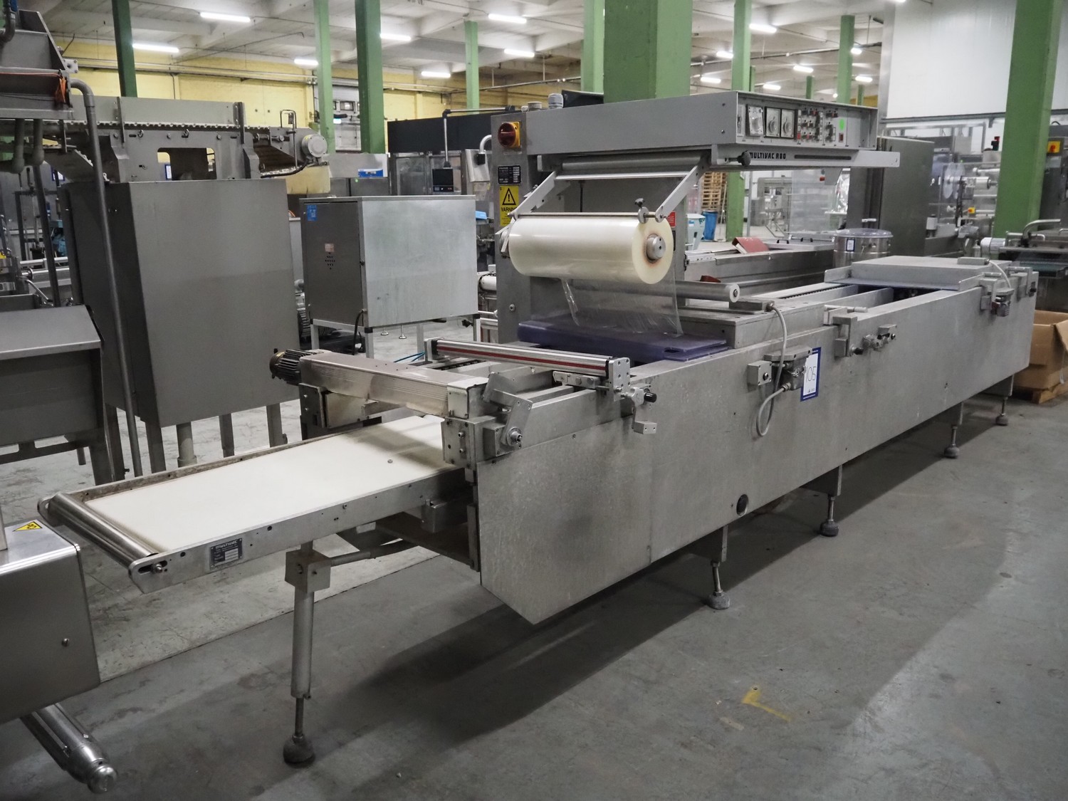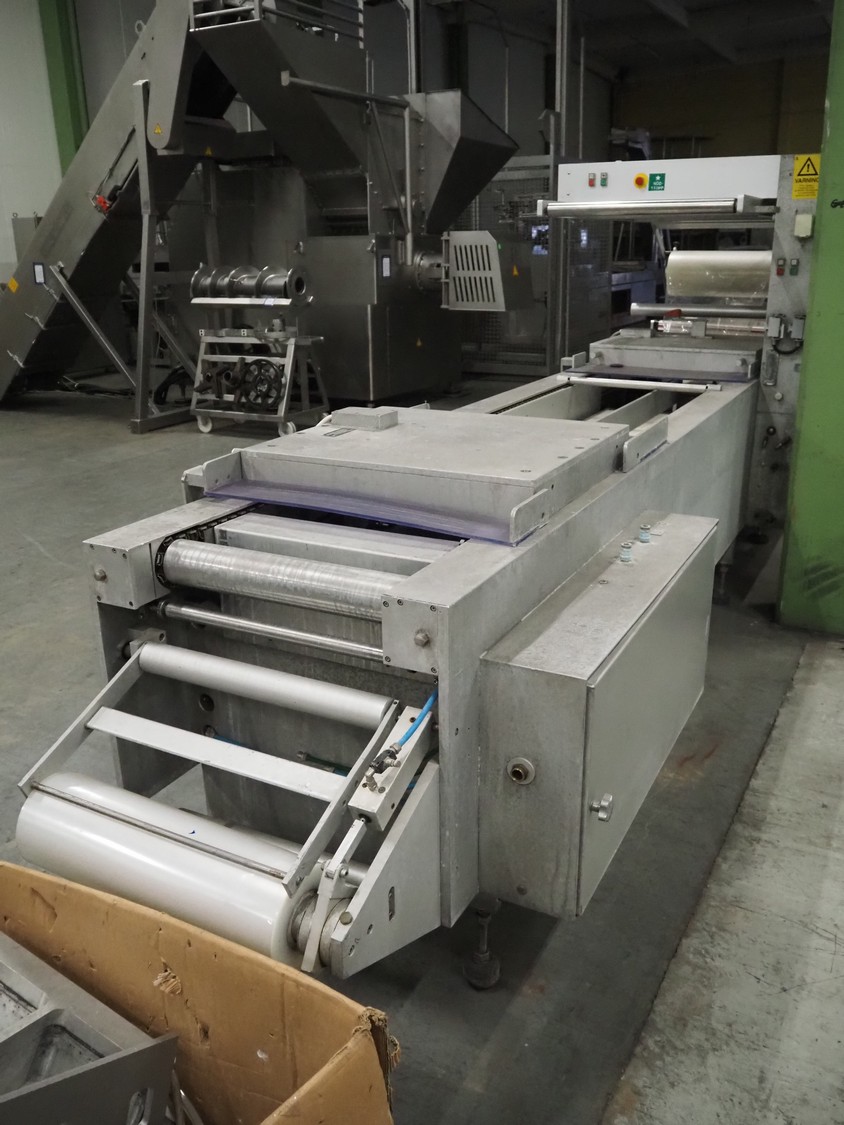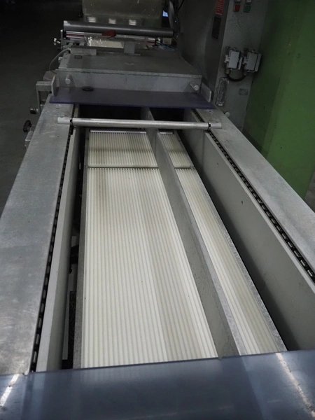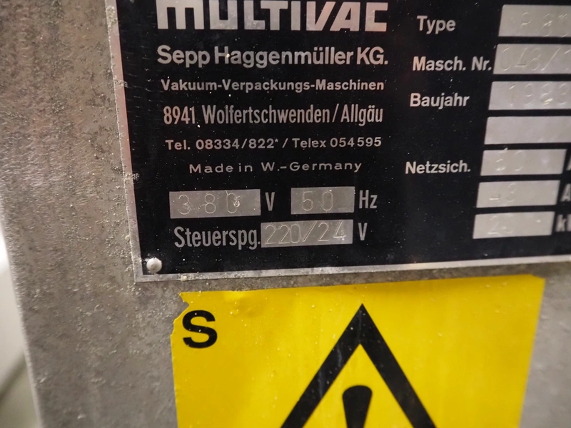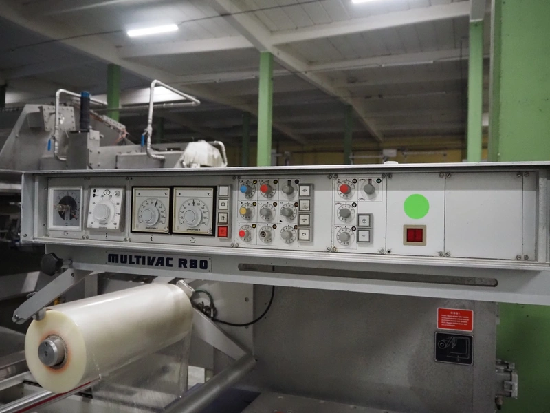 Multivac thermoformer, type: R 80, machine number: 048/114, year of construction: 1983, 380 V, 50 Hz, 43 A, 20 kW, film width: 545 mm, dimensions dye: 183 mm x 577 mm and 298 mm x 577 mm, index: 625 mm, top film width: 420 mm, total dimensions: 5800 mm x 1100 mm x 1800 mm.