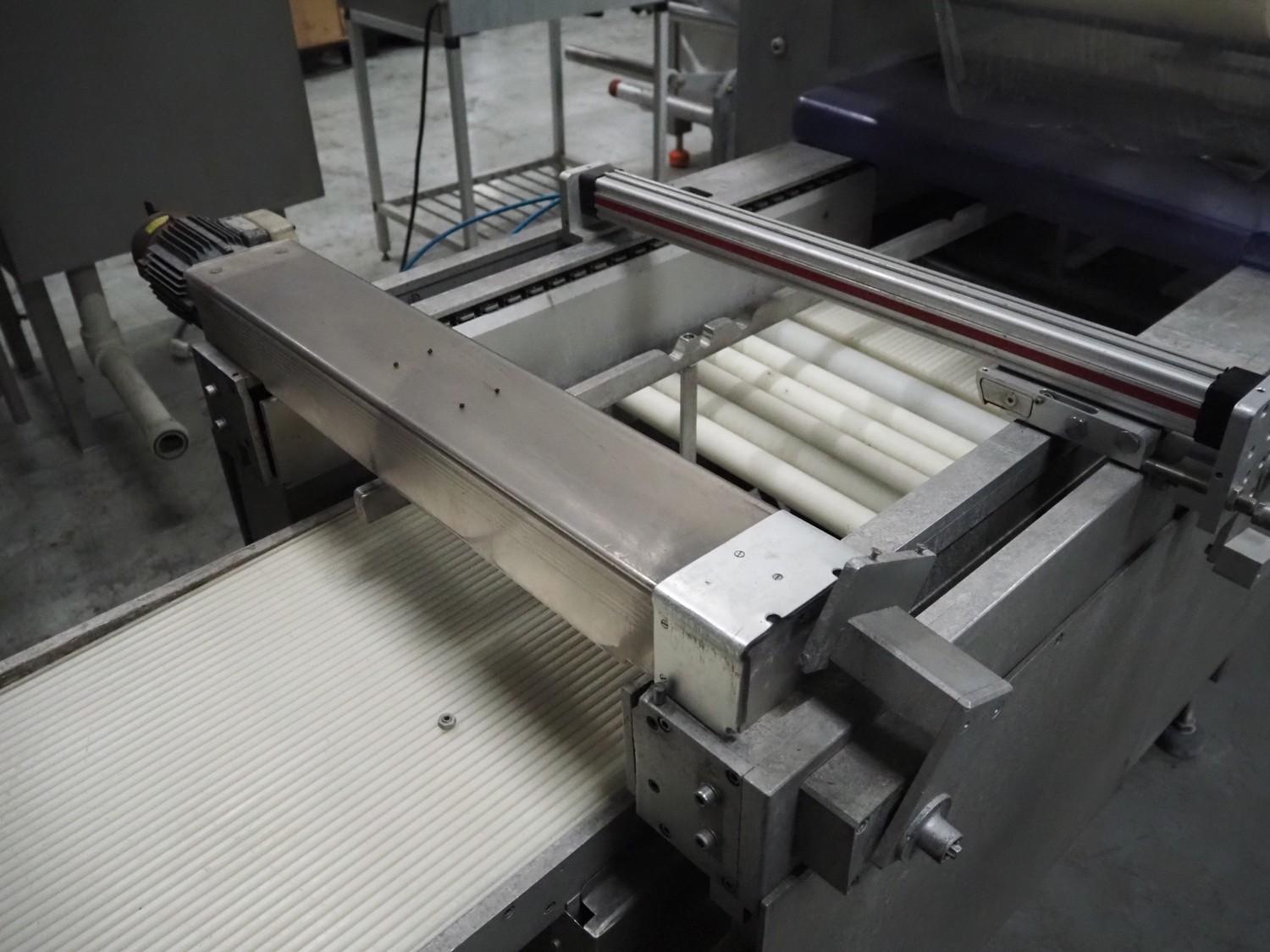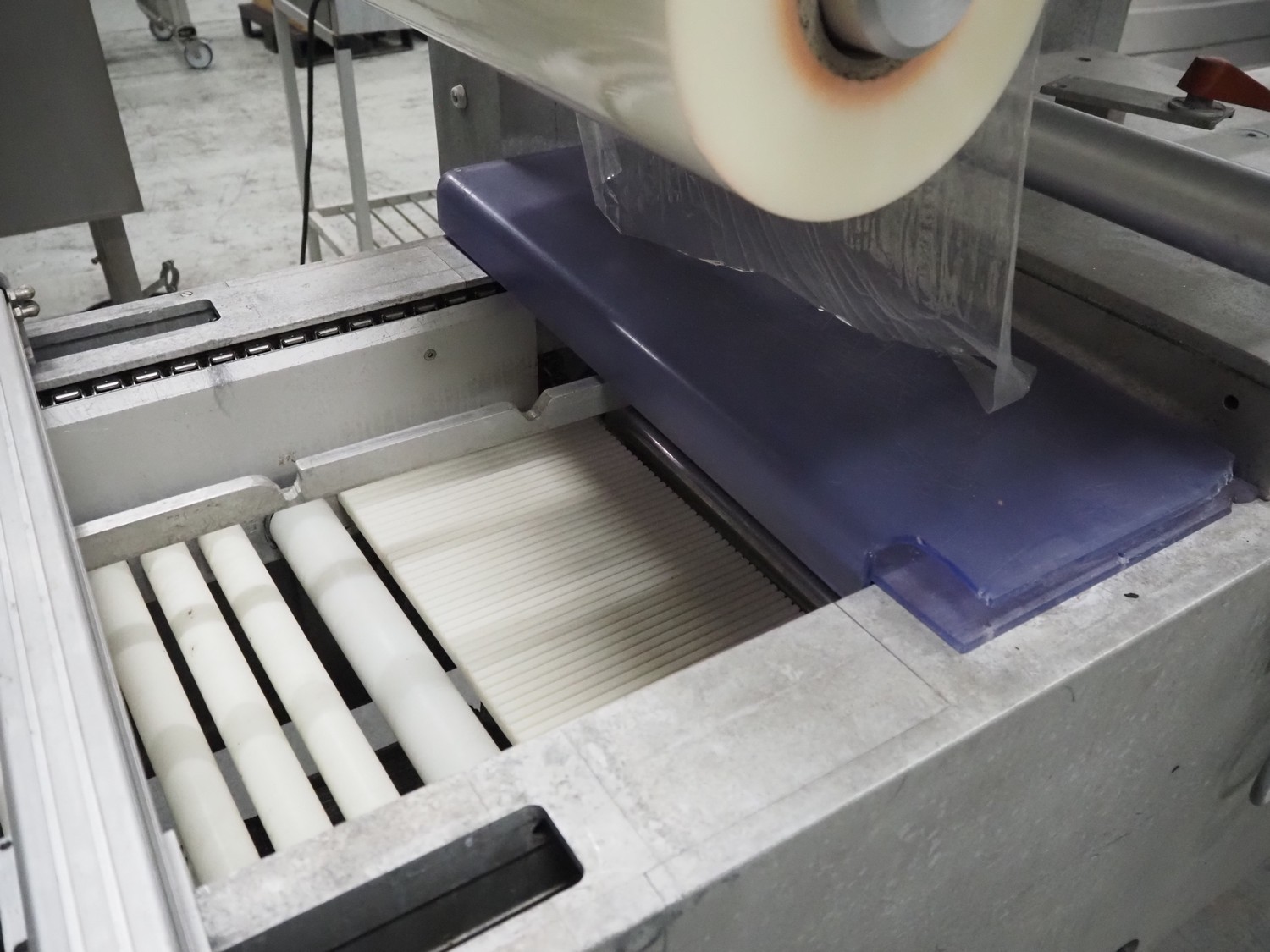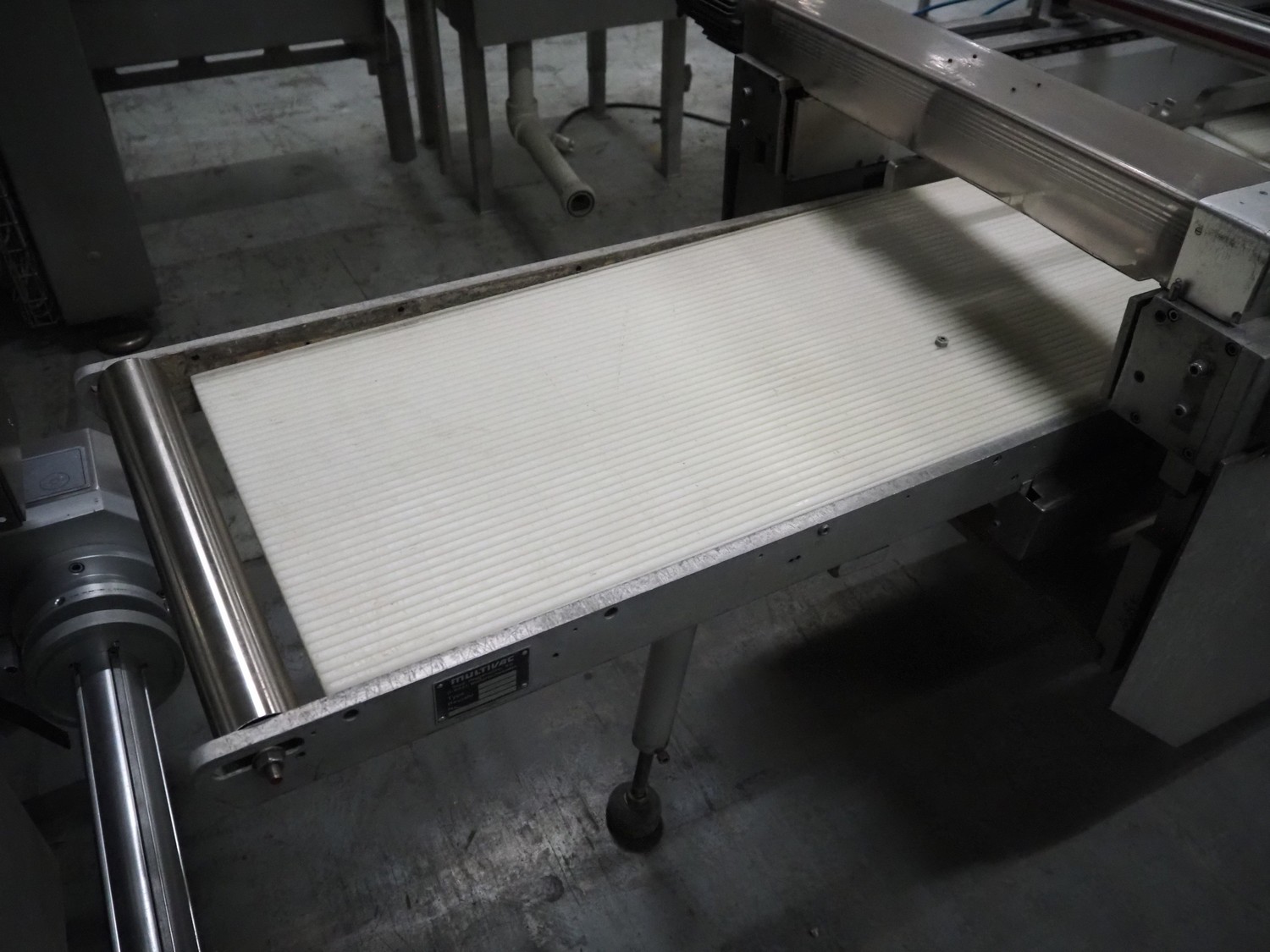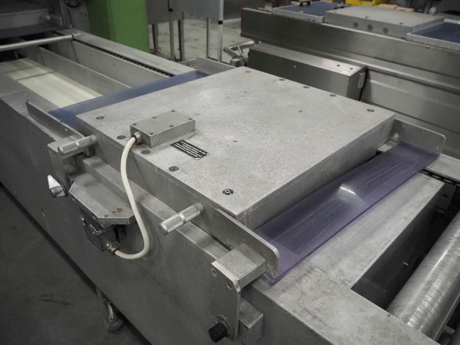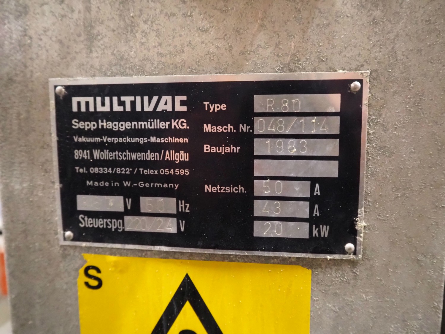 Multivac thermoformer, type: R 80, machine number: 048/114, year of construction: 1983, 380 V, 50 Hz, 43 A, 20 kW, film width: 545 mm, dimensions dye: 183 mm x 577 mm and 298 mm x 577 mm, index: 625 mm, top film width: 420 mm, total dimensions: 5800 mm x 1100 mm x 1800 mm.