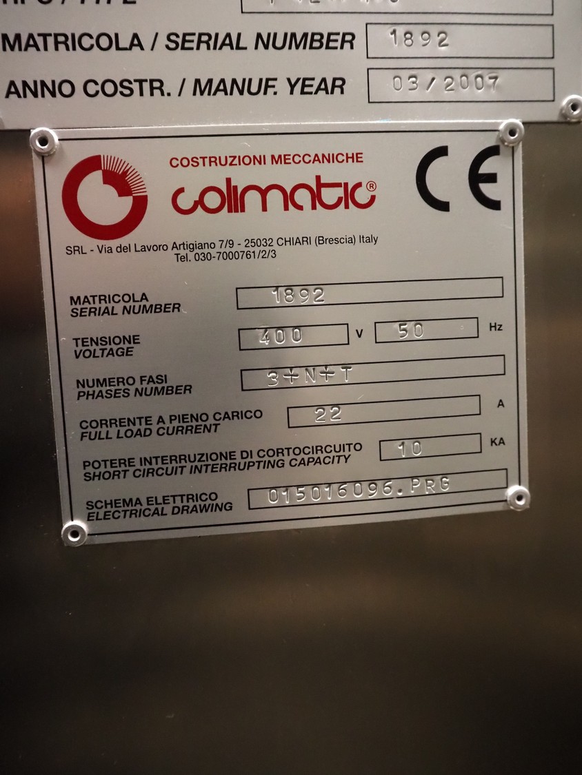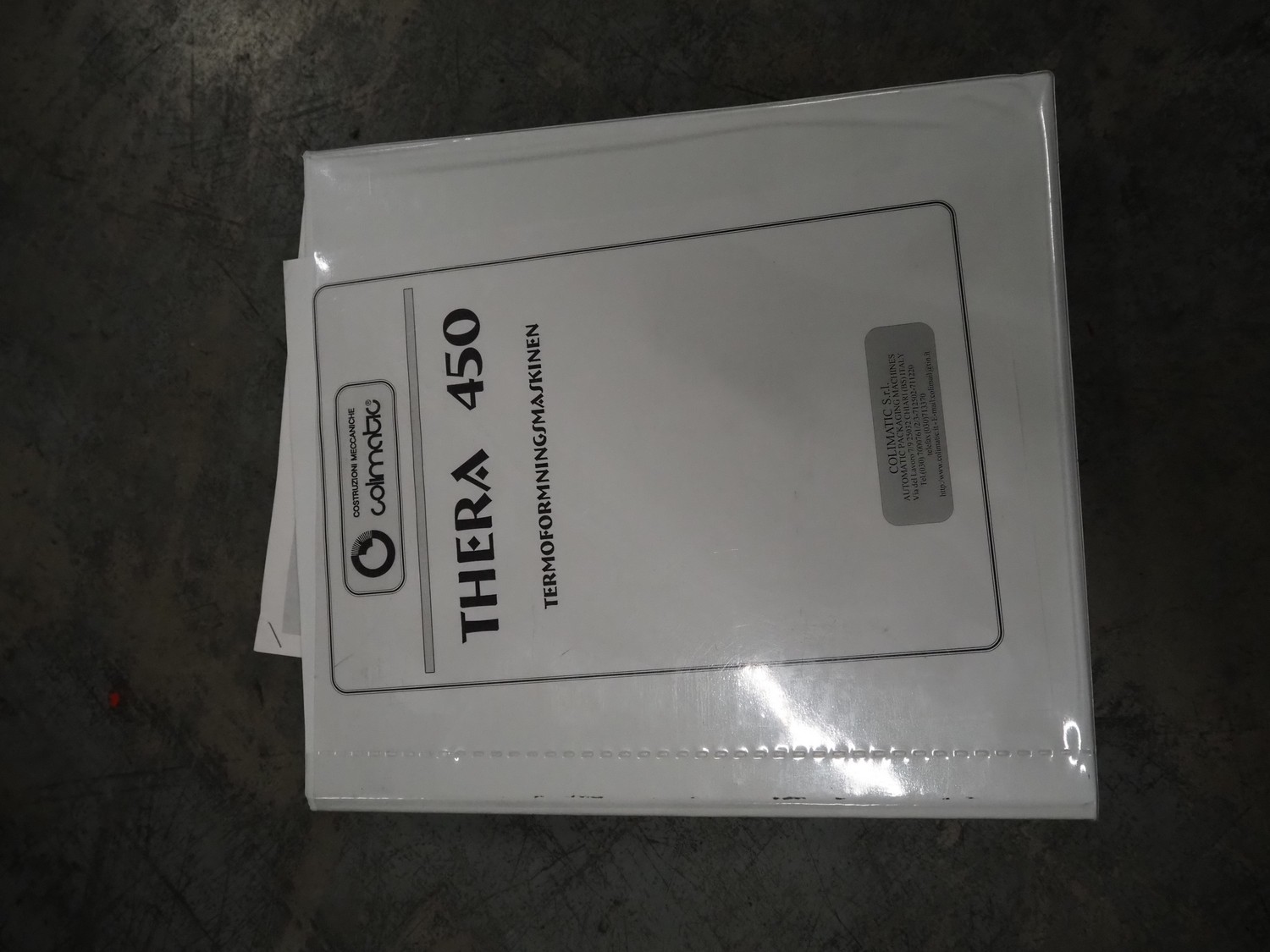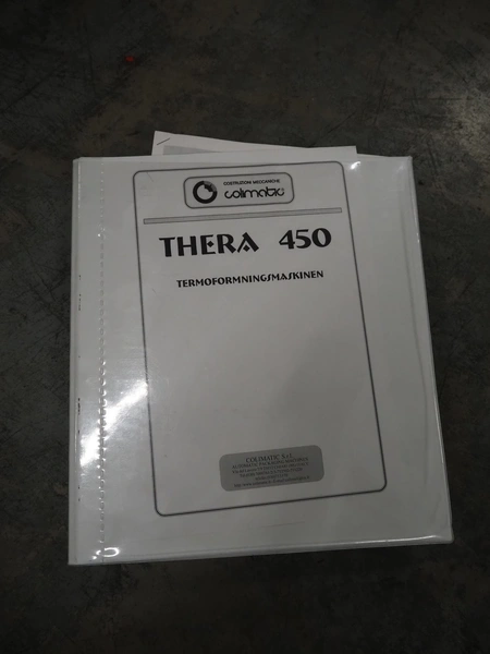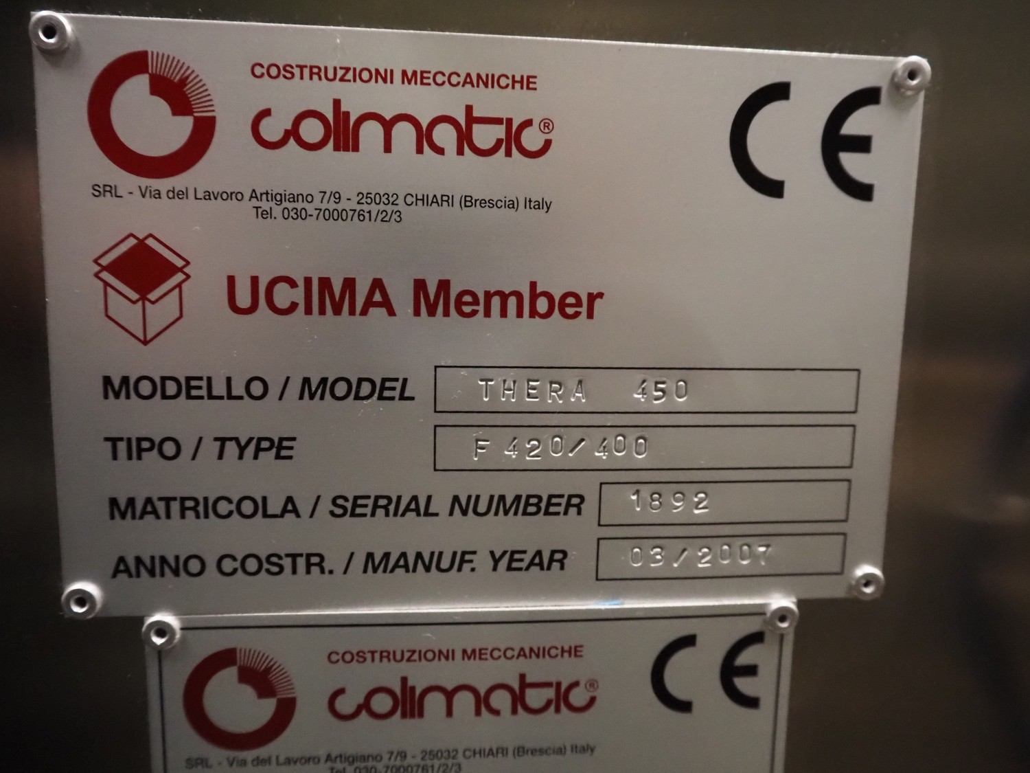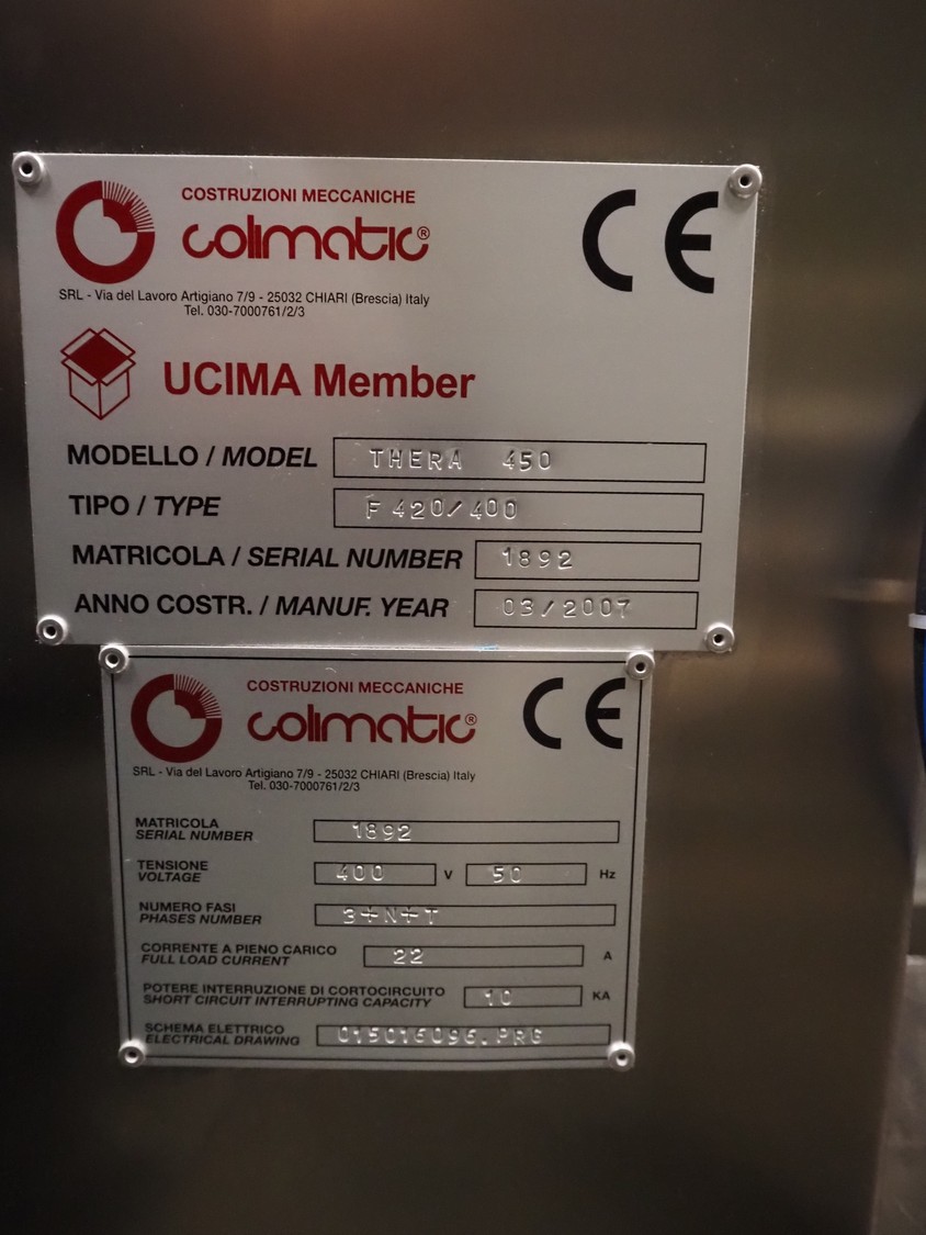 Colimatic thermoformer, model: Thera 450, type: F420/400, serial number: 1892, year of construction: 03/2007, 400 V, 3 Ph, 50 Hz, 22 A, index: 410 mm, estimated film width: 420 mm, dimensions dye: 410 mm x 180 mm, plastic outfeed belt, belt width: 380 mm, total dimensions: 4600 mm x 1100 mm x 1920 mm. Including Rietschle vacuum pump, type: VC 150 (20), number: 1026522059, capacity: 150 m³/h, dimensions: 720 mm x 440 mm x 340 mm.