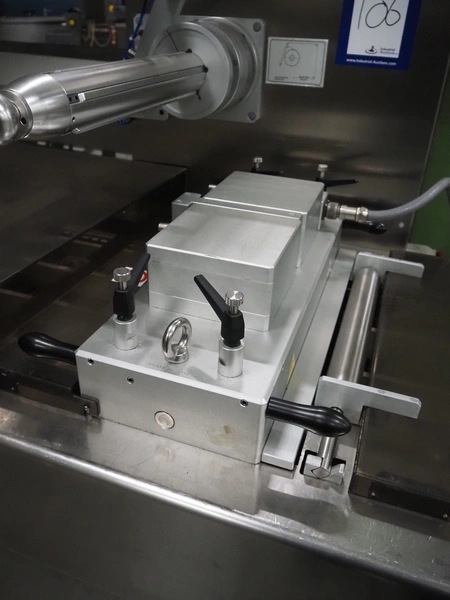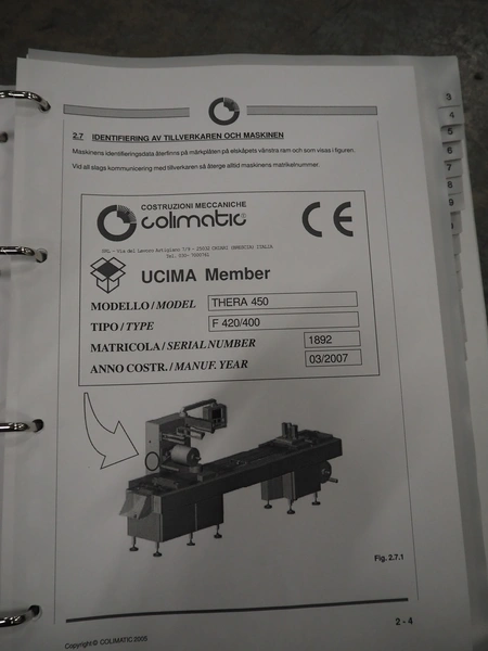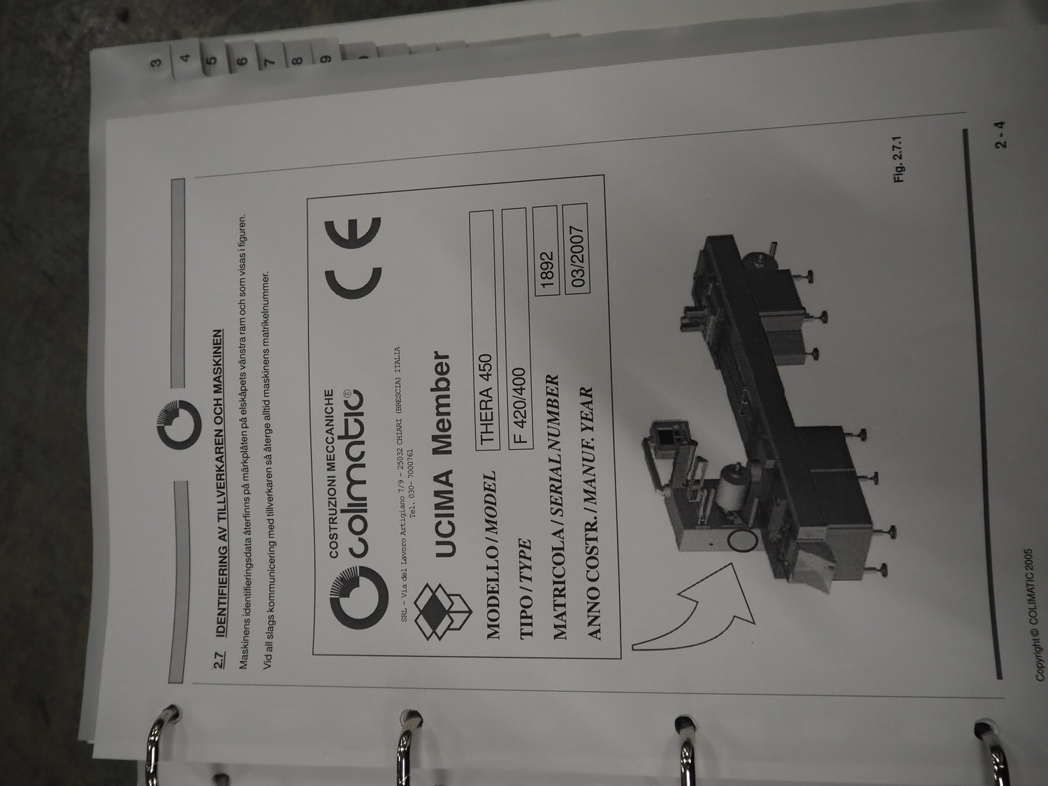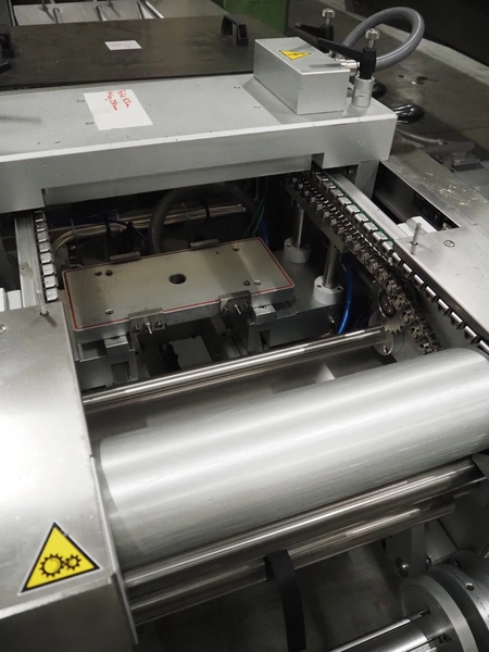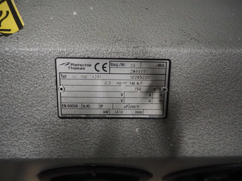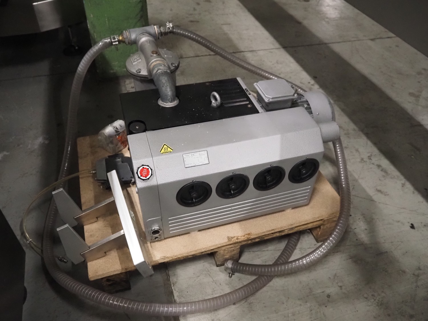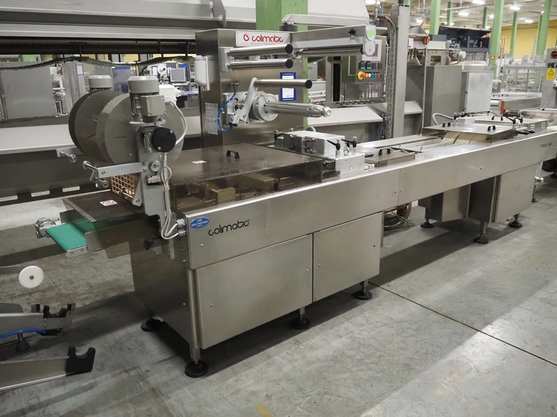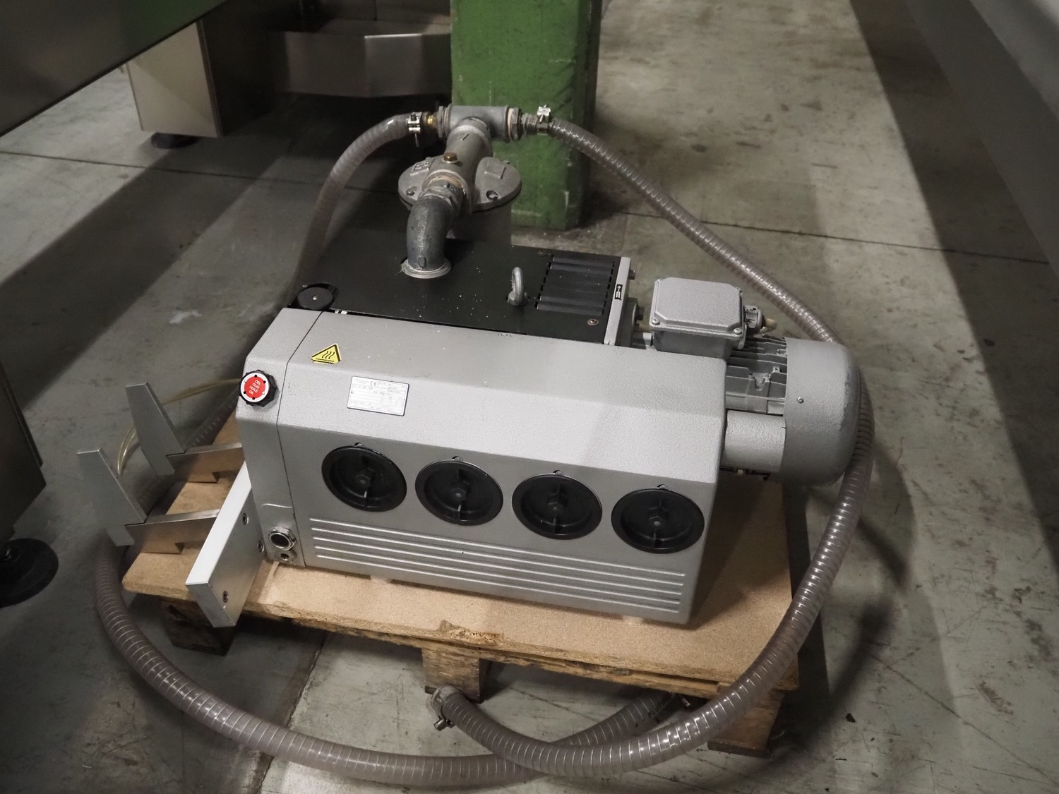 Colimatic thermoformer, model: Thera 450, type: F420/400, serial number: 1892, year of construction: 03/2007, 400 V, 3 Ph, 50 Hz, 22 A, index: 410 mm, estimated film width: 420 mm, dimensions dye: 410 mm x 180 mm, plastic outfeed belt, belt width: 380 mm, total dimensions: 4600 mm x 1100 mm x 1920 mm. Including Rietschle vacuum pump, type: VC 150 (20), number: 1026522059, capacity: 150 m³/h, dimensions: 720 mm x 440 mm x 340 mm.