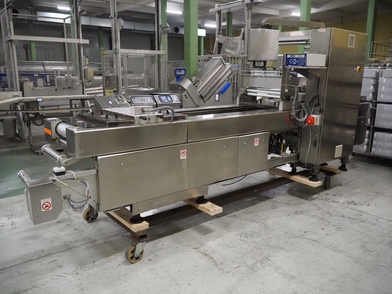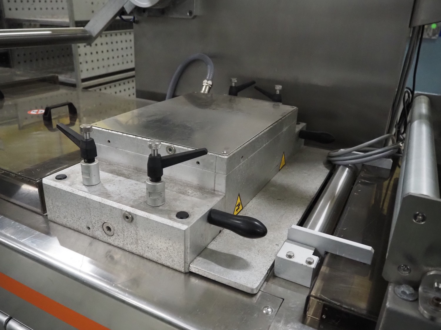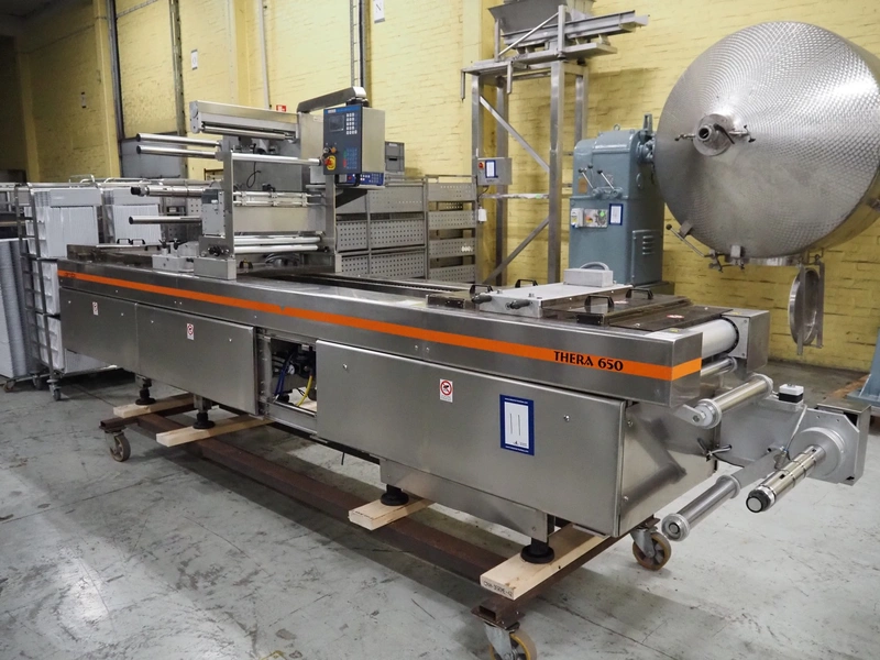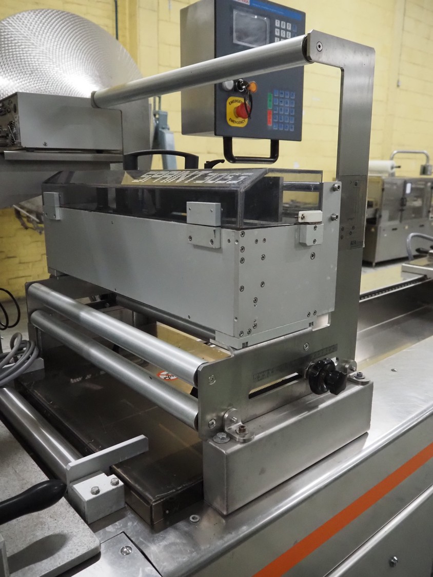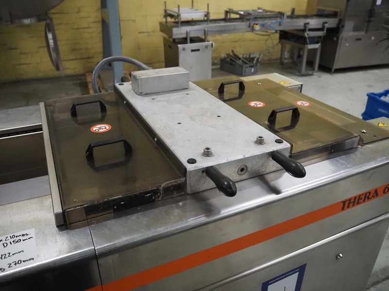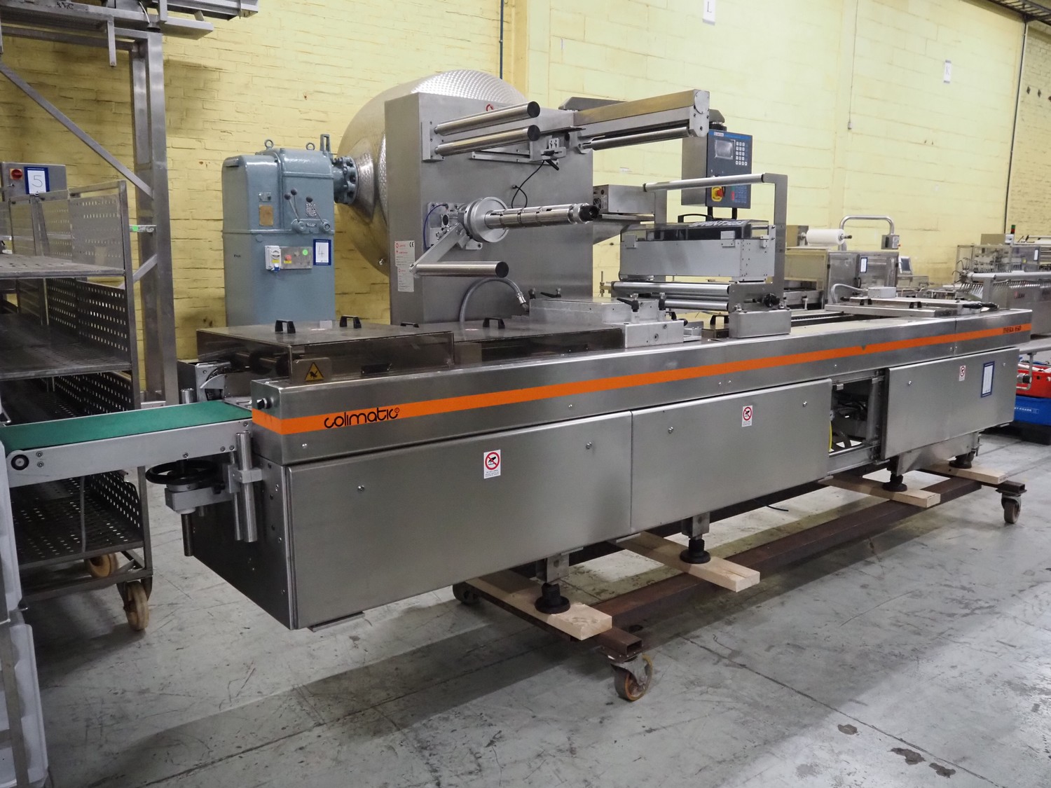 Colimatic thermoformer, model: THERA 650, type: F 420, serial number: 1608, year of construction: 03/2000, 380 V, 3 Ph, 50 Hz, 32 A, plastic belt, belt width: 350 mm, dyes: (1x) 405 mm x 230 mm, index: 310 mm, total dimensions: 5650 mm x 1100 mm x 1950 mm.