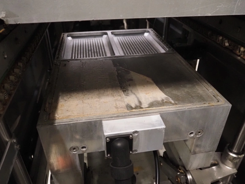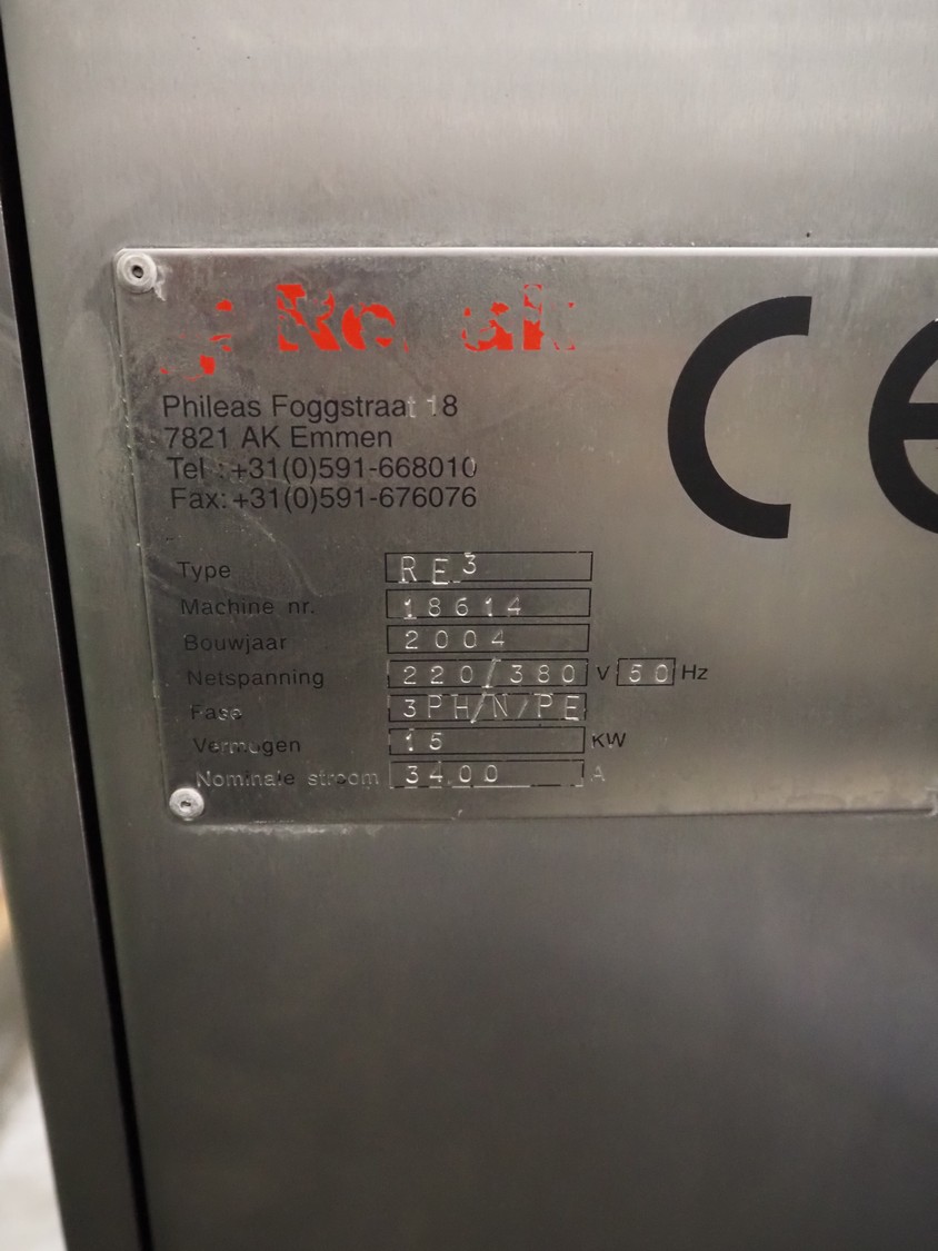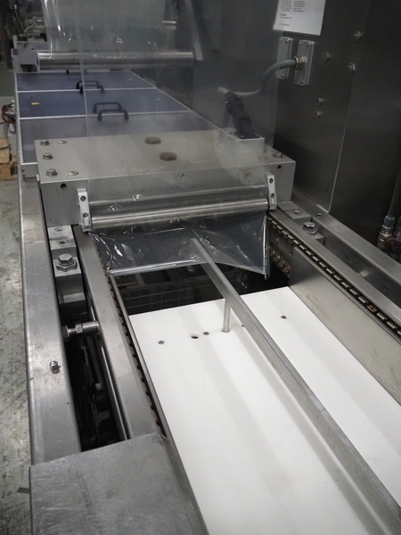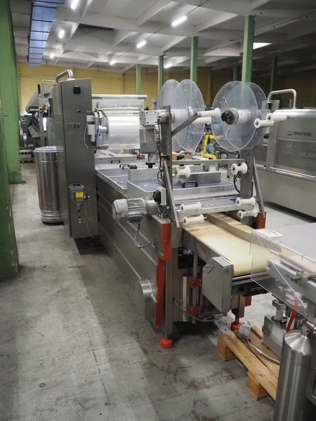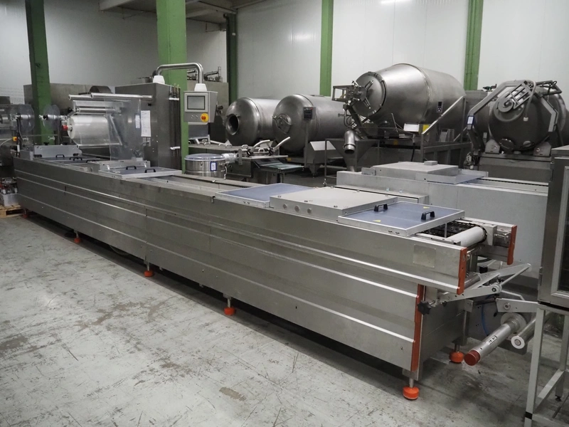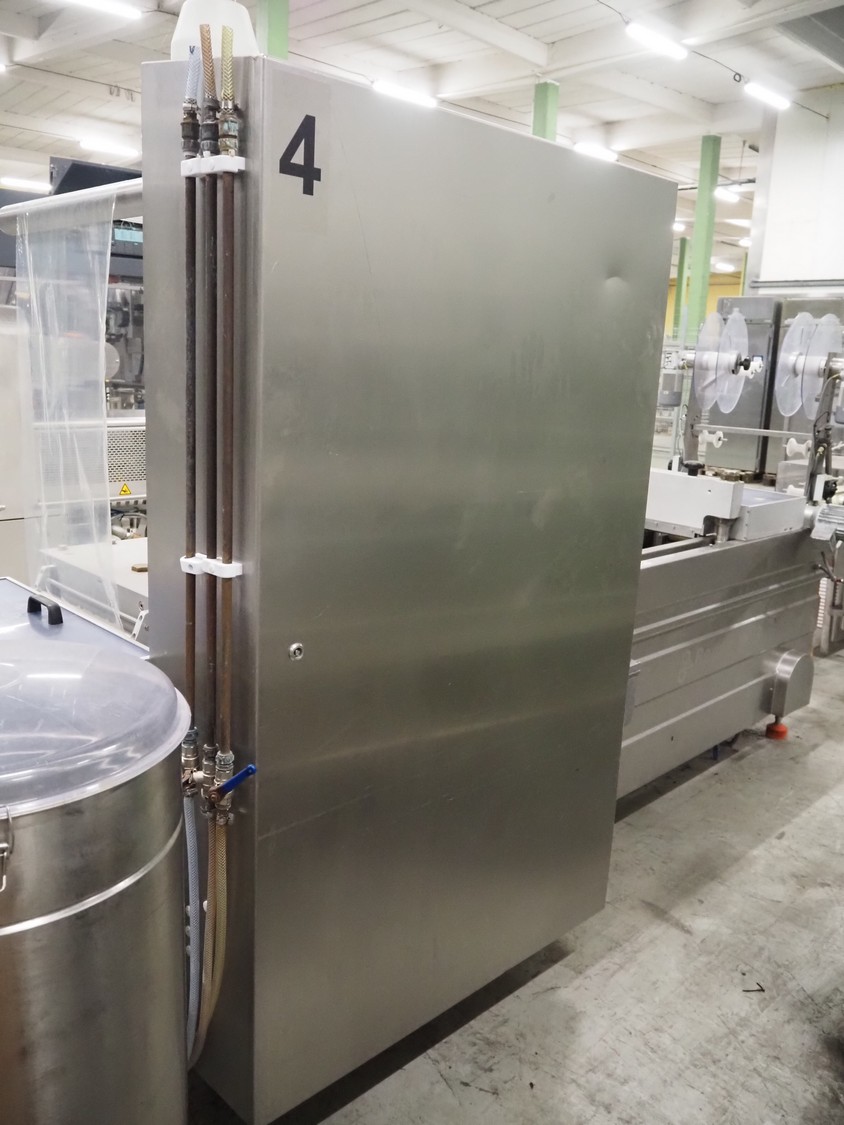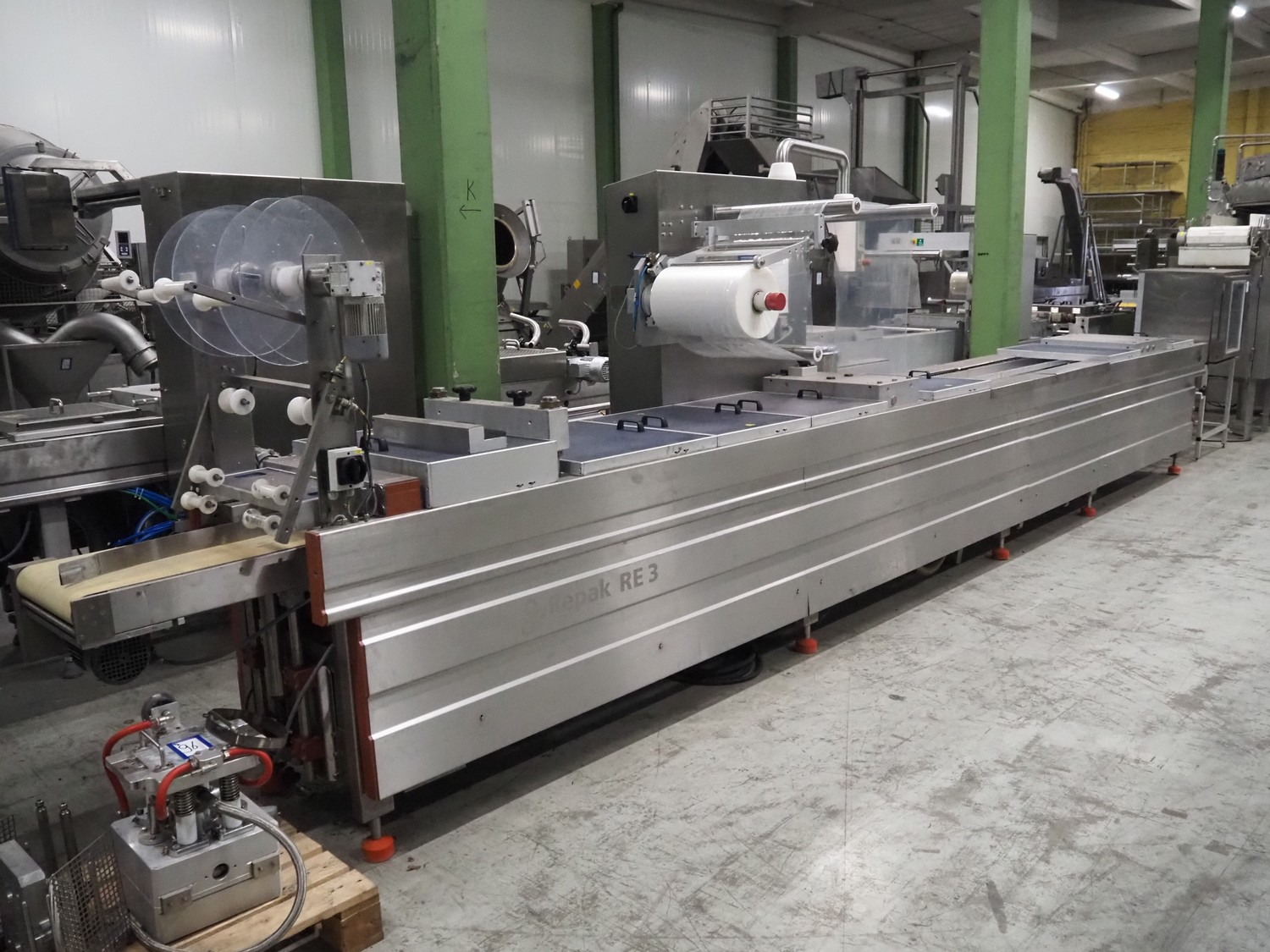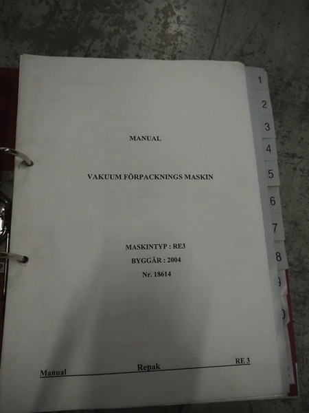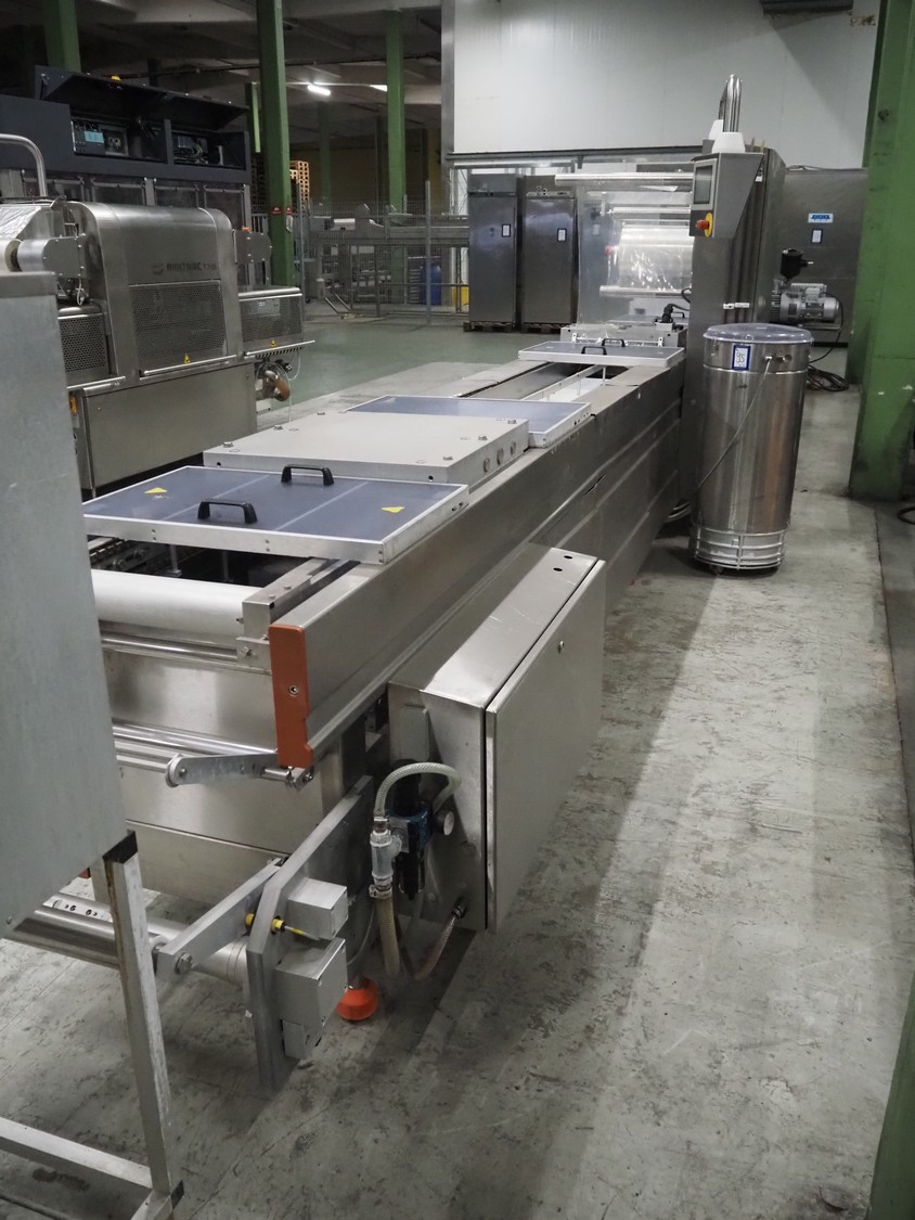 Repak thermoformer, type: RE3, machine number: 18614, year of construction: 2004, 220/380 V, 3 Ph, 50 Hz, 34 A, 15 kW, film width: 420 mm, dye: (2x) 290 mm x 180 mm, plastic outfeed belt, belt width: 380 mm, Busch vacuum pump, type vacuum pump: CB 02350 B, number: 04002605, year of construction: 2004, capacity: 250 m³/h, total dimensions: 7800 mm x 1020 mm x 2100 mm. Including suction device, dimensions: Ø 410 mm x 1110 mm.