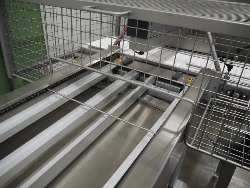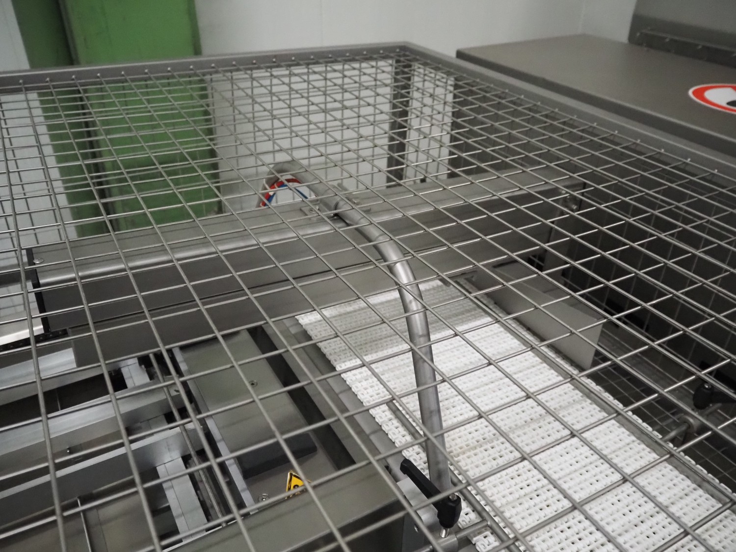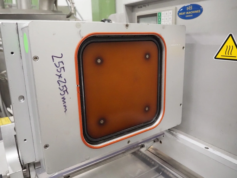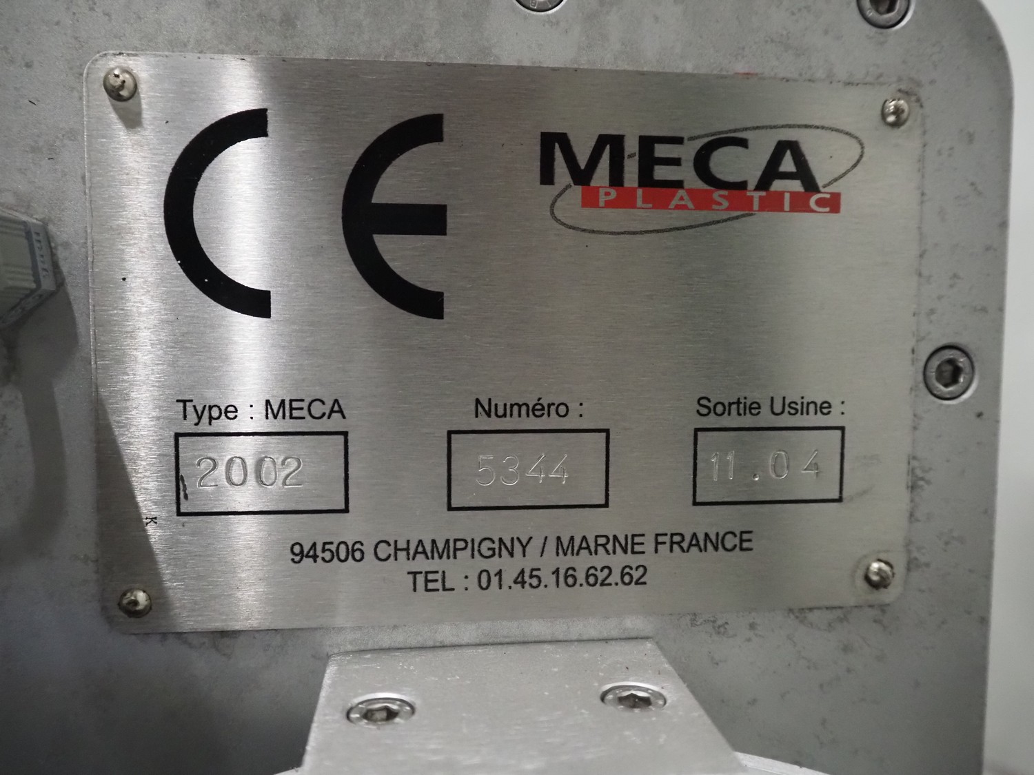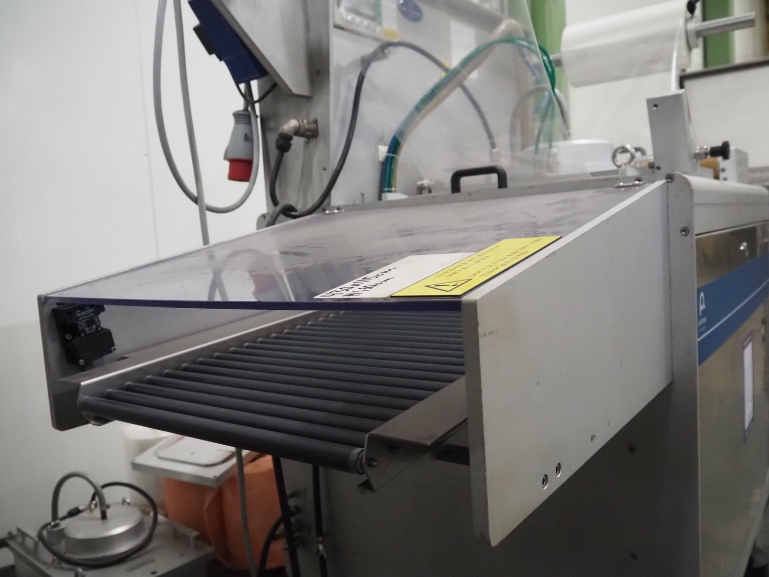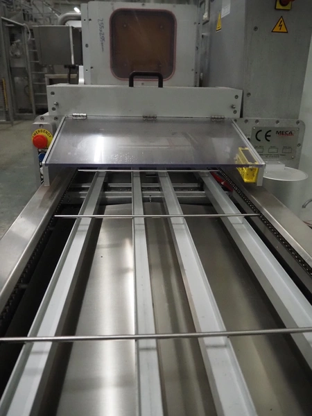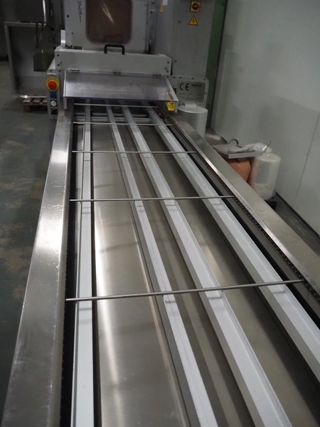 Meca Plastic traysealer with infeed belt, type: MECA 2002, number: 5344, year of construction: 11/2004, plastic infeed belt, belt width: 300 mm, infeed chain with dividers, distance between dividers: 340 mm, film width: 310 mm, dye: 255 mm x 255 mm, plastic outfeed rollers, roller width: 410 mm, Busch vacuum pump, type: RA 0160 D 561 QLXX, capacity: 160 m³ per hour, total dimensions: 4350 mm x 850 mm x 1950 mm.