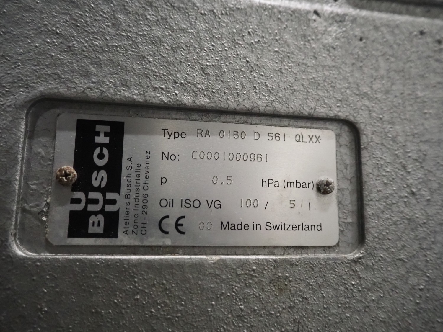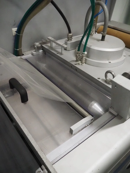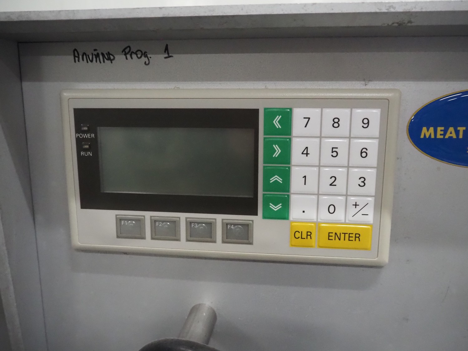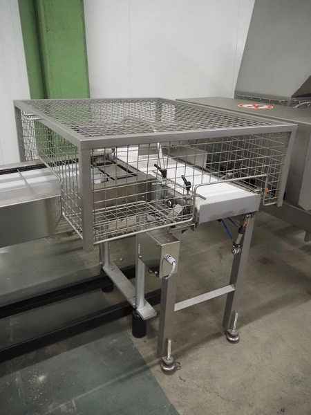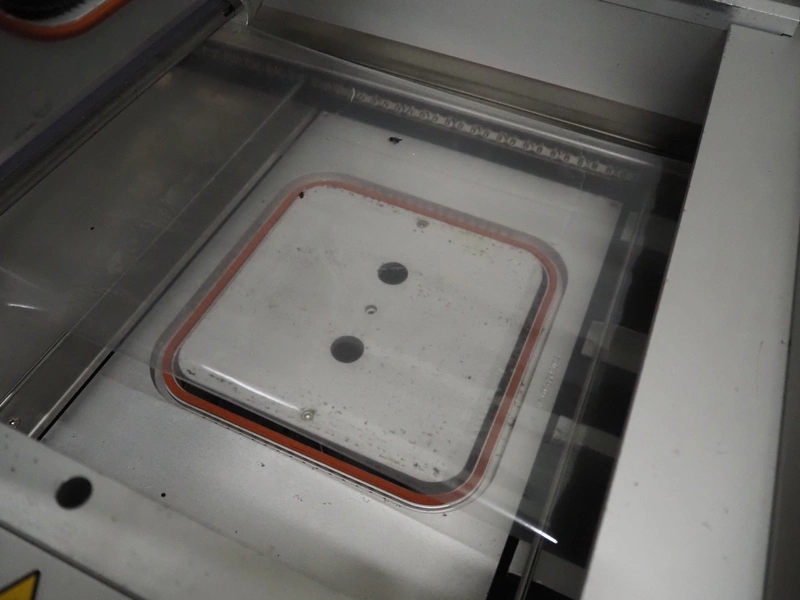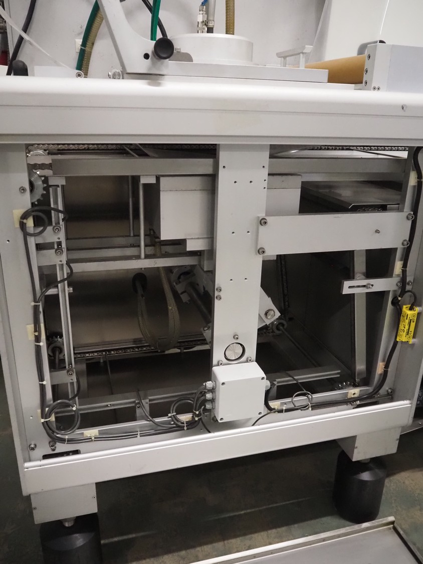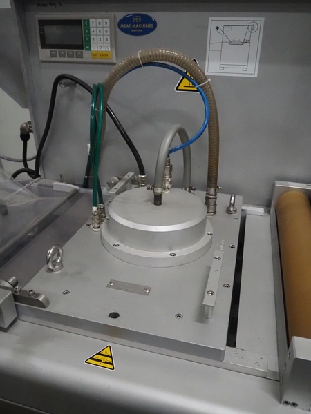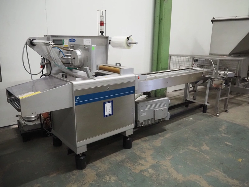Meca Plastic traysealer with infeed belt, type: MECA 2002, number: 5344, year of construction: 11/2004, plastic infeed belt, belt width: 300 mm, infeed chain with dividers, distance between dividers: 340 mm, film width: 310 mm, dye: 255 mm x 255 mm, plastic outfeed rollers, roller width: 410 mm, Busch vacuum pump, type: RA 0160 D 561 QLXX, capacity: 160 m³ per hour, total dimensions: 4350 mm x 850 mm x 1950 mm.