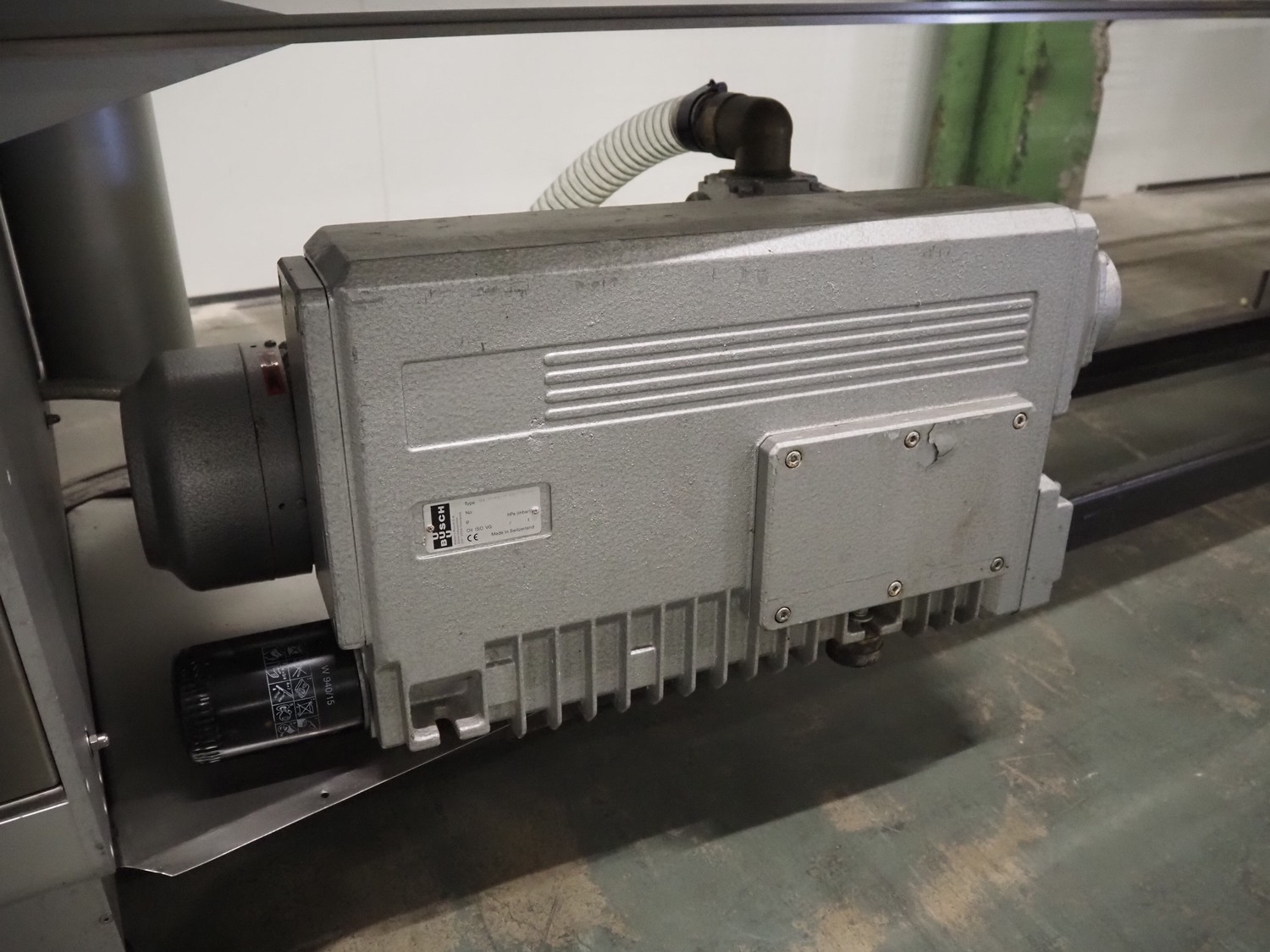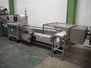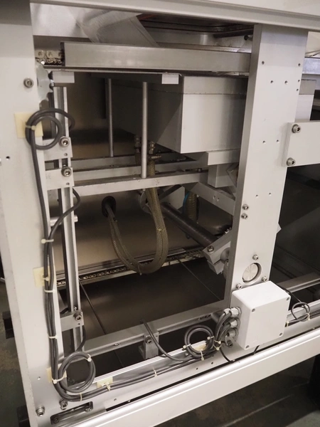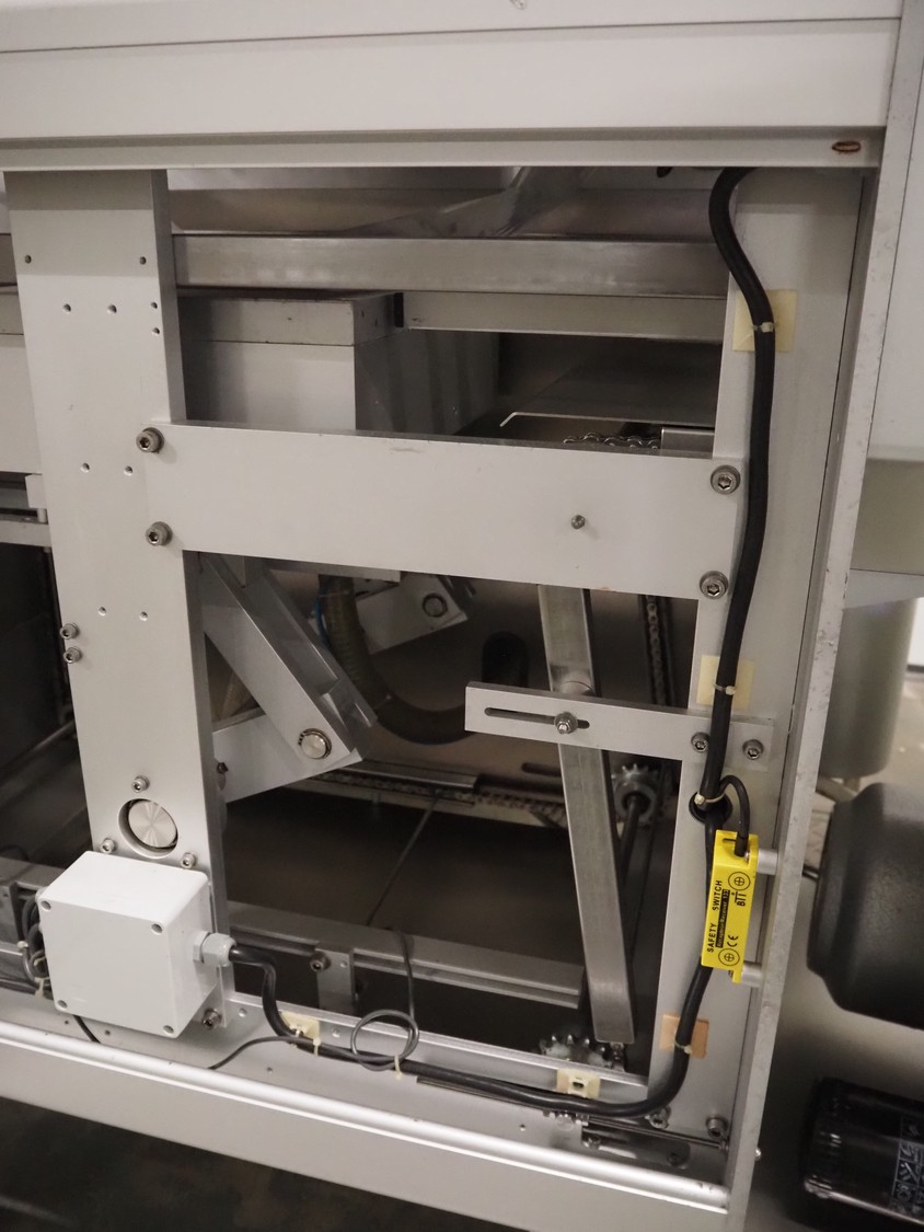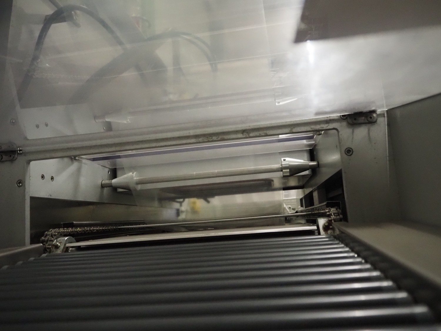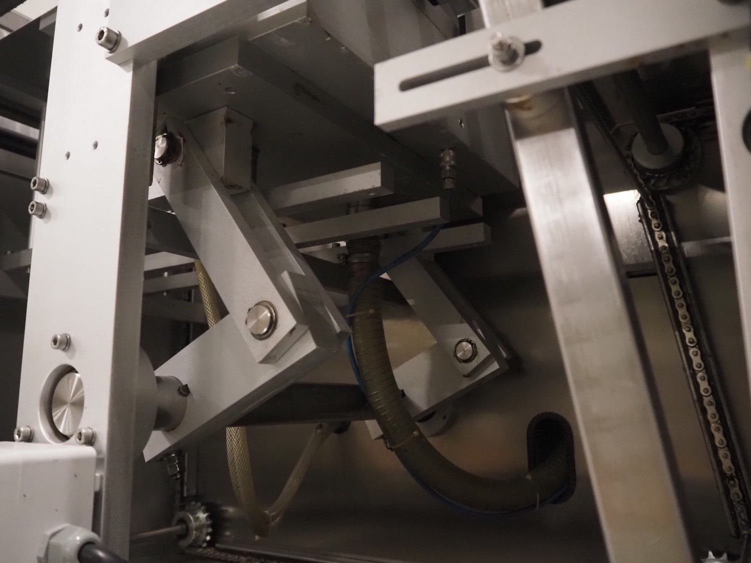 Meca Plastic traysealer with infeed belt, type: MECA 2002, number: 5344, year of construction: 11/2004, plastic infeed belt, belt width: 300 mm, infeed chain with dividers, distance between dividers: 340 mm, film width: 310 mm, dye: 255 mm x 255 mm, plastic outfeed rollers, roller width: 410 mm, Busch vacuum pump, type: RA 0160 D 561 QLXX, capacity: 160 m³ per hour, total dimensions: 4350 mm x 850 mm x 1950 mm.