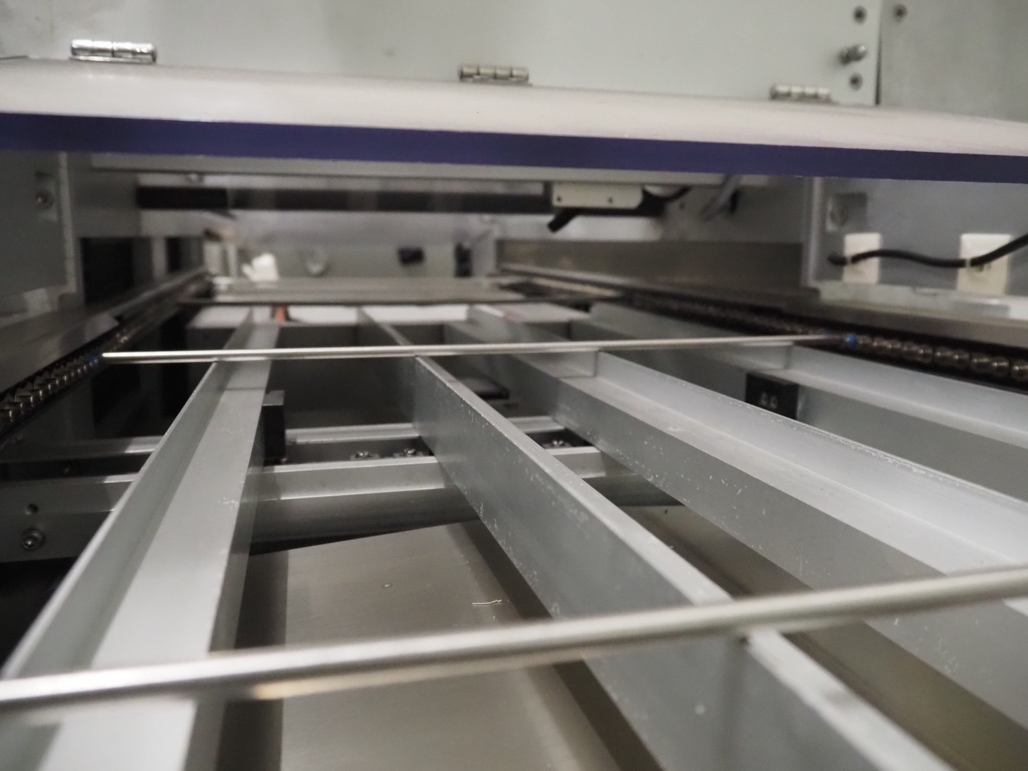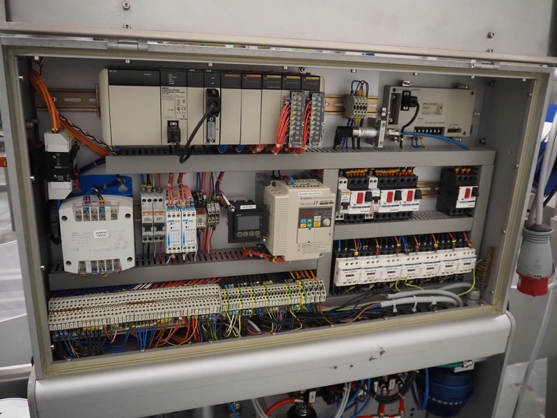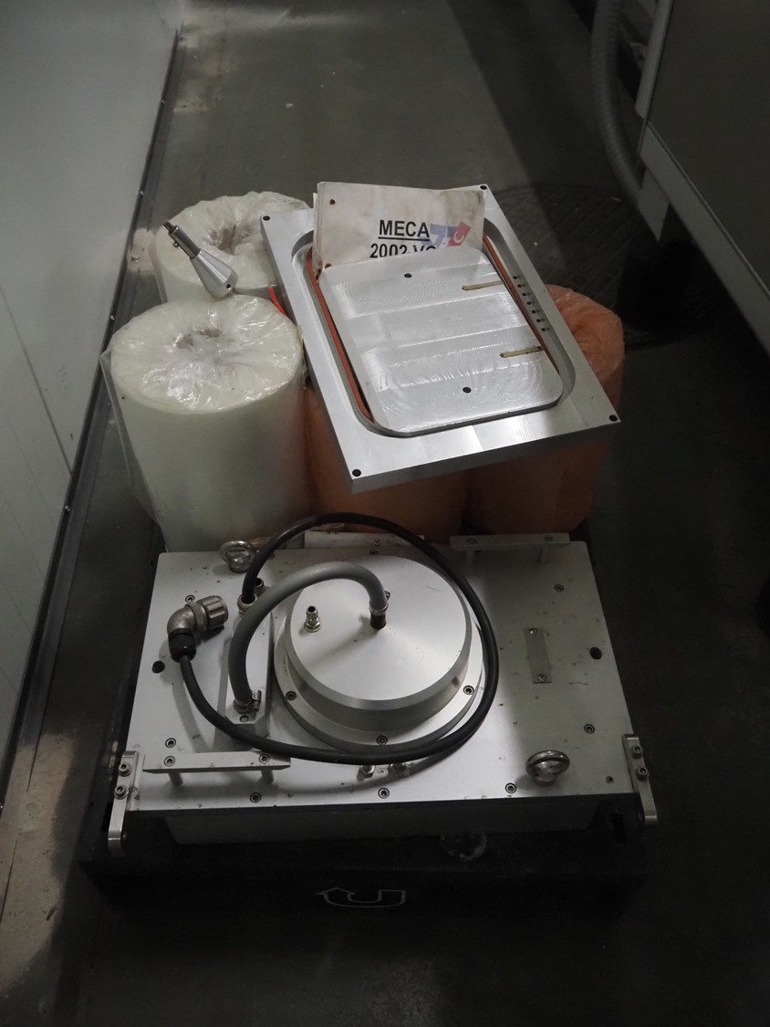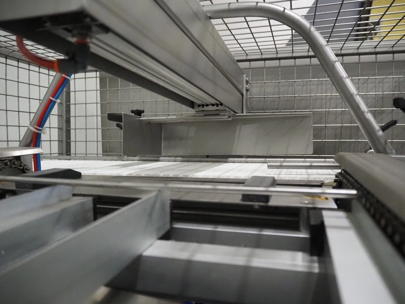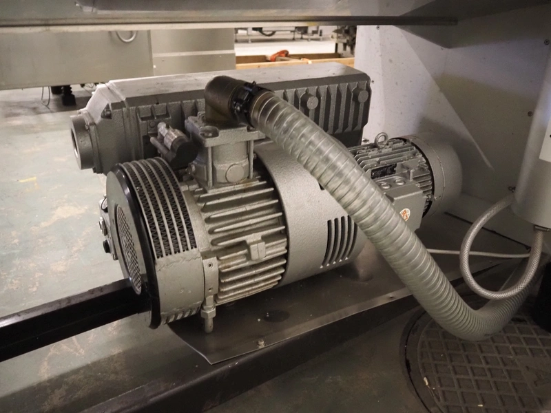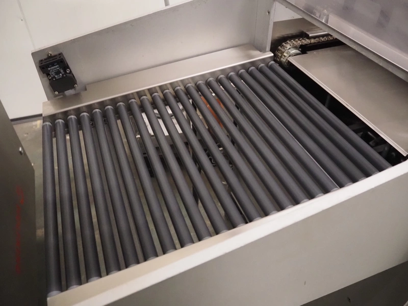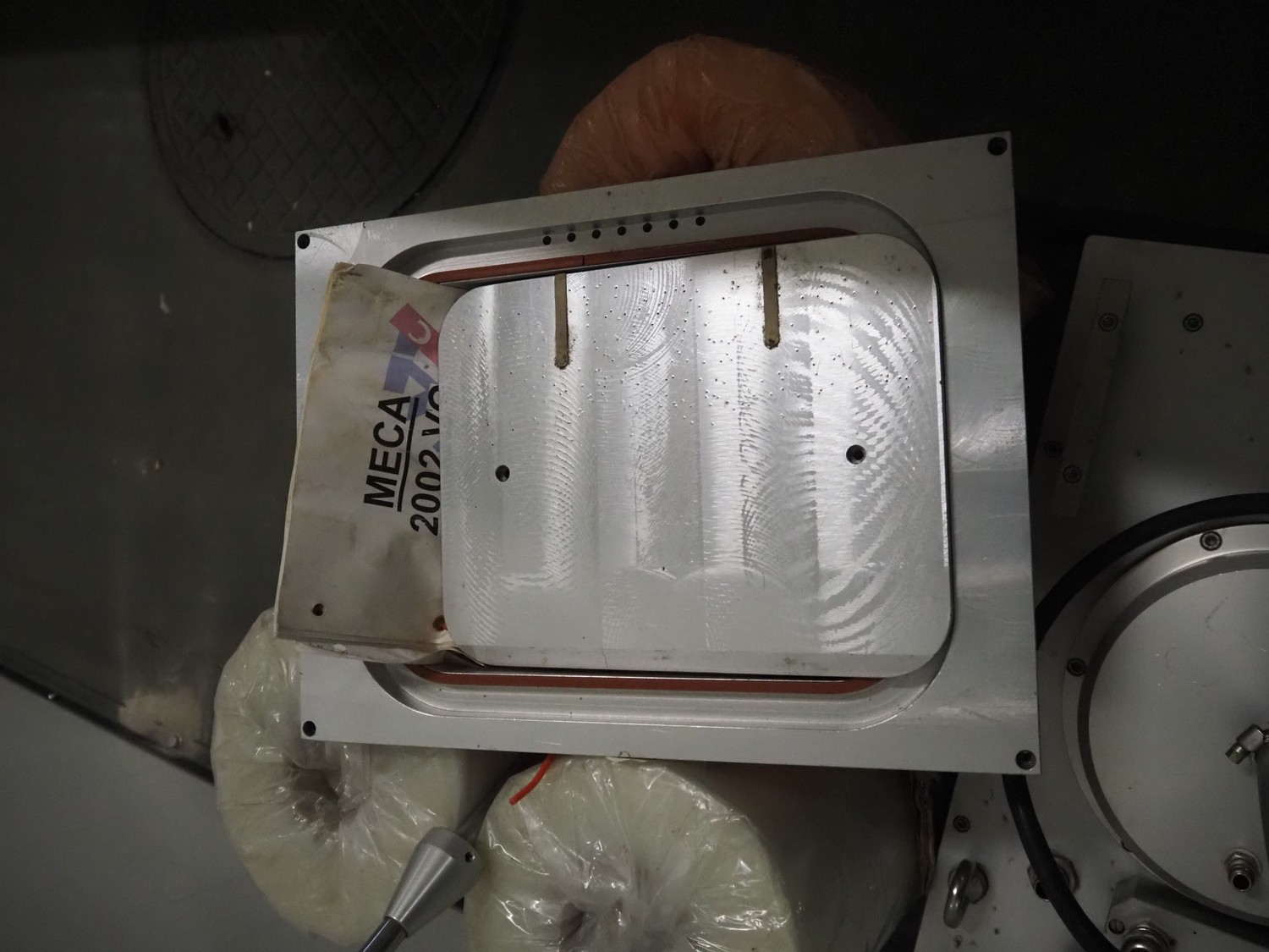Meca Plastic traysealer with infeed belt, type: MECA 2002, number: 5344, year of construction: 11/2004, plastic infeed belt, belt width: 300 mm, infeed chain with dividers, distance between dividers: 340 mm, film width: 310 mm, dye: 255 mm x 255 mm, plastic outfeed rollers, roller width: 410 mm, Busch vacuum pump, type: RA 0160 D 561 QLXX, capacity: 160 m³ per hour, total dimensions: 4350 mm x 850 mm x 1950 mm.