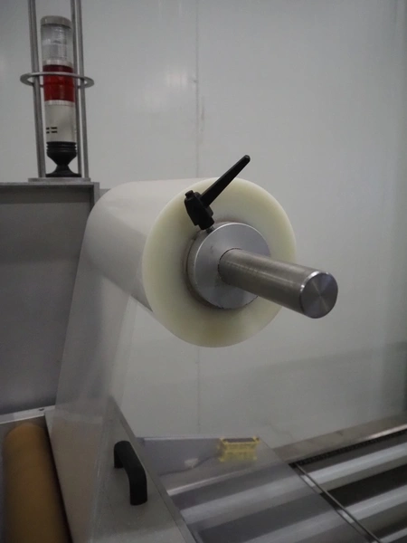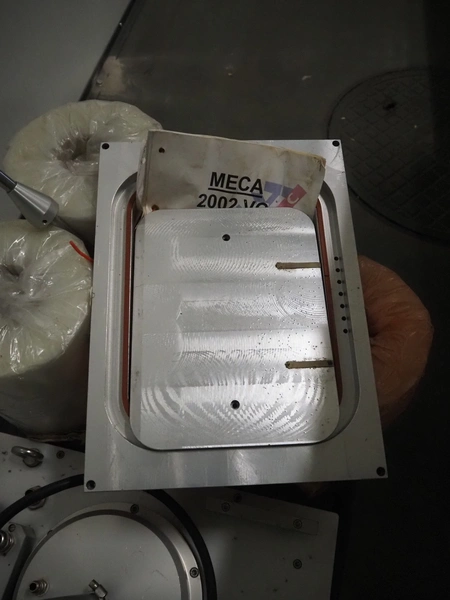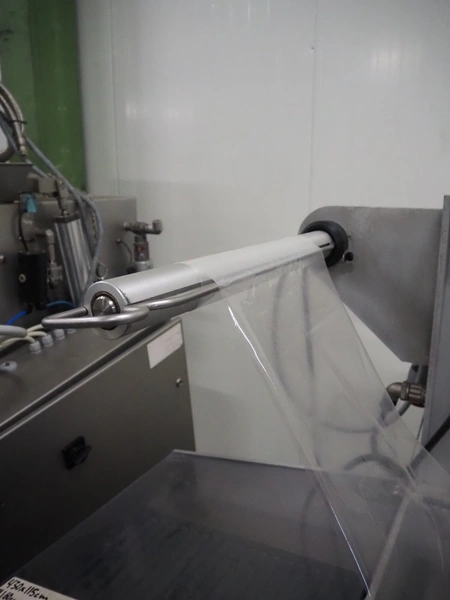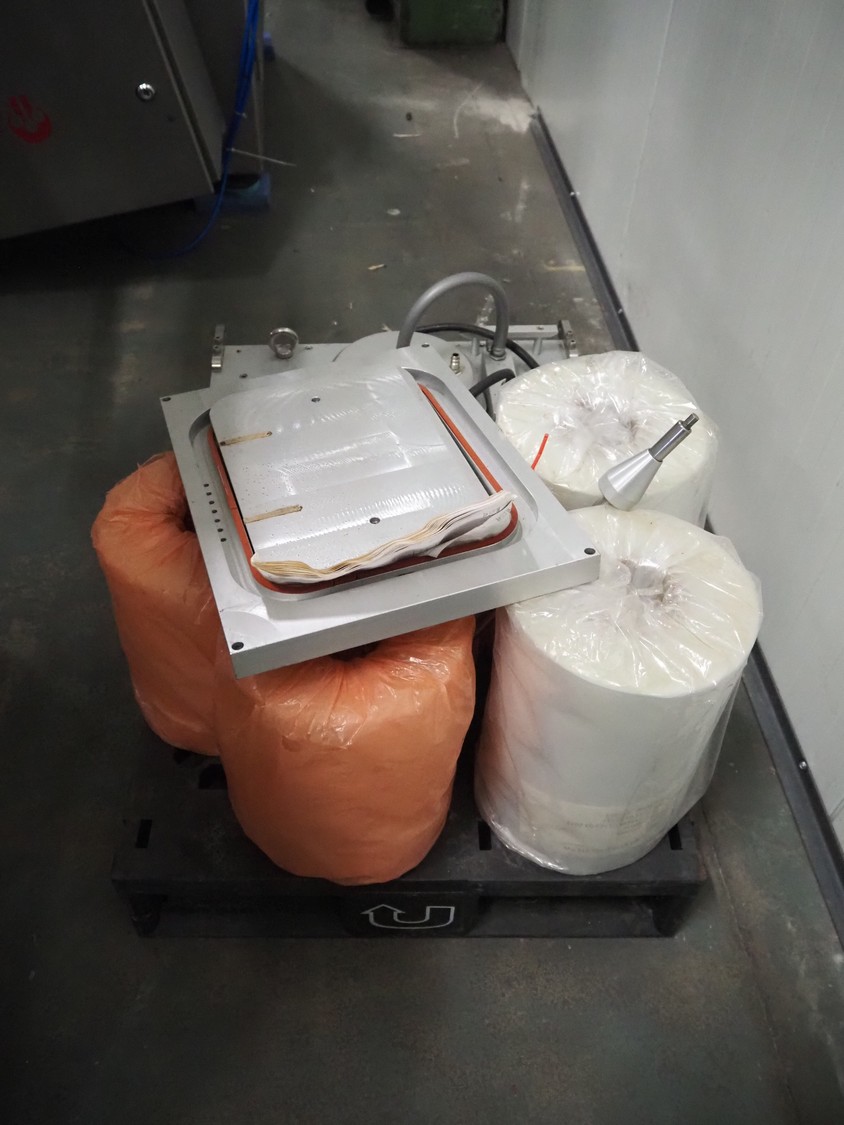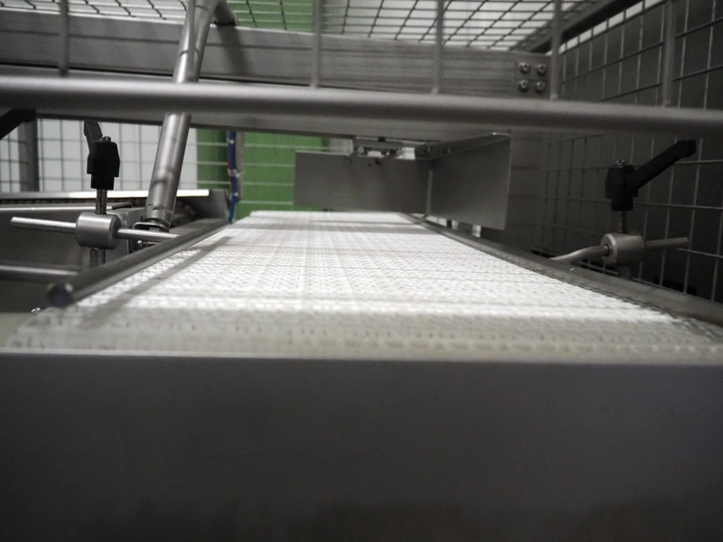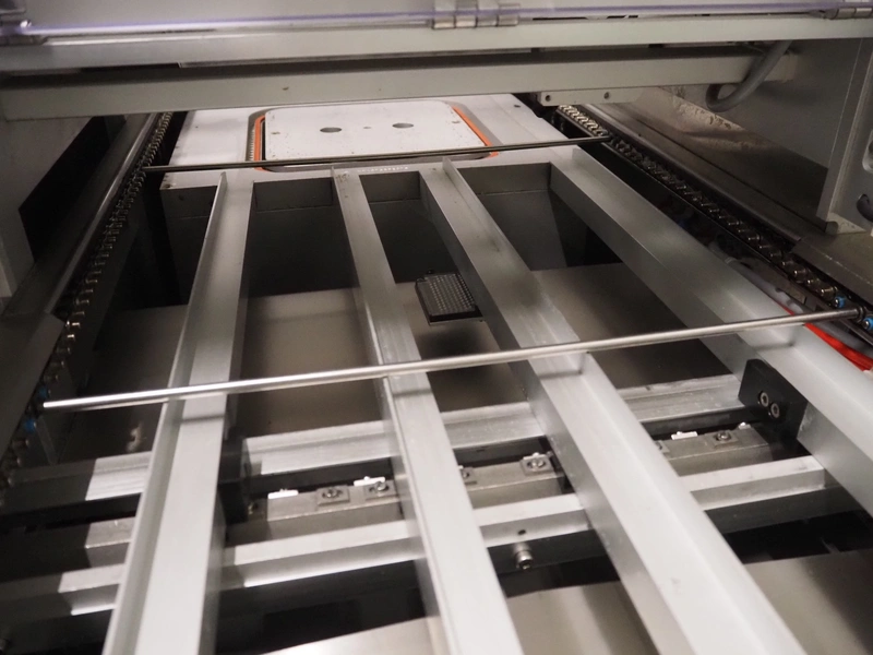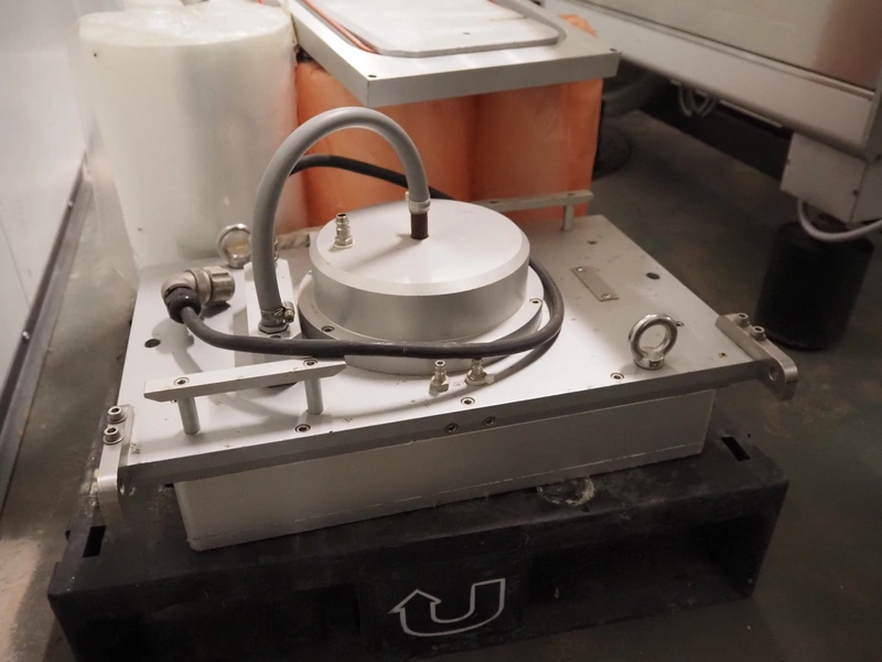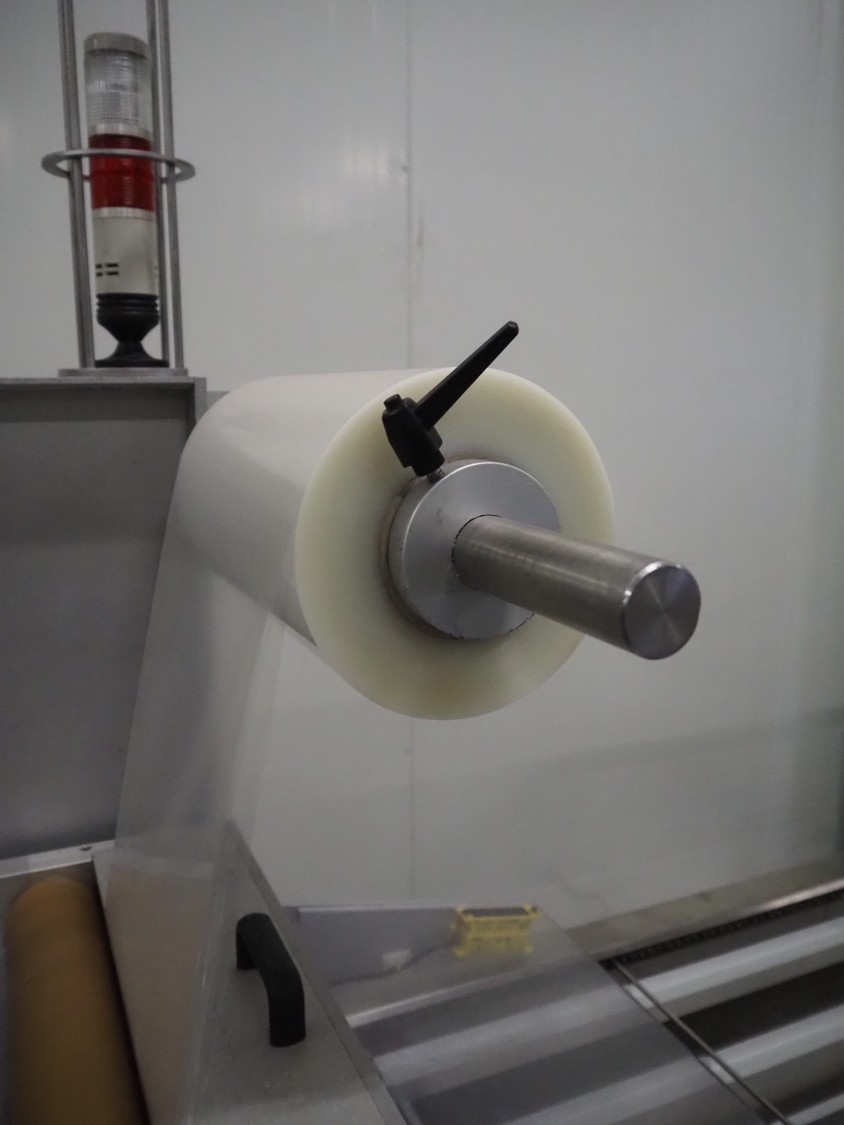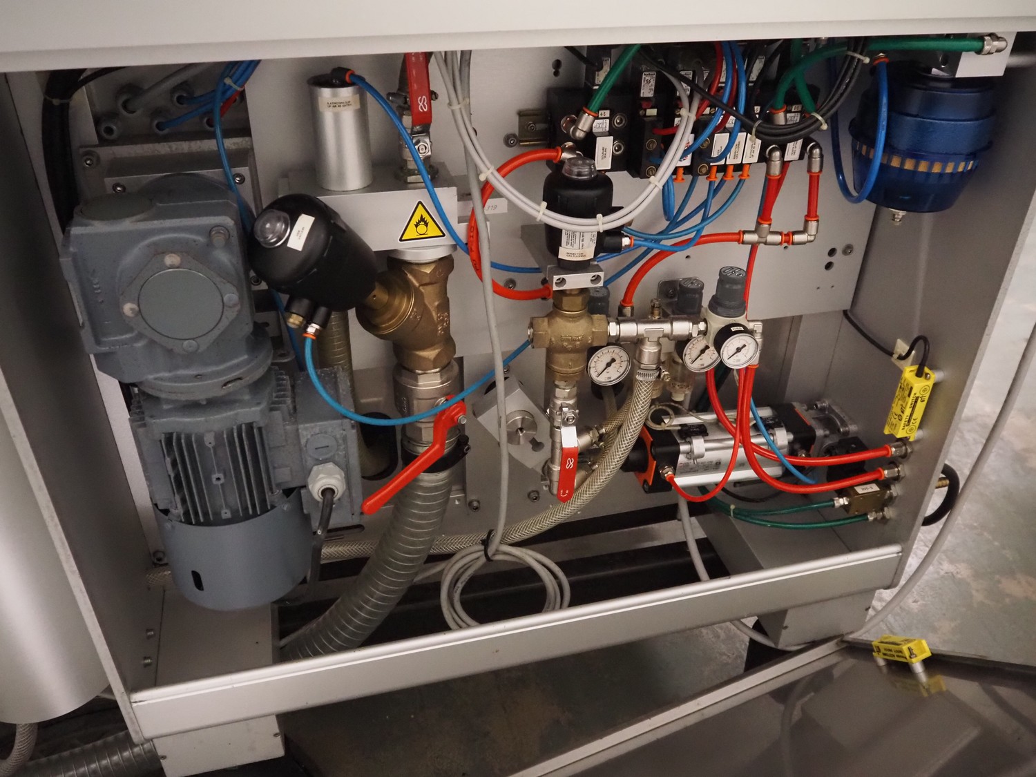 Meca Plastic traysealer with infeed belt, type: MECA 2002, number: 5344, year of construction: 11/2004, plastic infeed belt, belt width: 300 mm, infeed chain with dividers, distance between dividers: 340 mm, film width: 310 mm, dye: 255 mm x 255 mm, plastic outfeed rollers, roller width: 410 mm, Busch vacuum pump, type: RA 0160 D 561 QLXX, capacity: 160 m³ per hour, total dimensions: 4350 mm x 850 mm x 1950 mm.