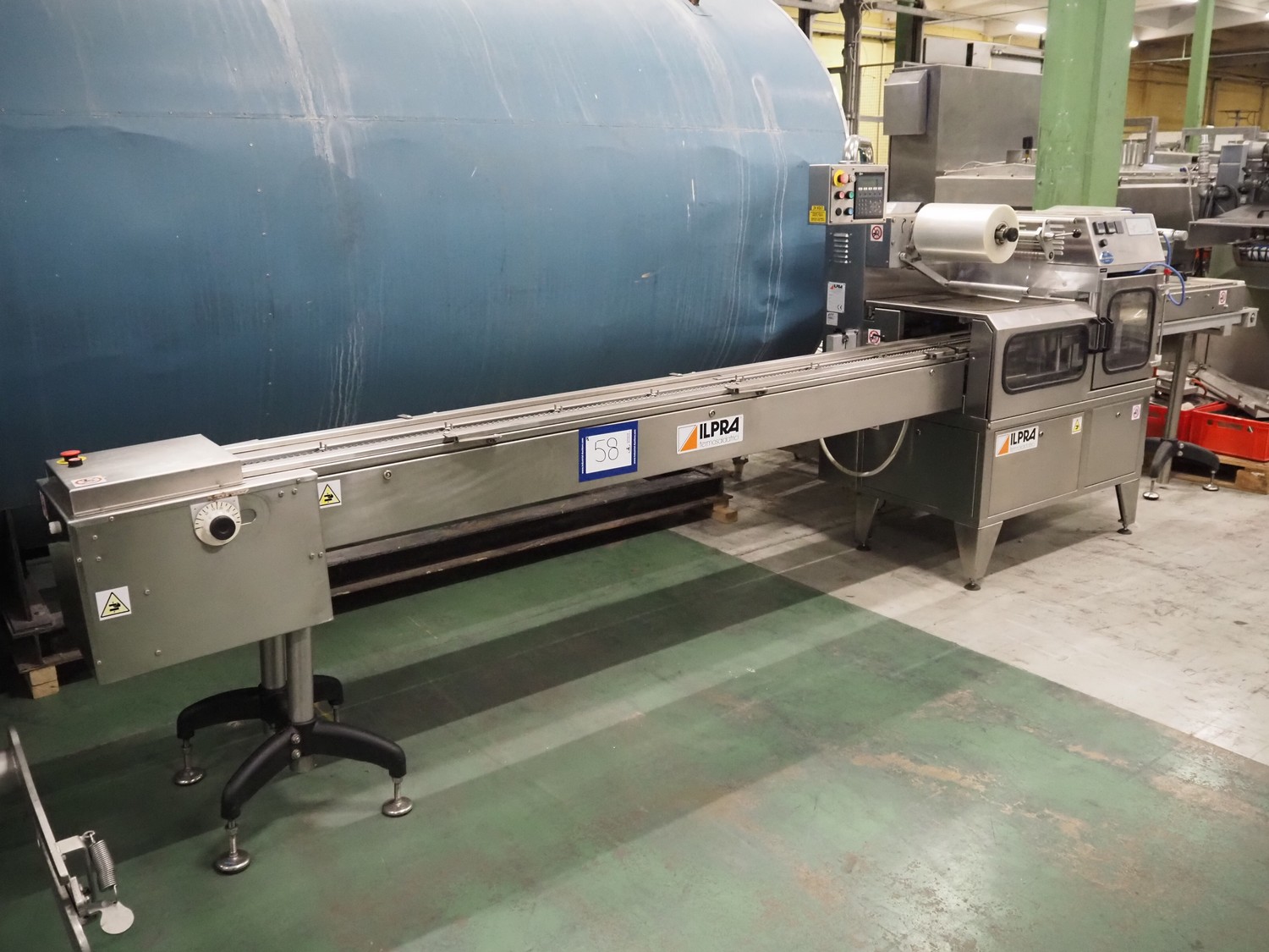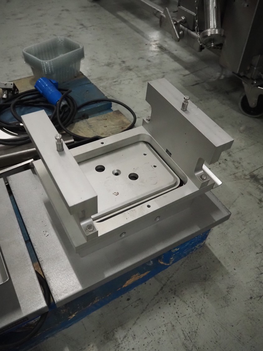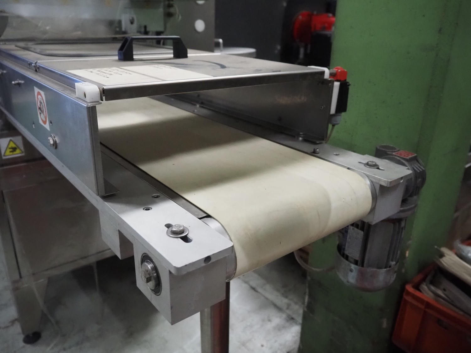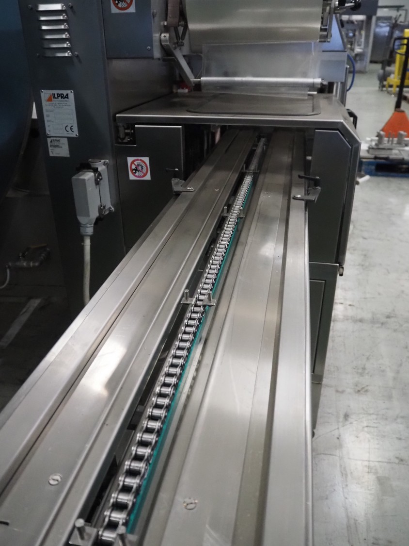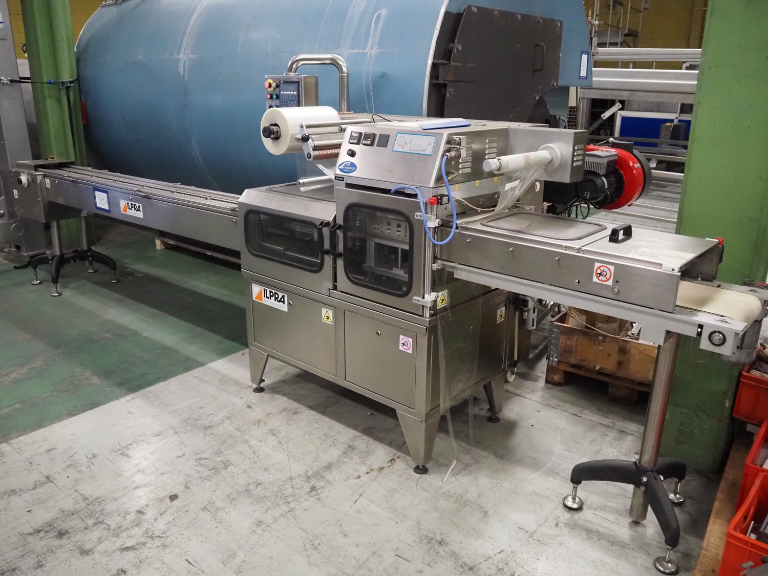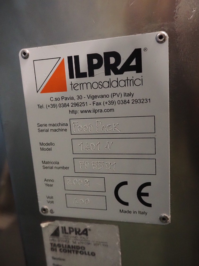 Ilpra traysealer, model: 1401 N, serie: Food Pack, serial number: FP 5591, year of construction: 2009, 400 V, infeed chain conveyor, distance between dividers: 320 mm, film width: 310 mm, dimensions dye: 300 mm x 240 mm, plastic outfeed belt, belt width: 260 mm, total dimensions: 4760 mm x 870 mm x 1650 mm. Including pallet with parts and dyes, dimensions dye: (1x) 210 mm x 160 mm, (1x) 155 mm x 110 mm, (2x) 60 mm x 80 mm.