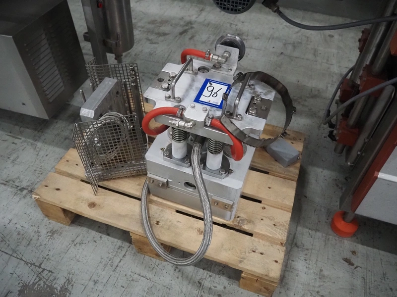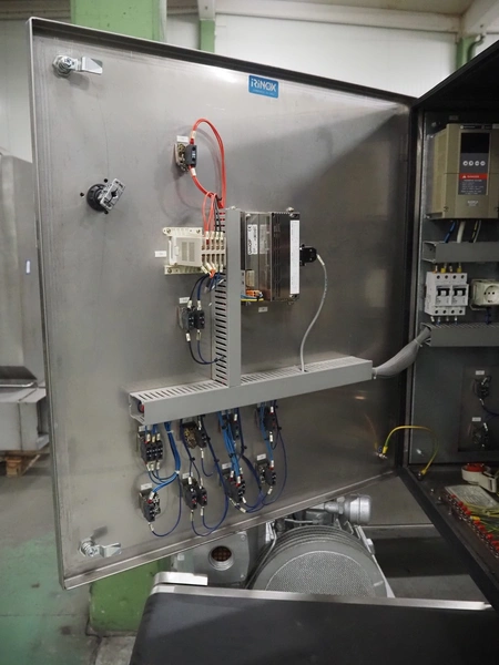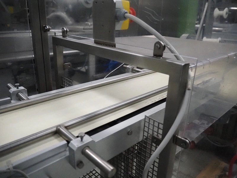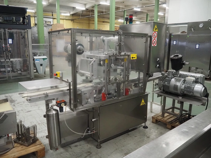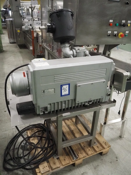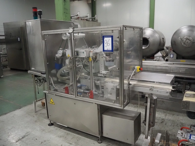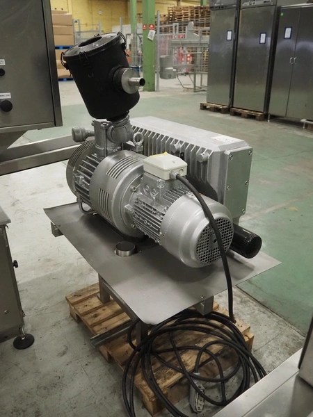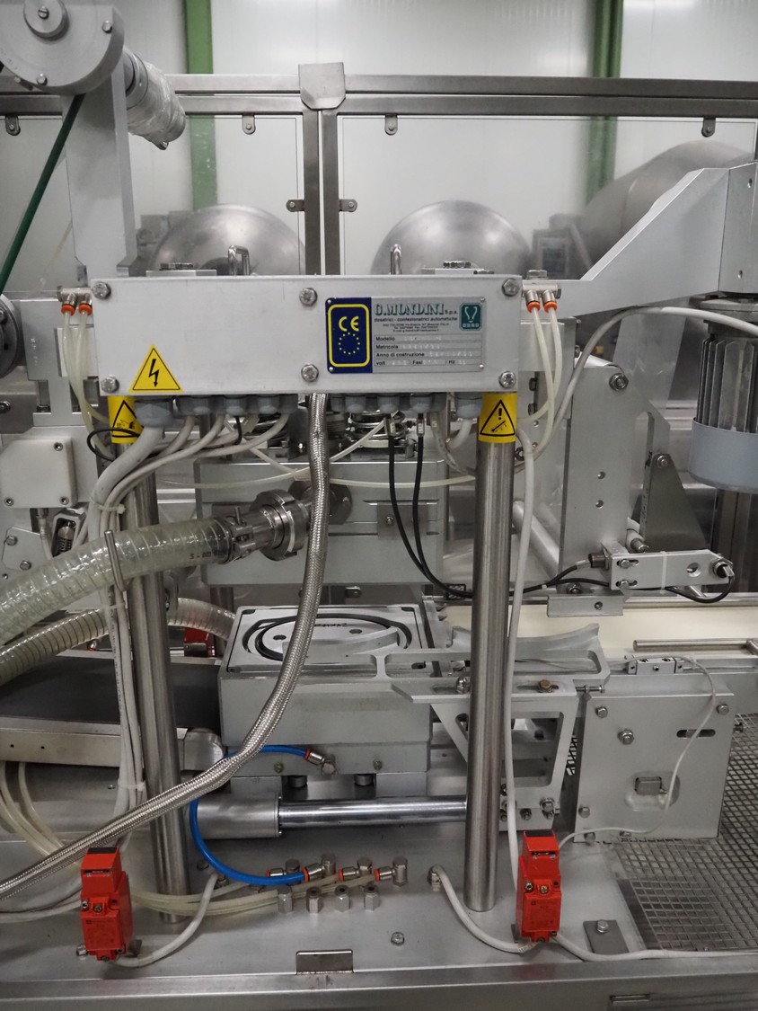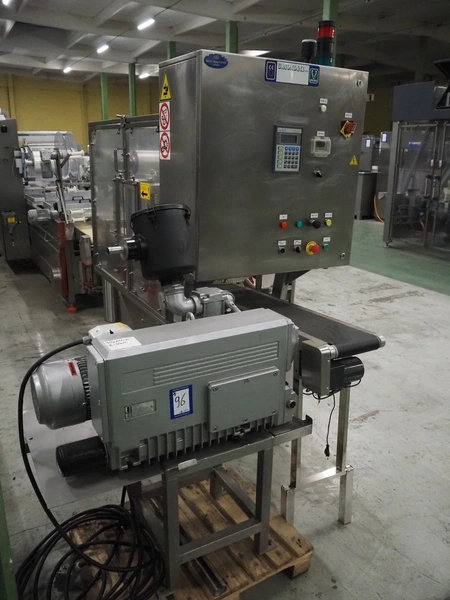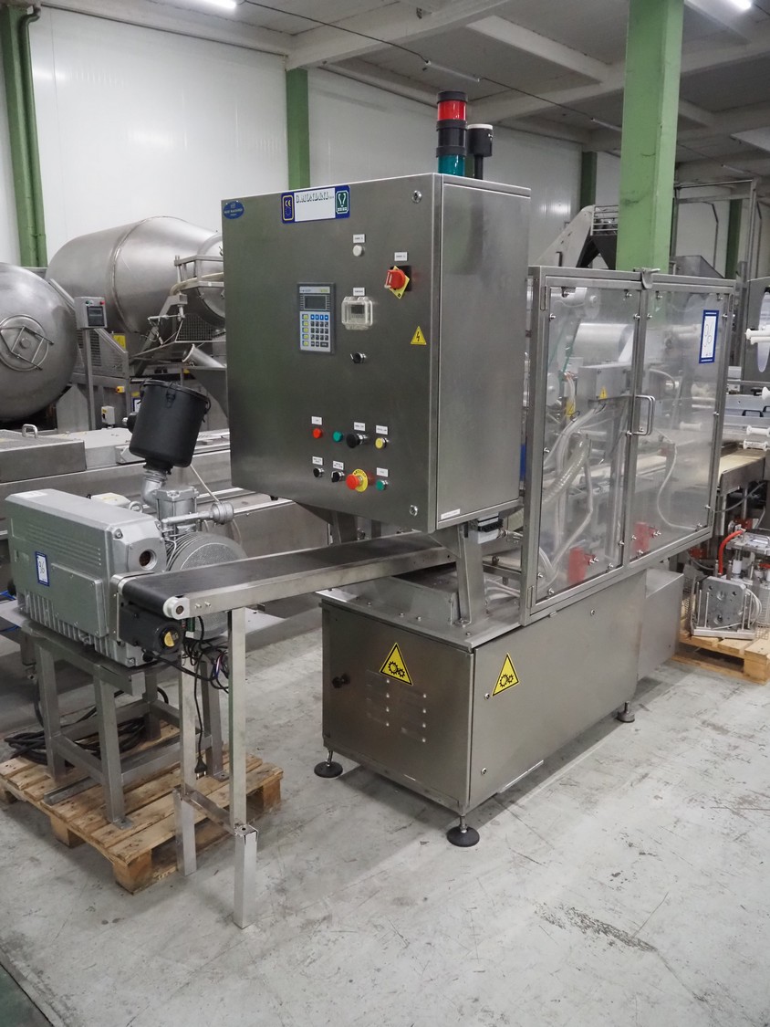 G. Mondini S.p.a. traysealer, model: CVS/MT-VG.1-S, serial number: 1761/00, year of construction: 18/10/00, 400 V, 3 Ph, 50 Hz, plastic infeed belt, belt width: 200, dimensions dye: 240 mm x 170 mm, total dimensions: 2250 mm x 950 mm x 2250 mm. With outfeed belt, plastic belt, belt width: 190 mm, total dimensions: 1500 mm x 320 mm x 950 mm. Including Busch vacuum pump, type: RC01600 and pallet with parts.