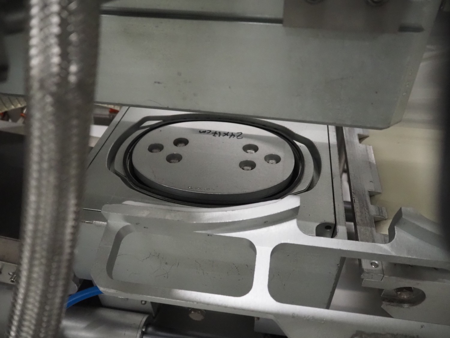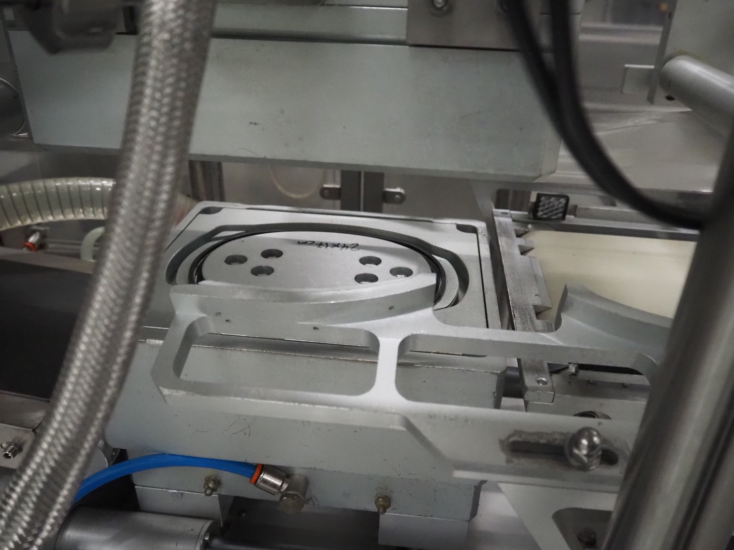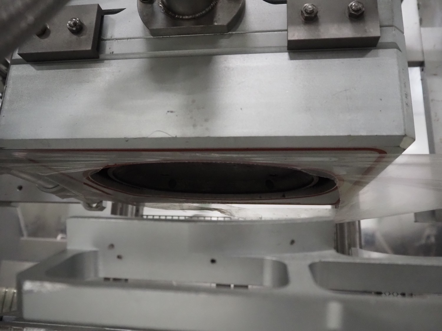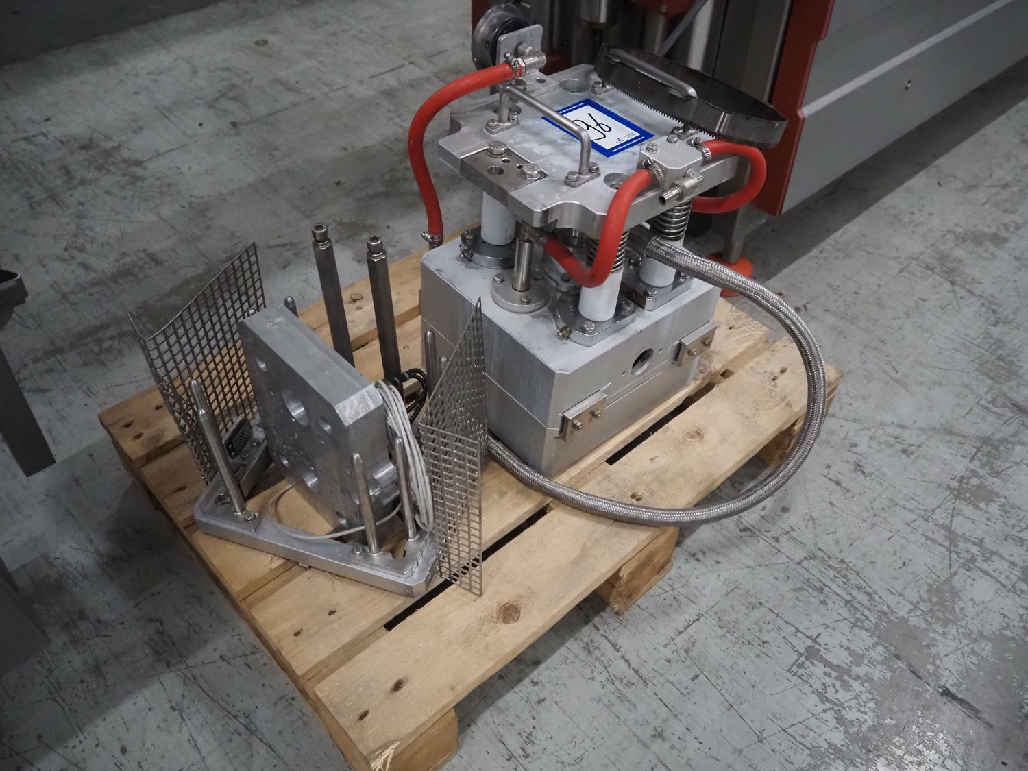 G. Mondini S.p.a. traysealer, model: CVS/MT-VG.1-S, serial number: 1761/00, year of construction: 18/10/00, 400 V, 3 Ph, 50 Hz, plastic infeed belt, belt width: 200, dimensions dye: 240 mm x 170 mm, total dimensions: 2250 mm x 950 mm x 2250 mm. With outfeed belt, plastic belt, belt width: 190 mm, total dimensions: 1500 mm x 320 mm x 950 mm. Including Busch vacuum pump, type: RC01600 and pallet with parts.