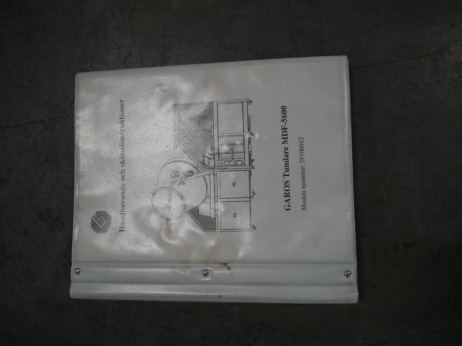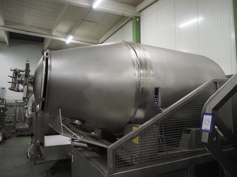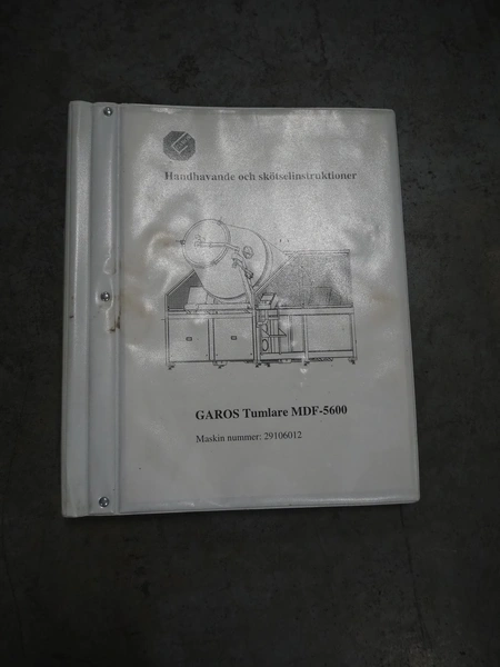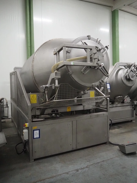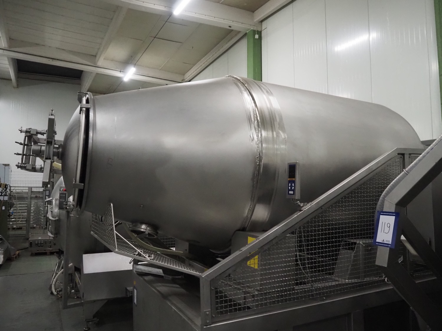 AB Garos tiltable cooled vacuum tumbler, type: MDF 5600 K, machine number: 29106012, year of construction: 2001, 400 V, 50 Hz, 26 A, 11.5 kW, weight: 3570 kg, maximum capacity: 3500 kg / liter, Busch vacuum pump, total dimensions: 5600 mm x 2450 mm x 2950 mm.