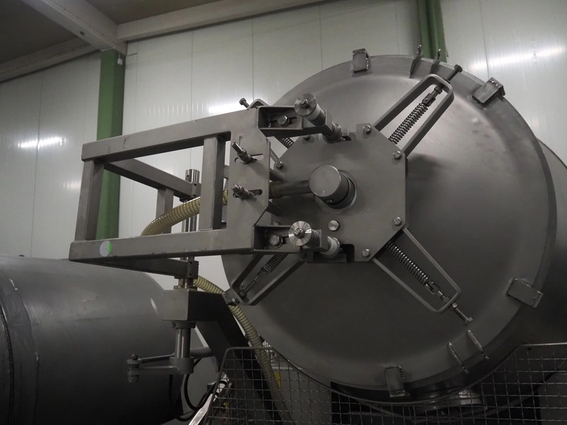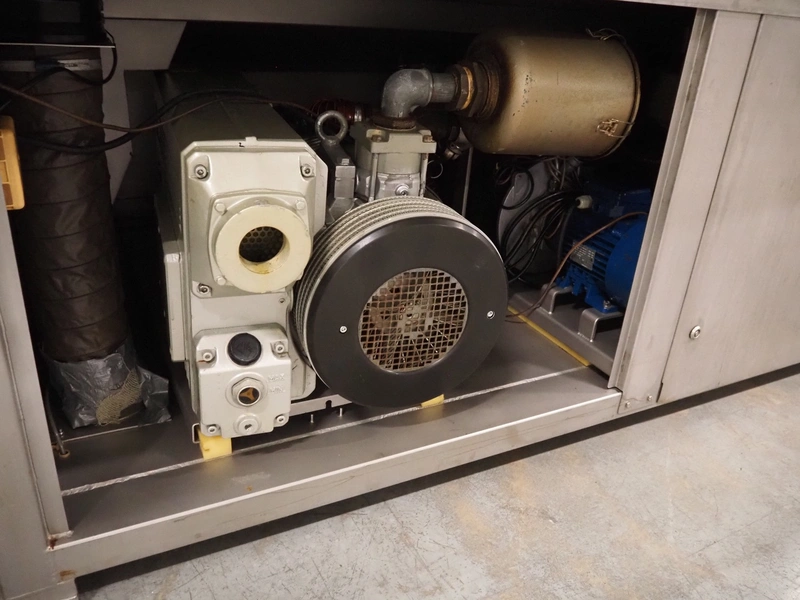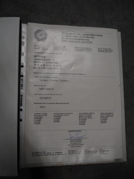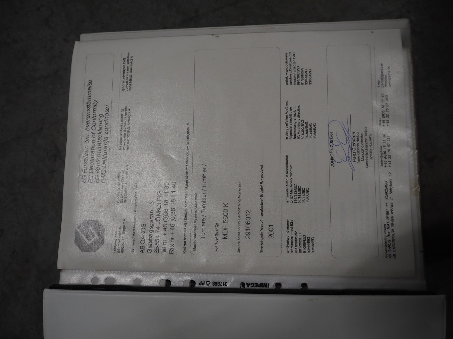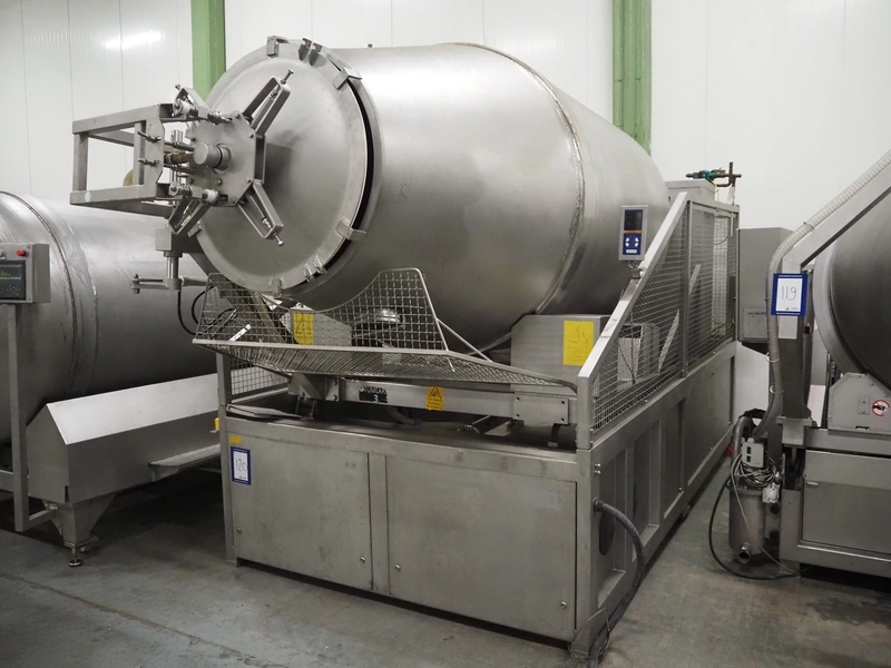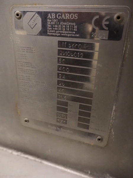 AB Garos tiltable cooled vacuum tumbler, type: MDF 5600 K, machine number: 29106012, year of construction: 2001, 400 V, 50 Hz, 26 A, 11.5 kW, weight: 3570 kg, maximum capacity: 3500 kg / liter, Busch vacuum pump, total dimensions: 5600 mm x 2450 mm x 2950 mm.