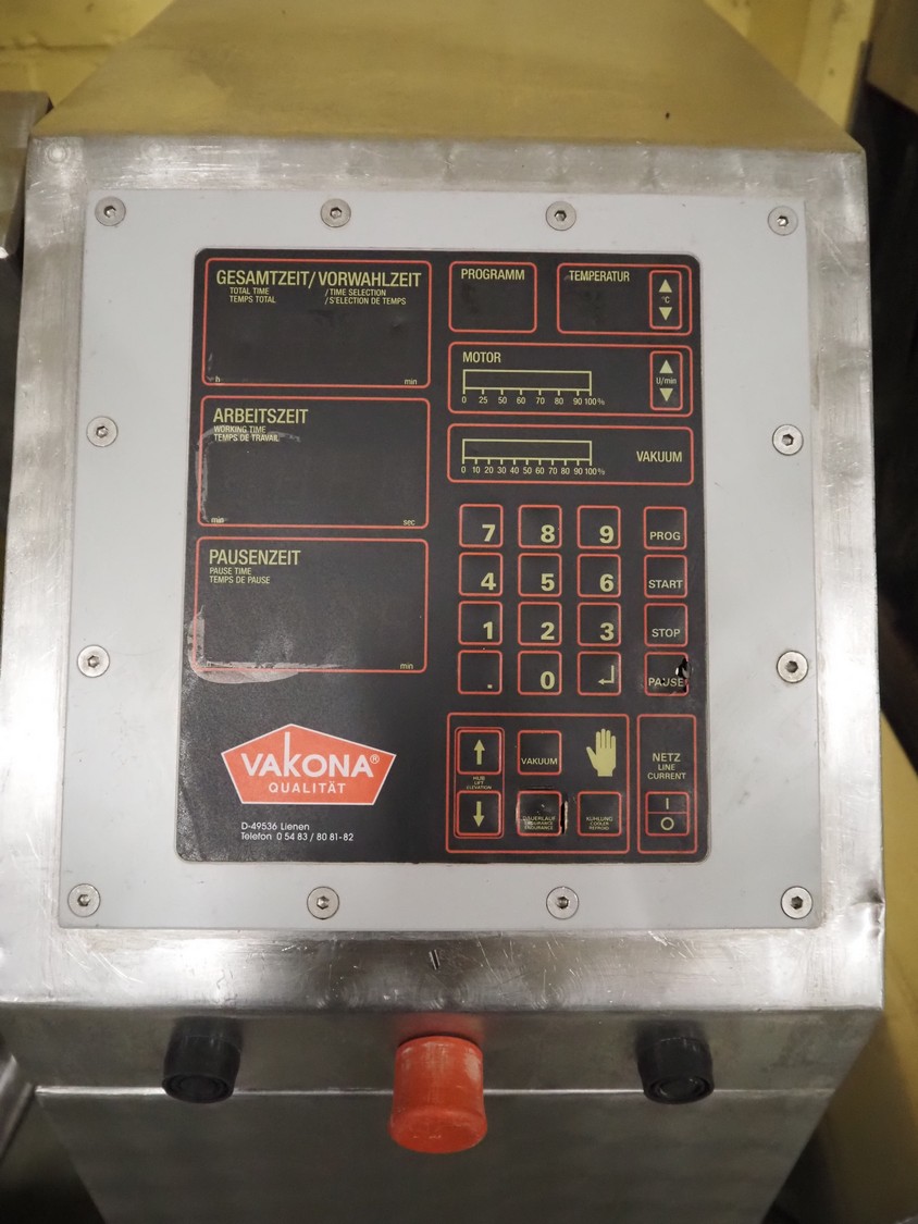 Vakona cooled vacuum tumbler, type: 750, number: 501, year of construction: 1993, volume: 750 liter, dimensions: 2000 mm x 1300 mm x 1750 mm. Without vacuum pump, cooling compressor and mixing arm.