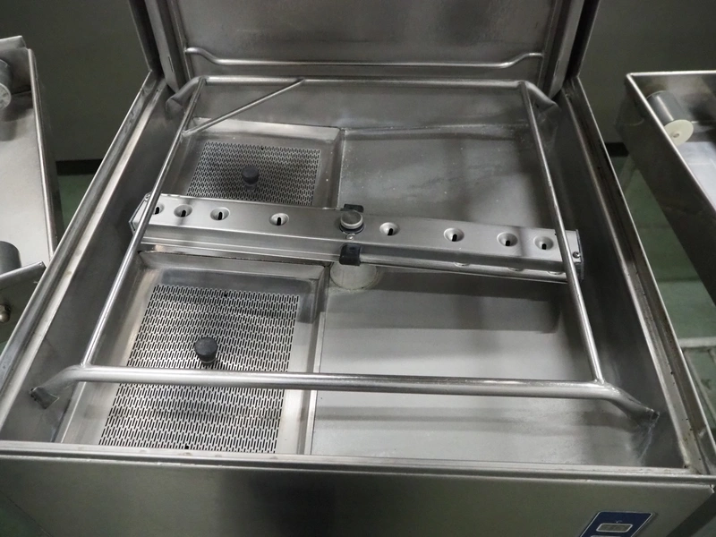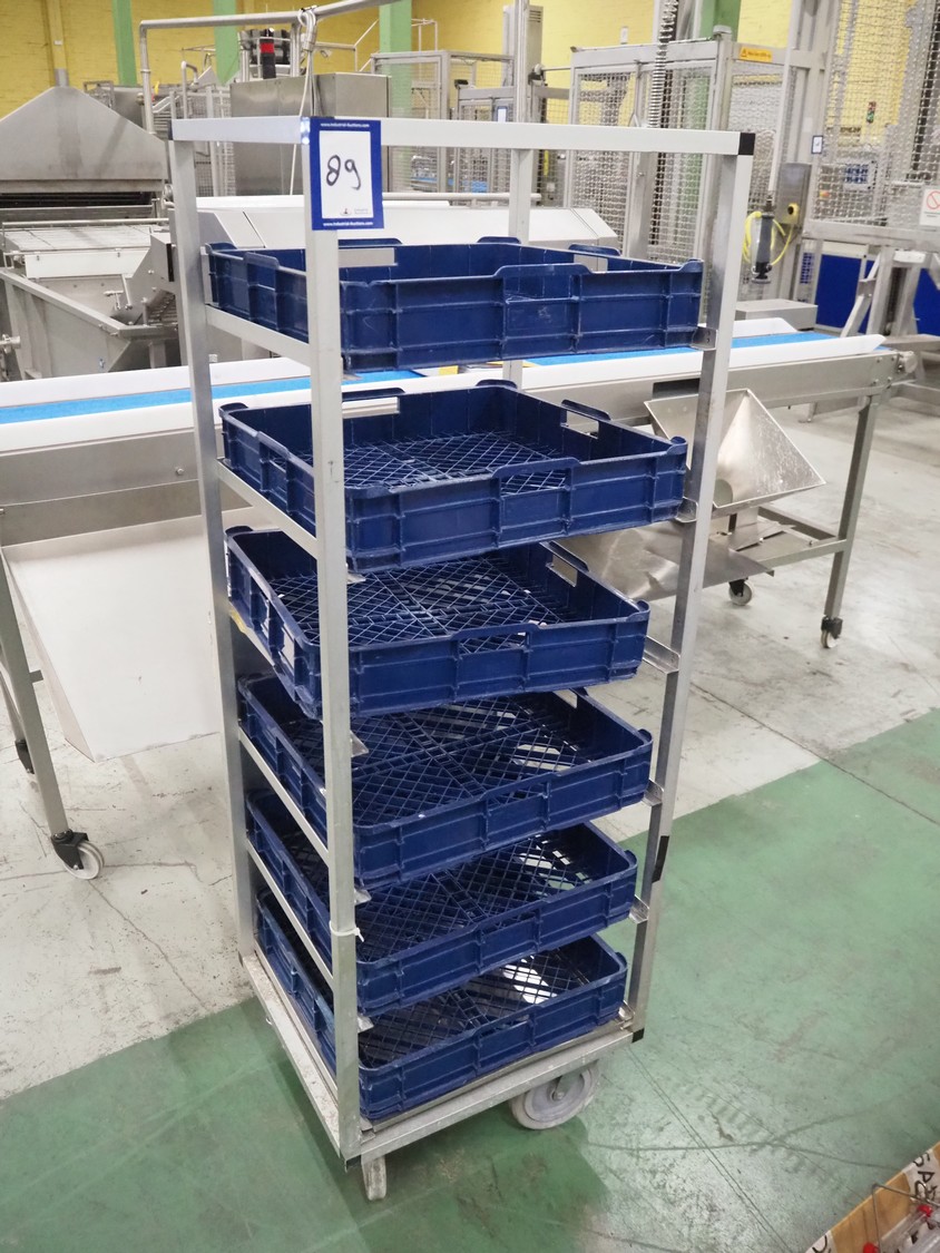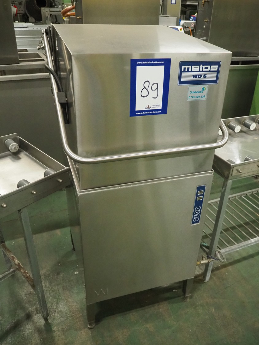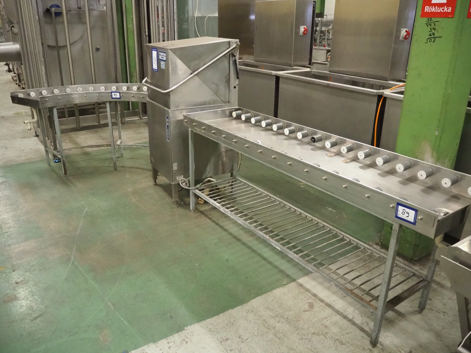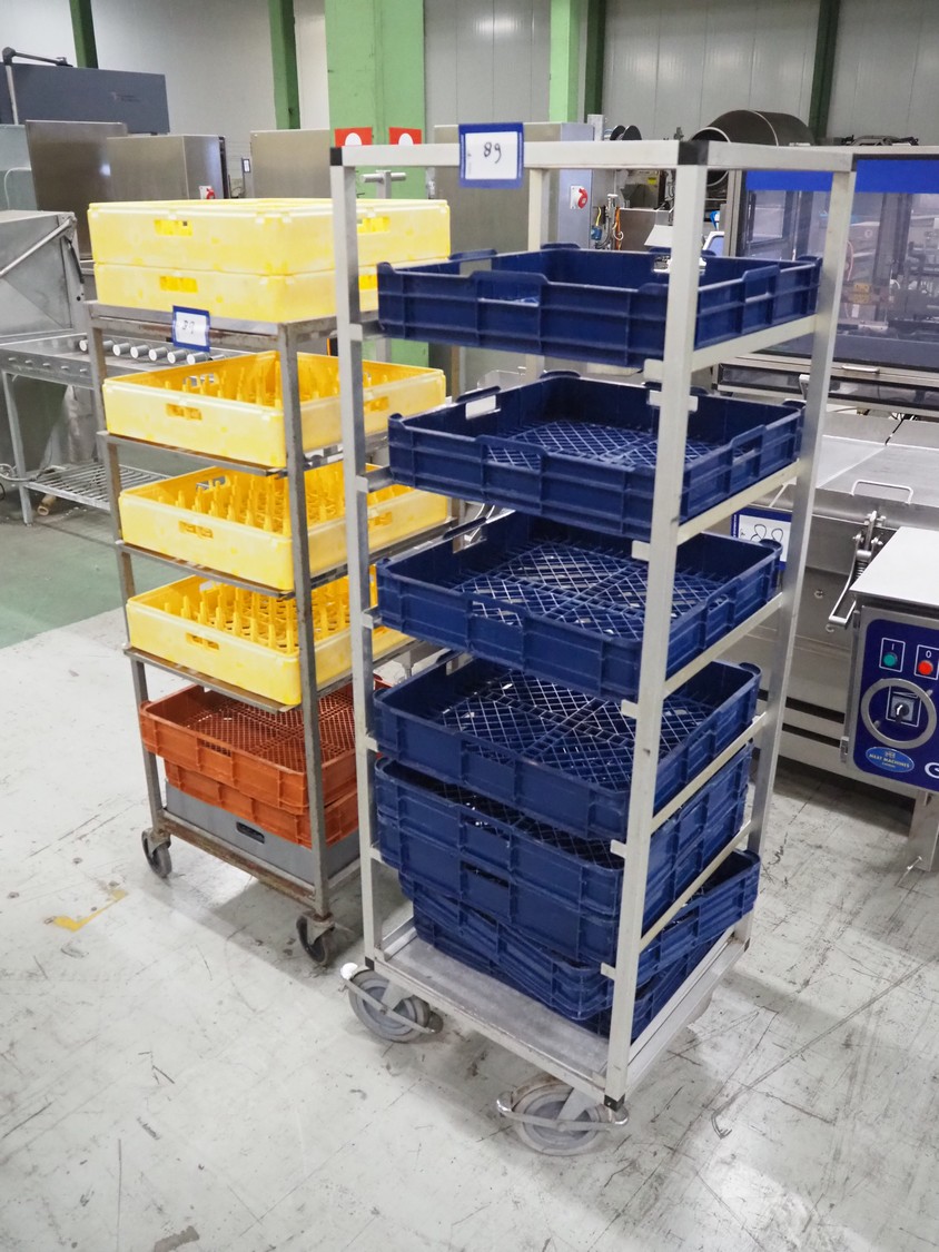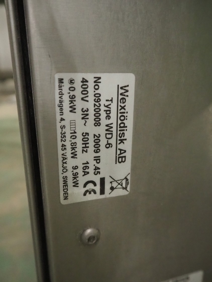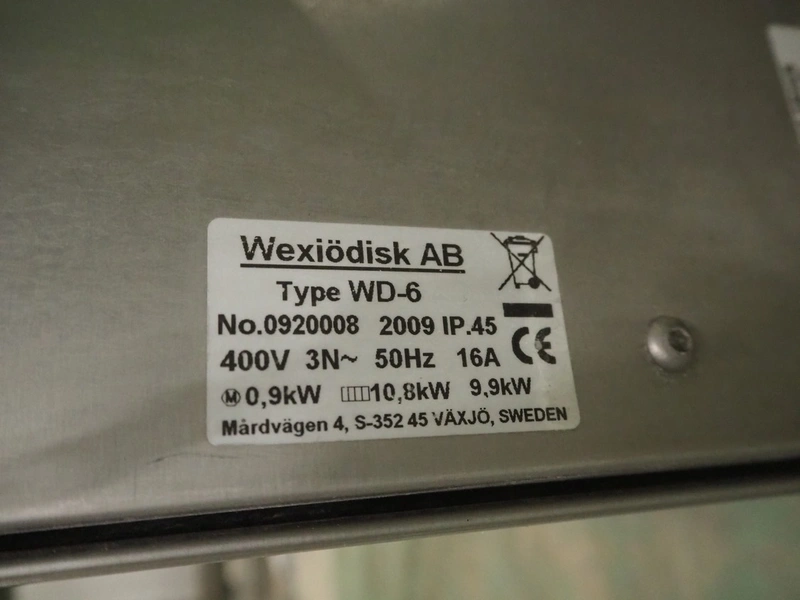 Wexiödisk AB dishwasher, type: WD-6, number: 0920008, year of construction: 2009, 400 V, 3 Ph, 50 Hz, 16 A, 10.8 / 9.9 kW, clearance: 500 mm x 500 mm, dimensions dishwasher: 710 mm x 690 mm x 1410 mm, infeed belt, dimensions infeed: 1300 mm x 1000 mm x 900 mm, outfeed belt, dimensions outfeed: 2150 mm x 560 mm x 900 mm. Including 3 trolleys with crates, dimensions trolleys: (2x) 560 mm x 510 mm x 1640 mm and 560 mm x 510 mm x 1380 mm.