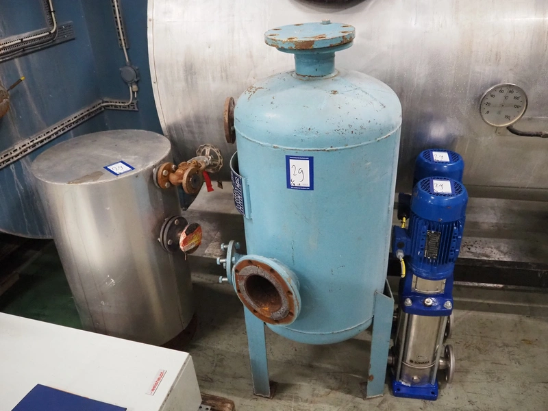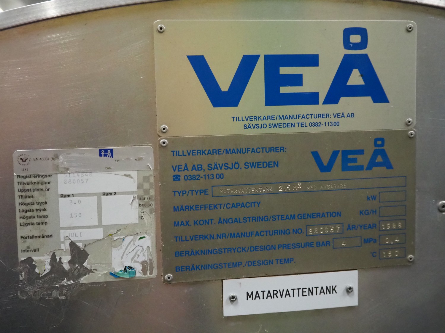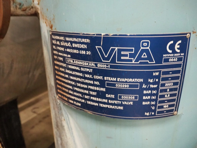 - VEÅ AB boiler tank, type: UTBLÅSNINGSKÄRL Ø500-1, manufacturing number: 030290, year of construction: 2003, design temperature: 160 °C, design temperature: 5 bar, dimensions: 600 mm x 600 mm x 1400 mm.
