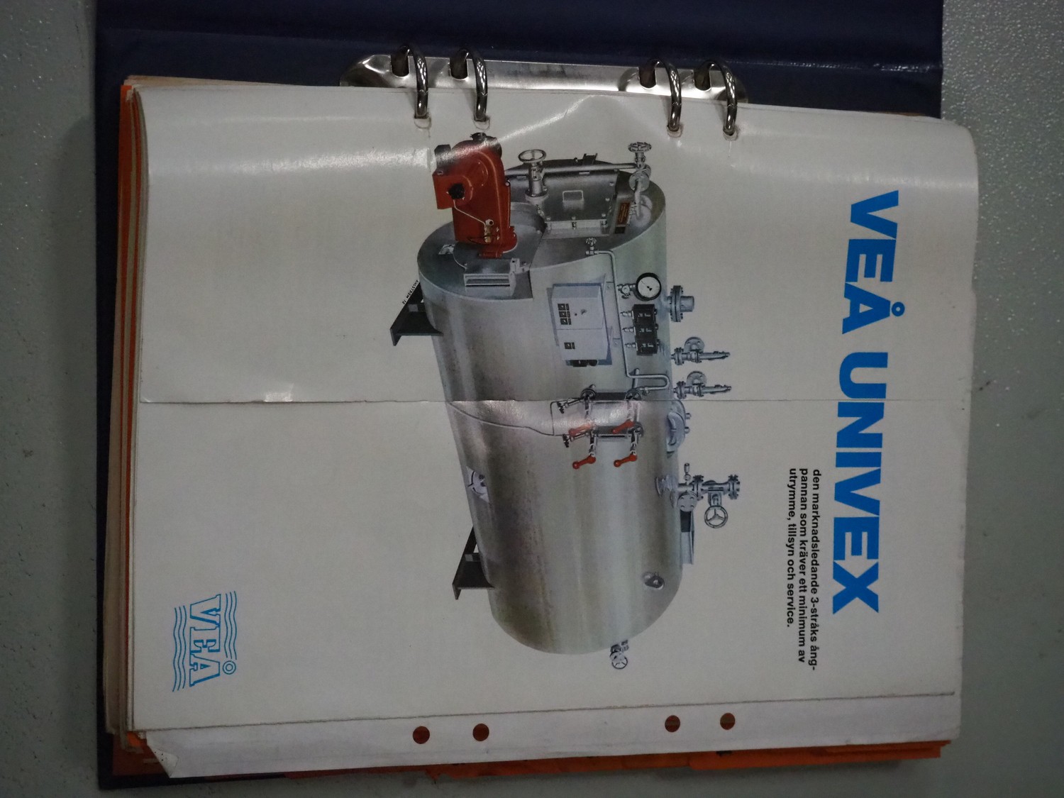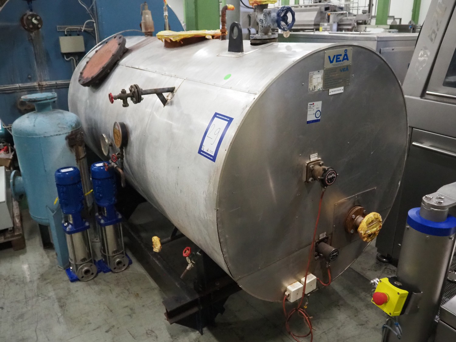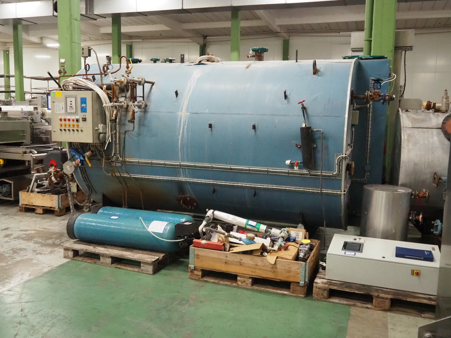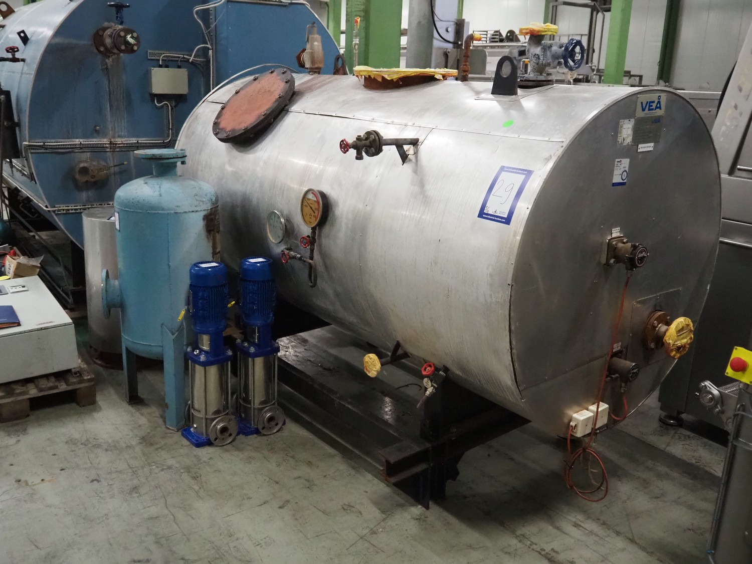- VEÅ AB steam boiler, type: ÅNGPANNA VEÅ UNIVEX 32 H-13, manufacturing number: 880025, year of construction: 1988, steam generation: 3000 kg/h, nominal output: 1965 kW, steam evaporation: 1.111 kg/s, design pressure: 13 bar, design temperature: 195 °C, with Weishaupt GmbH burner, type: WM-G10/3-A, number: 5867560, year of construction: 2009, maximum: 1000 kW, gas type: N, total dimensions: 4800 mm x 2500 mm x 3400 mm.