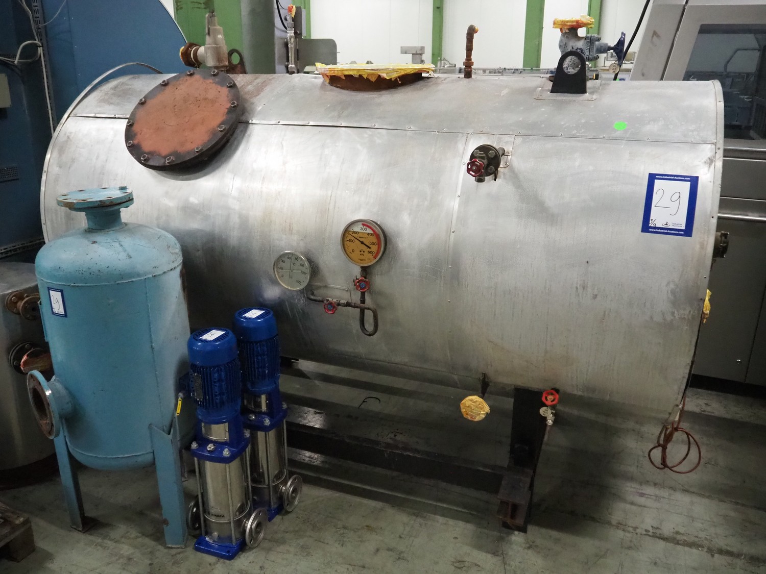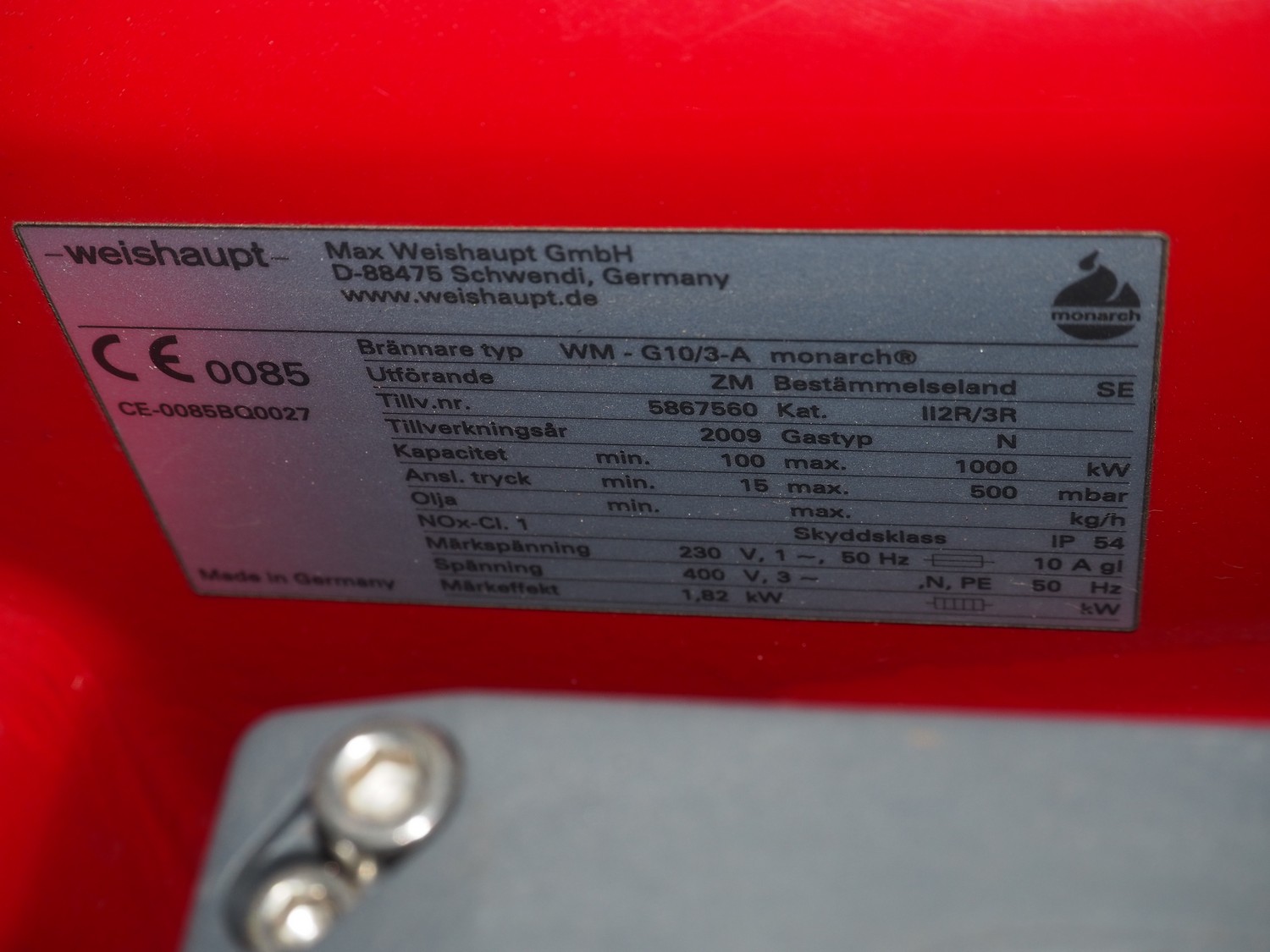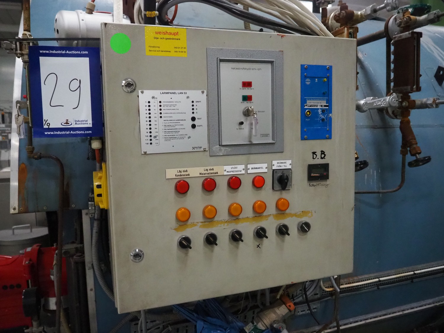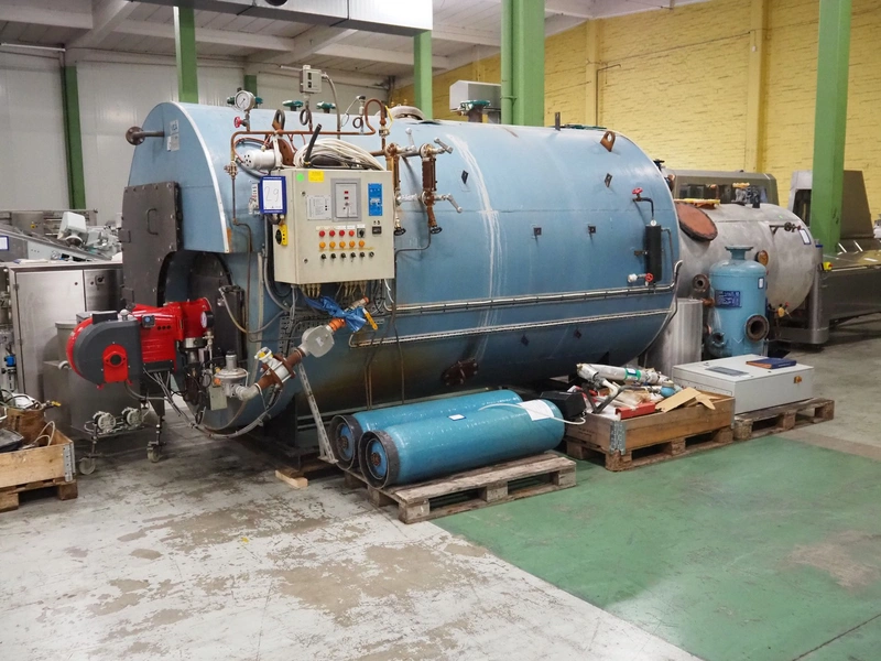 - VEÅ AB steam boiler, type: ÅNGPANNA VEÅ UNIVEX 32 H-13, manufacturing number: 880025, year of construction: 1988, steam generation: 3000 kg/h, nominal output: 1965 kW, steam evaporation: 1.111 kg/s, design pressure: 13 bar, design temperature: 195 °C, with Weishaupt GmbH burner, type: WM-G10/3-A, number: 5867560, year of construction: 2009, maximum: 1000 kW, gas type: N, total dimensions: 4800 mm x 2500 mm x 3400 mm.