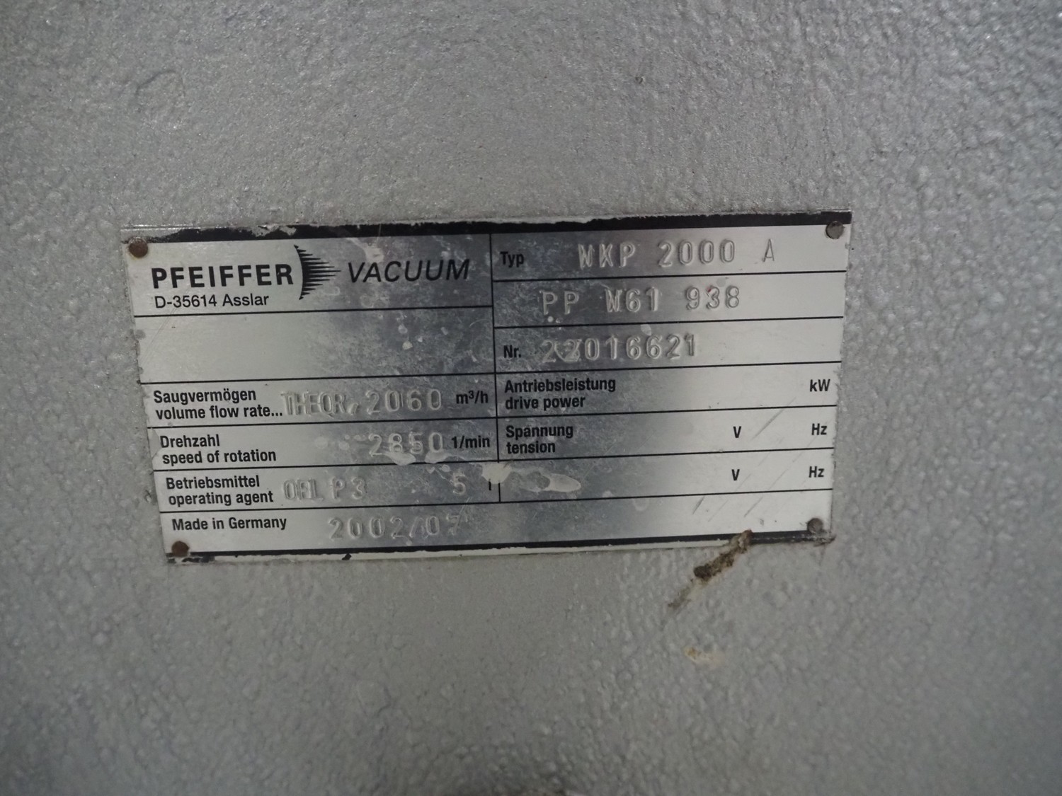 Pfeiffer Vacuum roots pump, type: WKP 2000 A, number: 22016621, year of construction: 07/2002, capacity: 2060 m³ per hour, dimensions: 1750 mm x 1150 mm x 1200 mm.