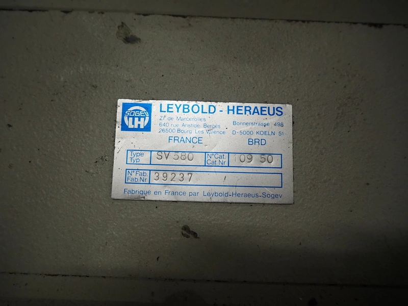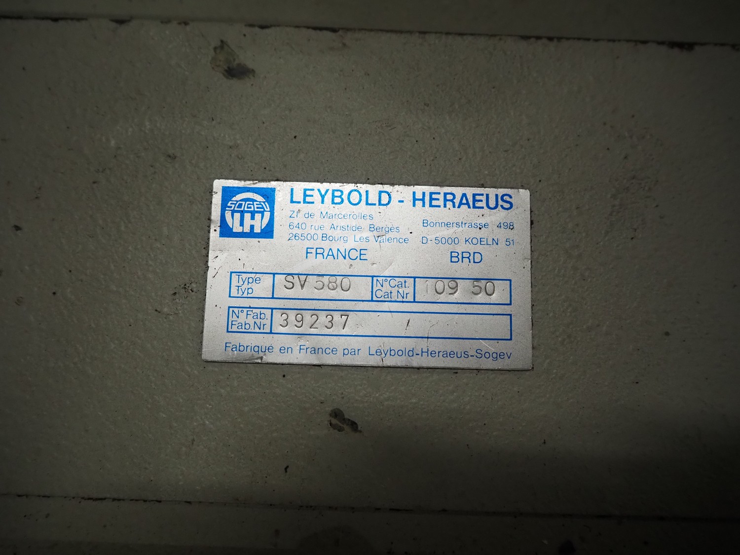 Leybold-Heraeus vacuum pump, type: SV 580, number: 39237, capacity: 580 m³/h, dimensions: 1400 mm x 900 mm x 1200 mm.