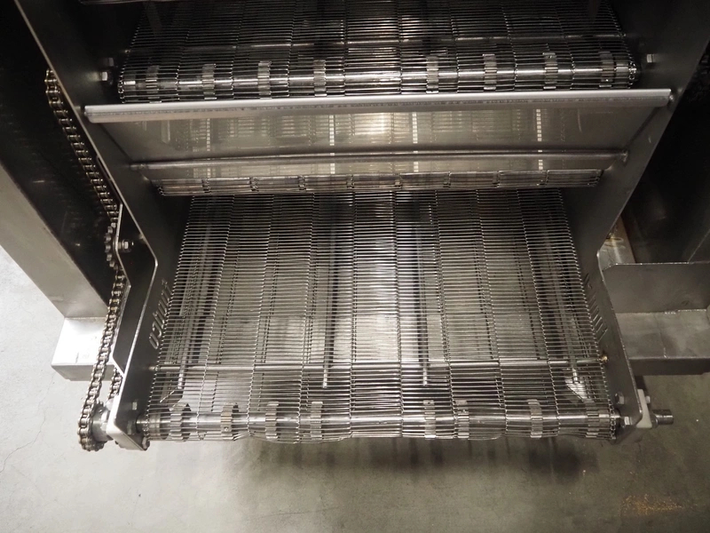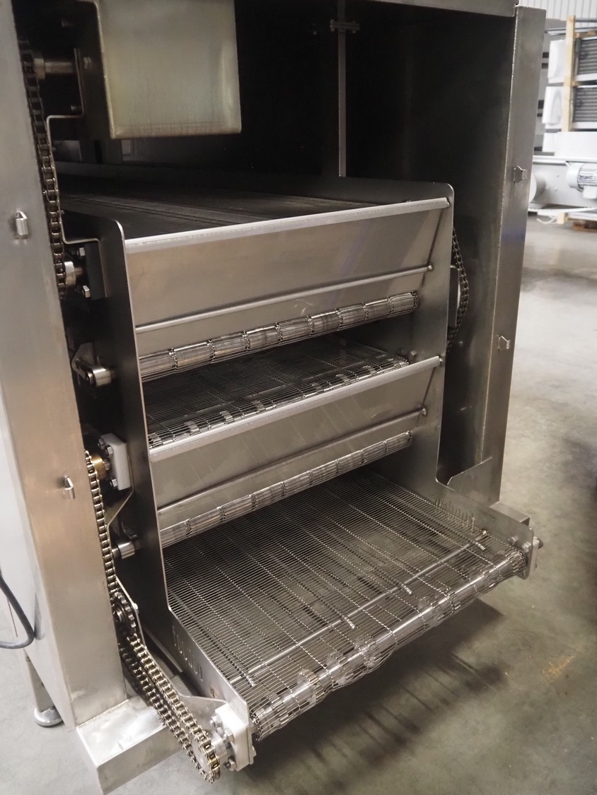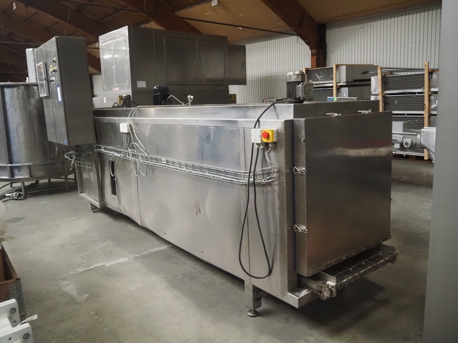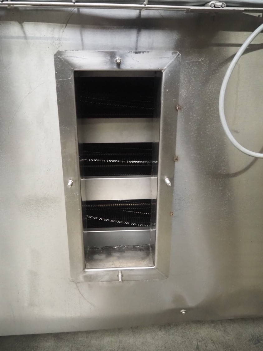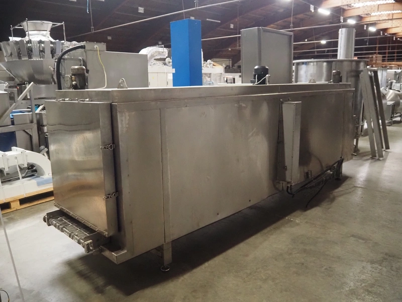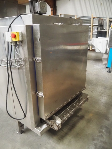 Cooling tunnel tunnel, s/s mesh belt, belt width: 610 mm, total dimensions: 4500 mm x 1400 mm x 3000 mm.