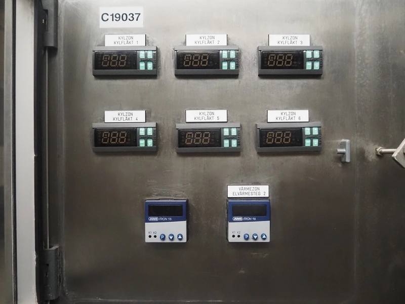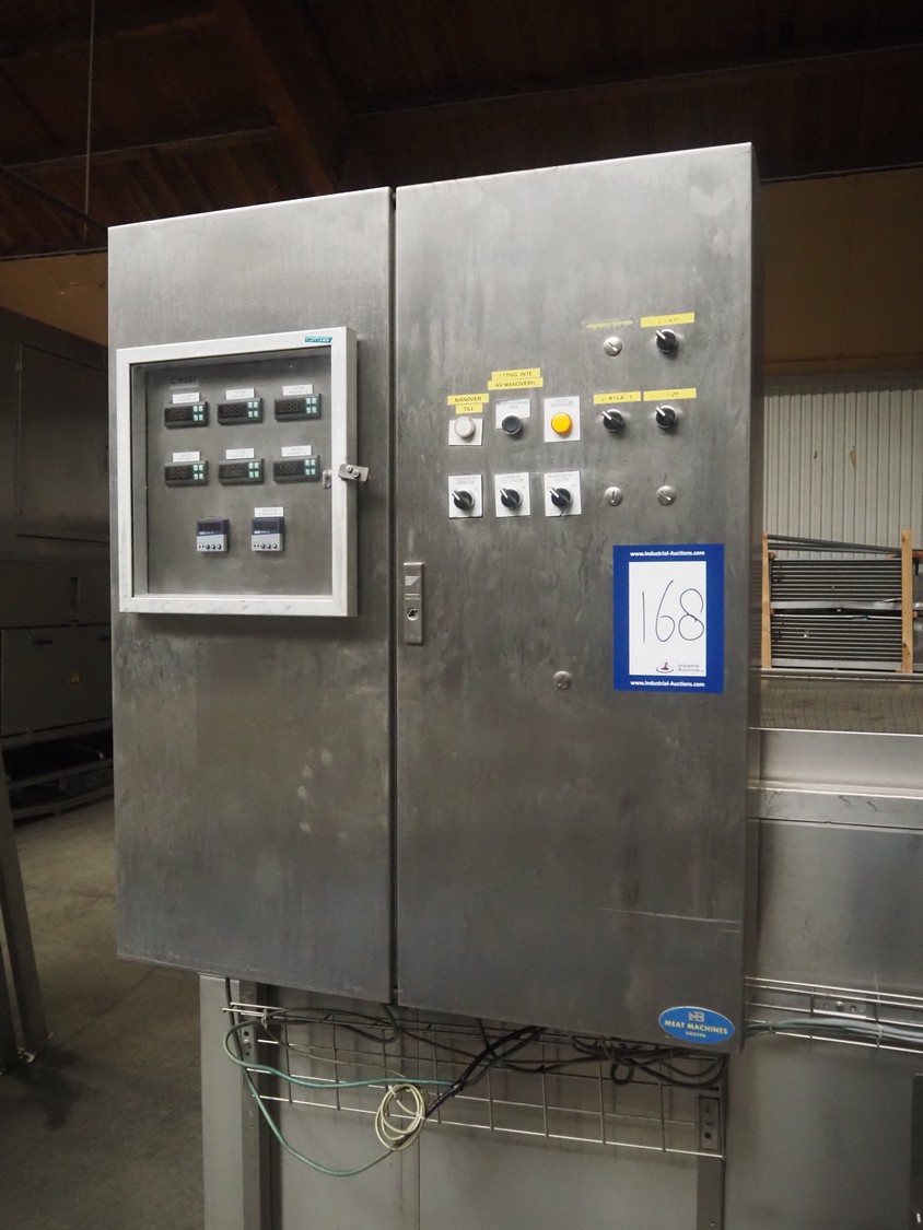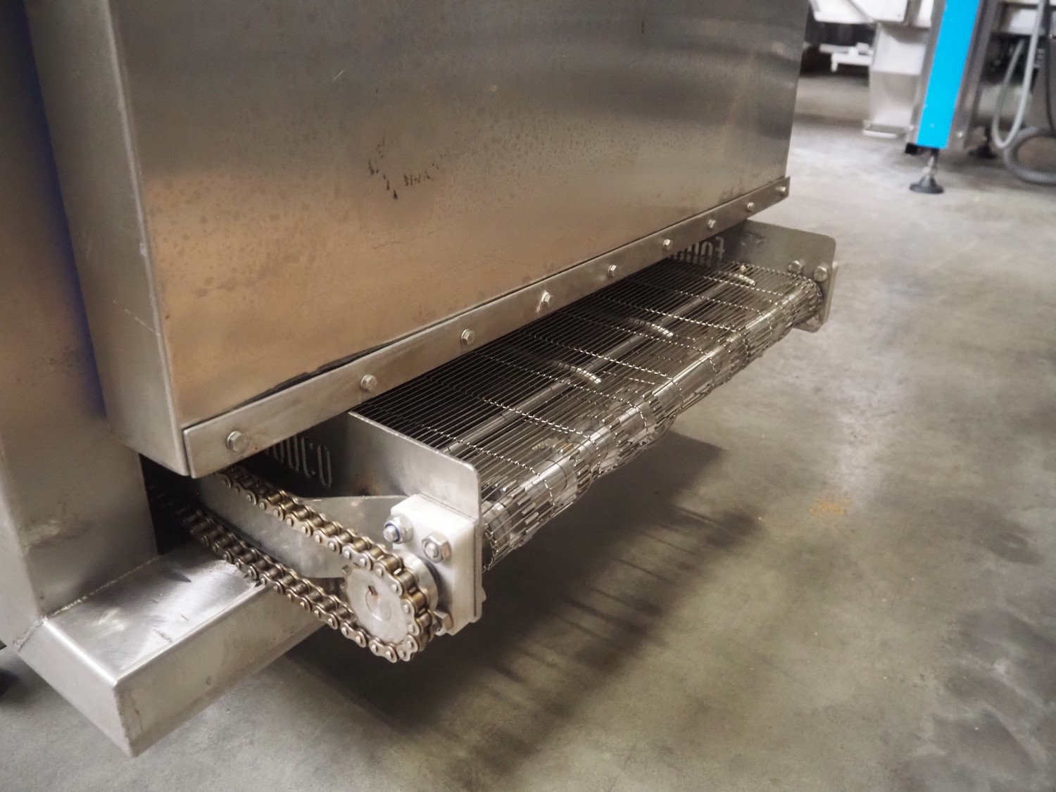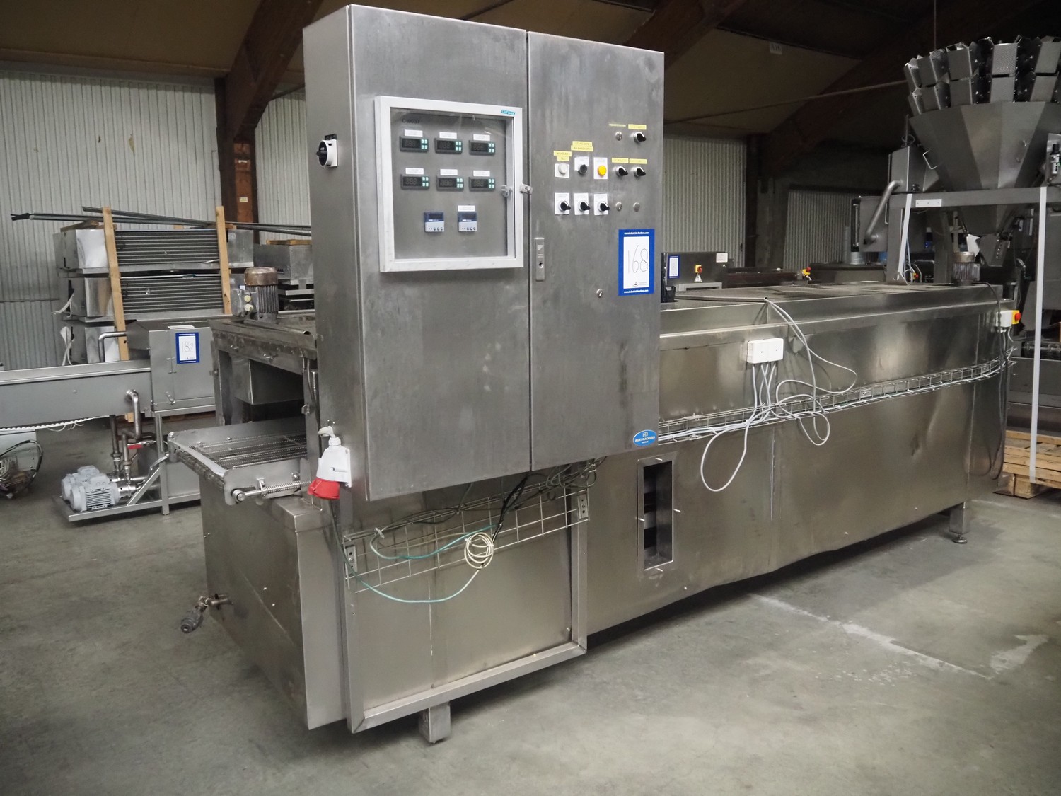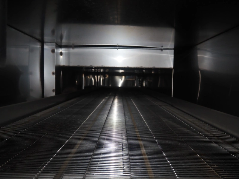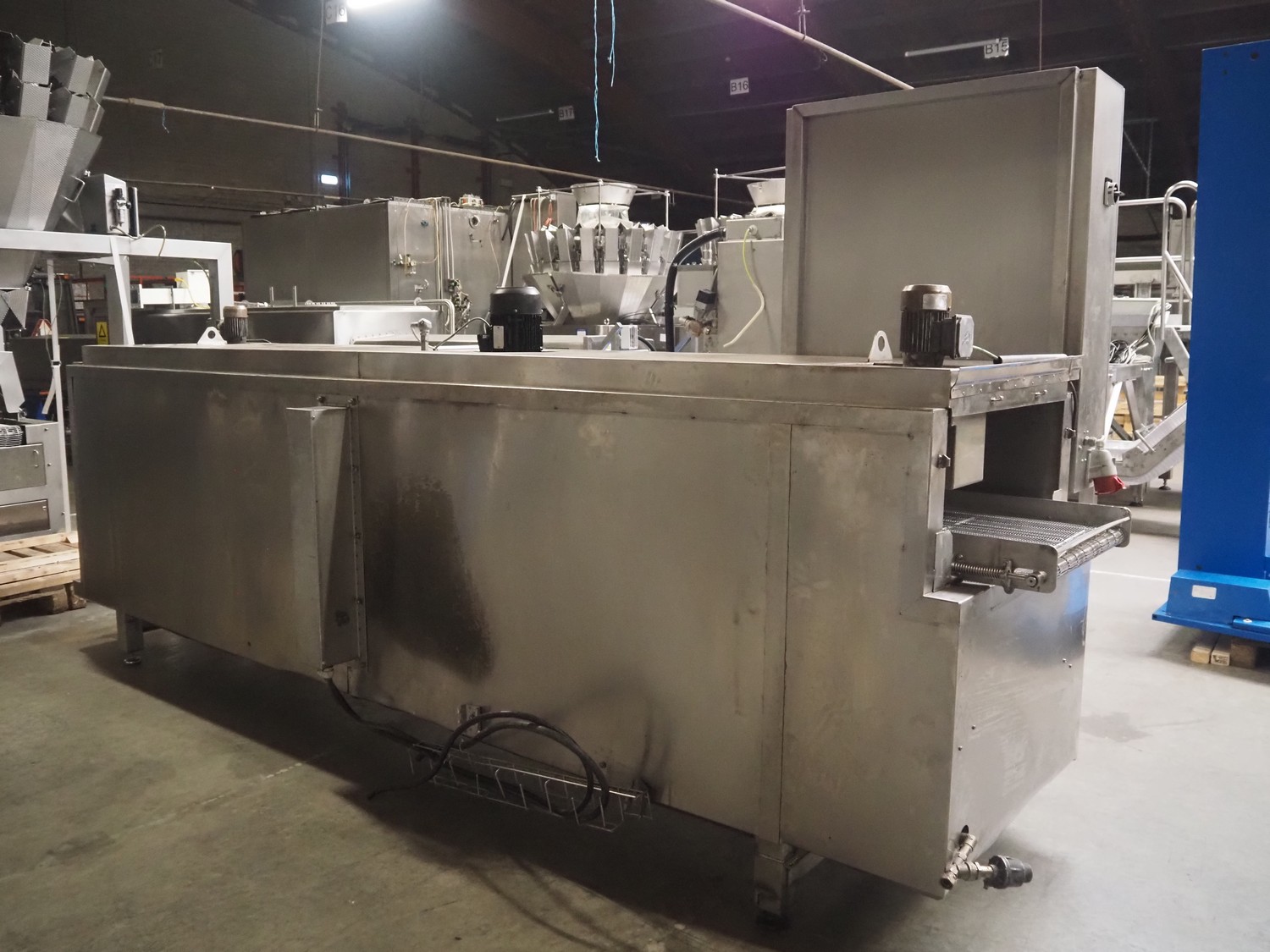 Cooling tunnel tunnel, s/s mesh belt, belt width: 610 mm, total dimensions: 4500 mm x 1400 mm x 3000 mm.