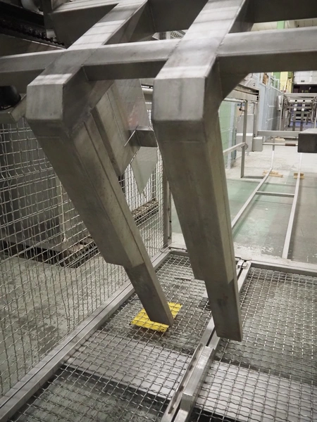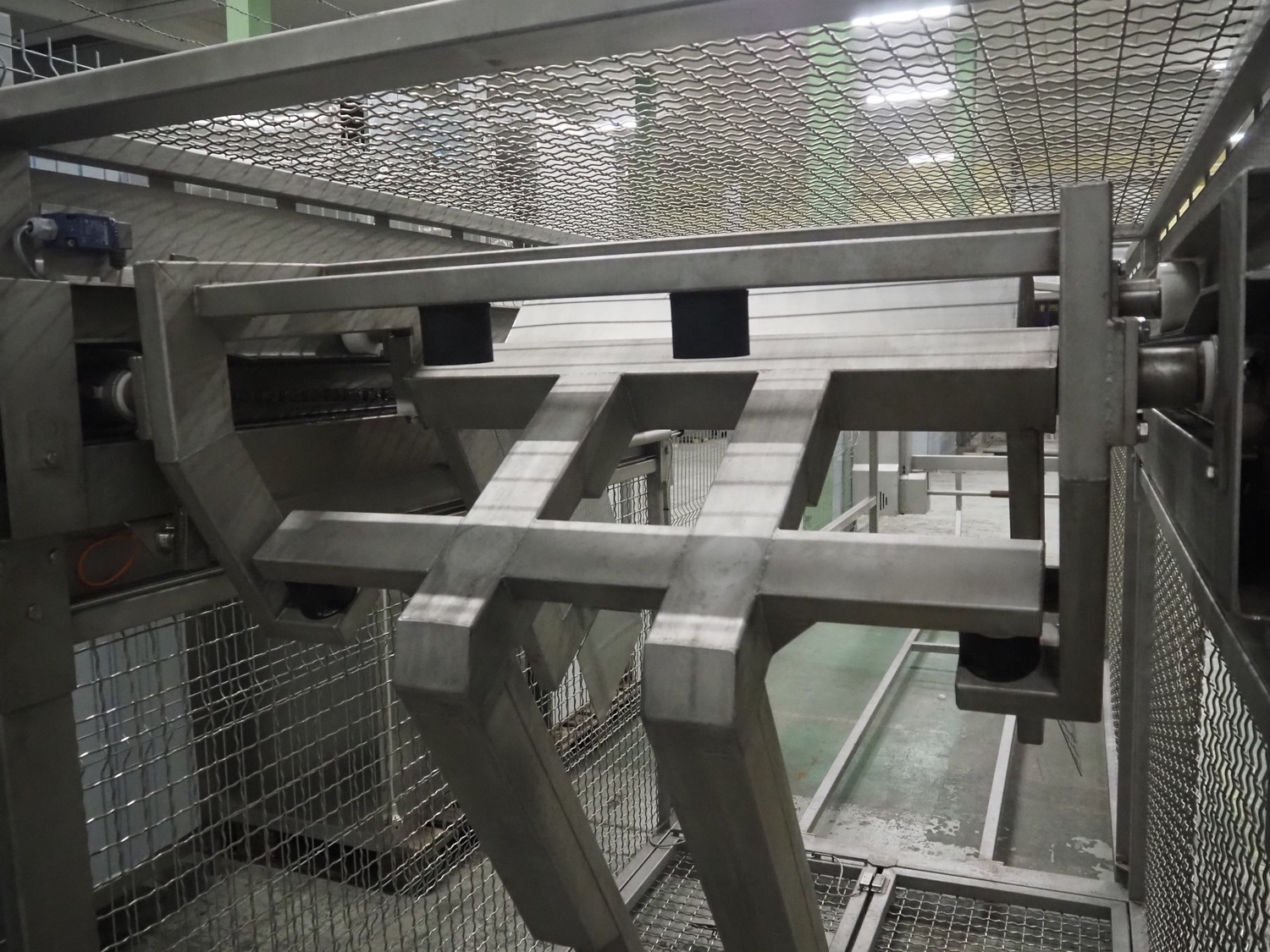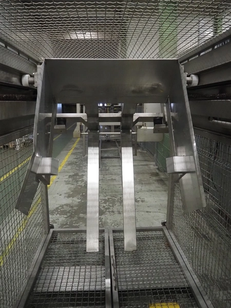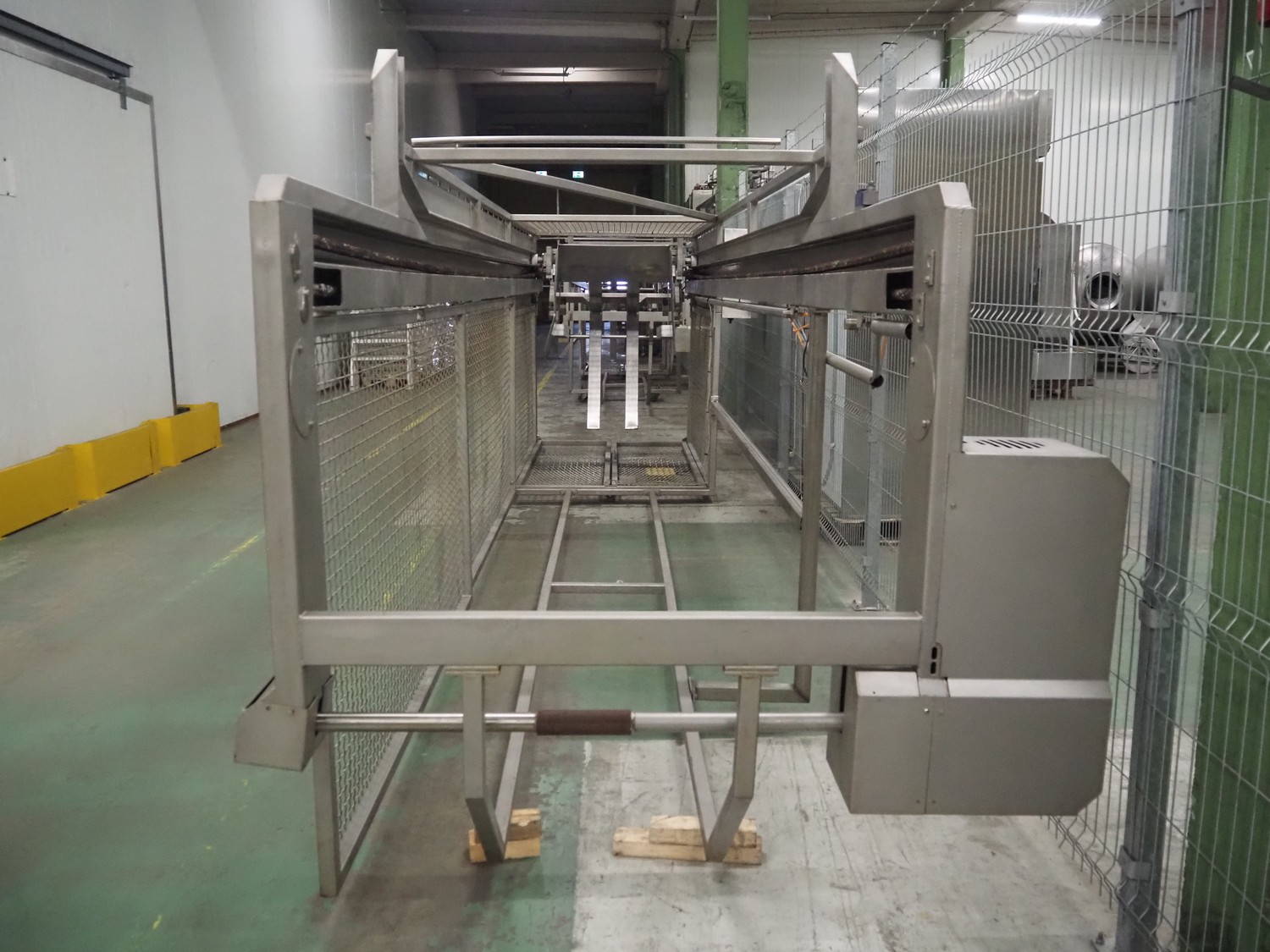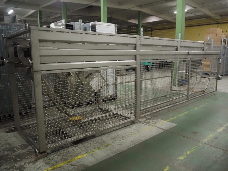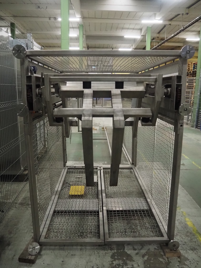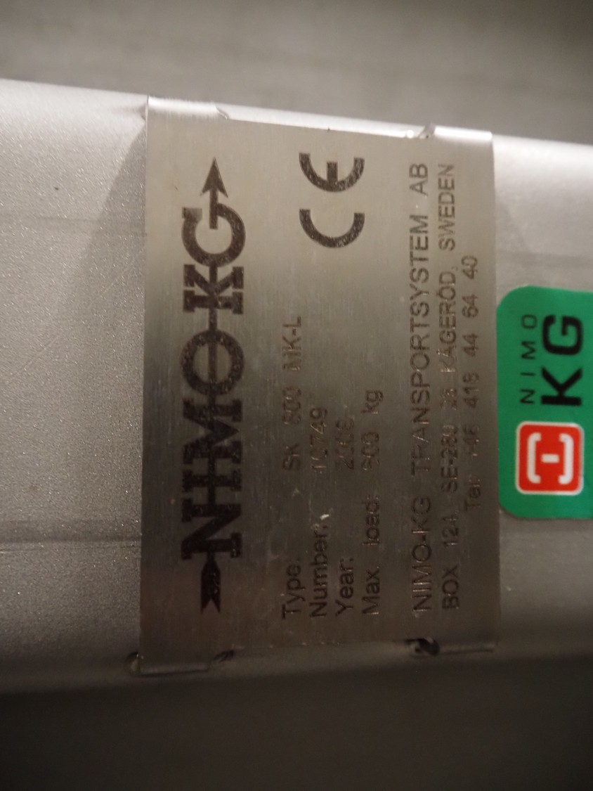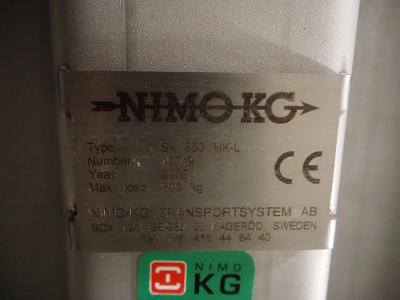 Nimo KG lifter for pallet boxes, type: SK 800 MK-L, number: 10749, year of construction: 2008, maximum loading capacity: 800 kg, lifting height: 6000 mm, total dimensions: 1760 mm x 1850 mm x 7250 mm.