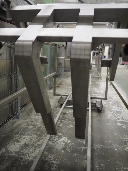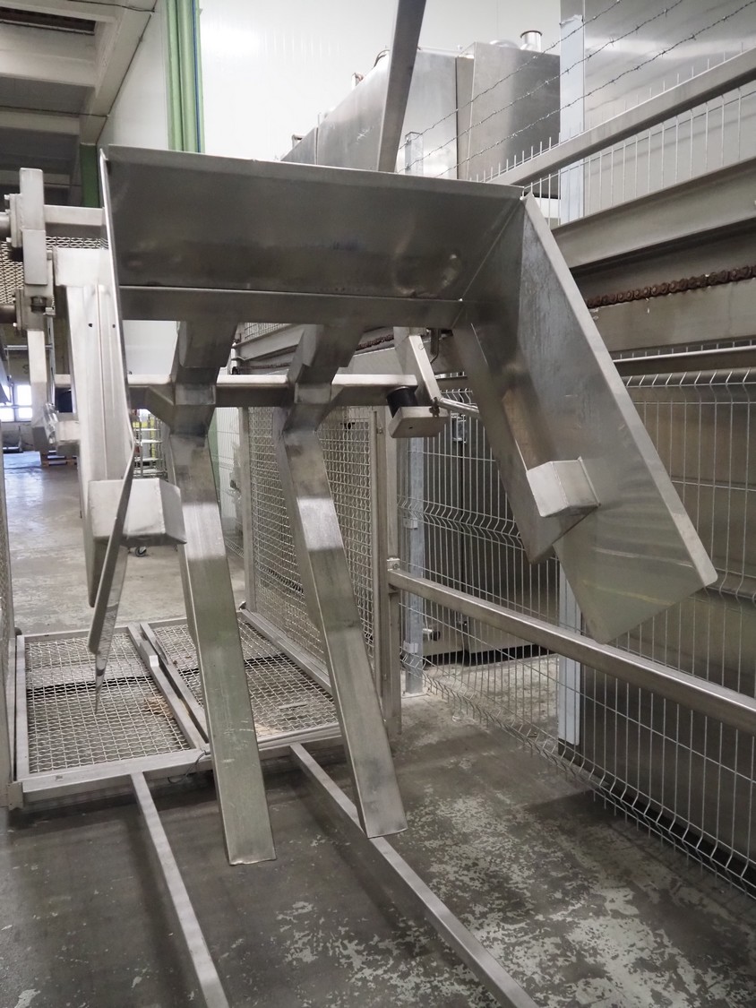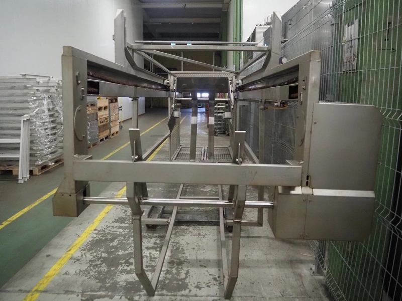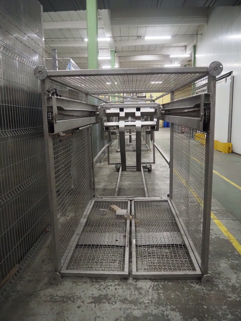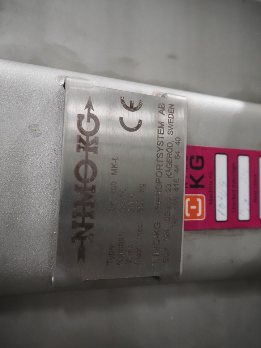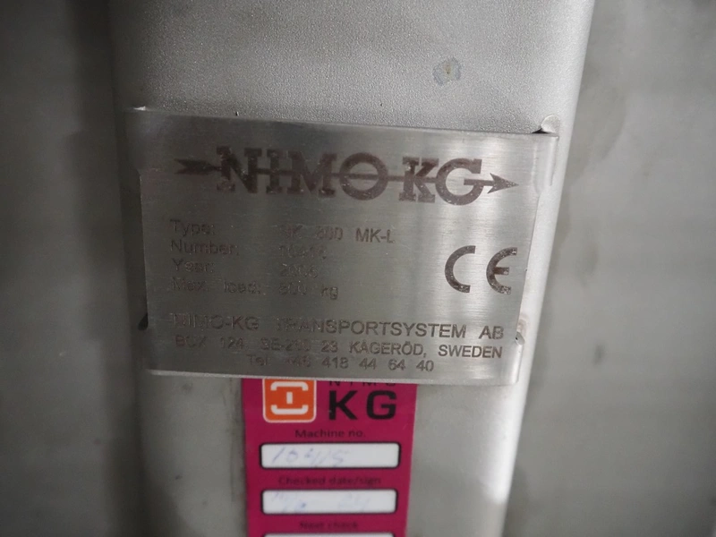 Nimo KG lifter for pallet boxes, type: SK 800 MK-L, number: 10415, year of construction: 2006, maximum loading capacity: 800 kg, lifting height: 6000 mm, total dimensions: 1760 mm x 1850 mm x 7250 mm.