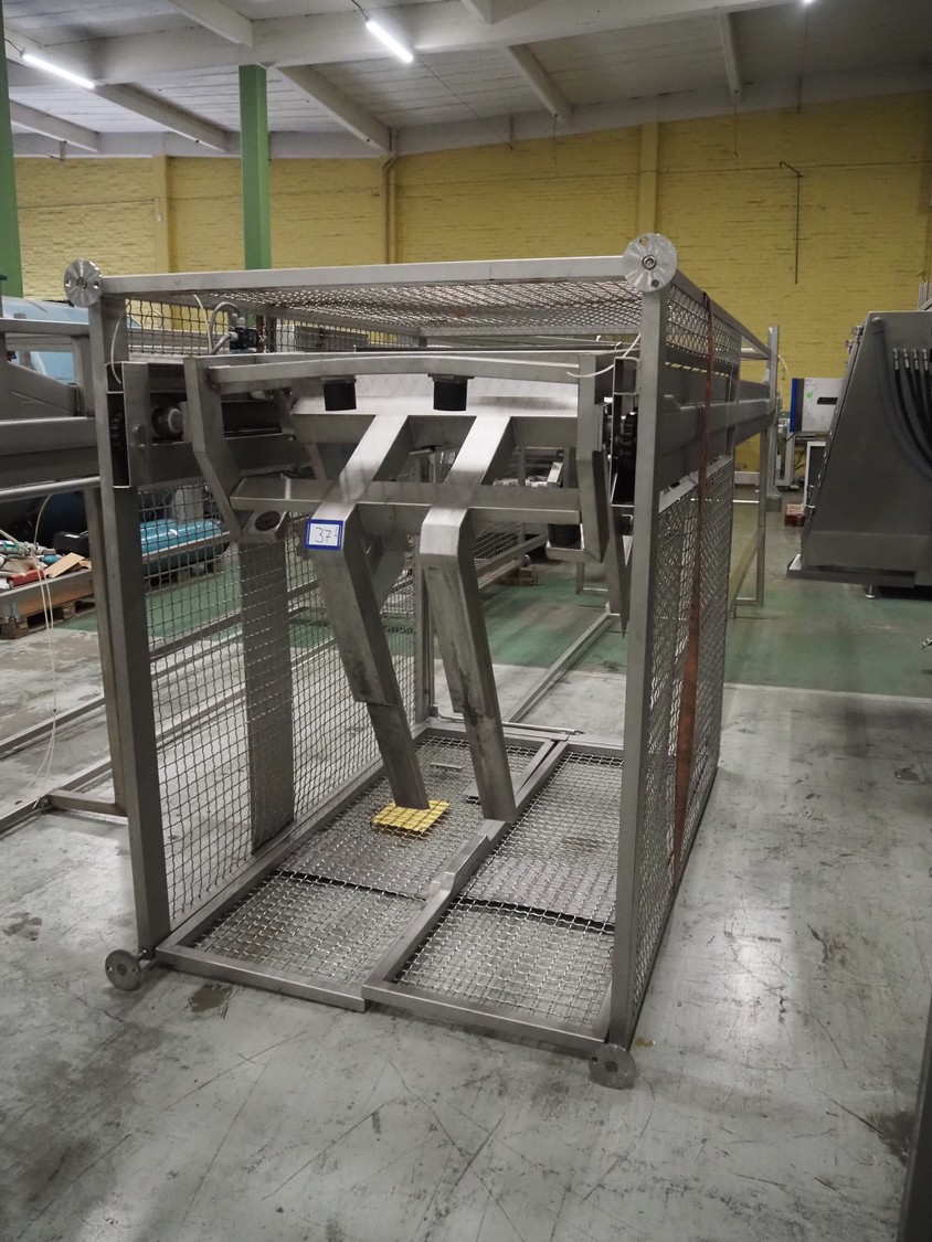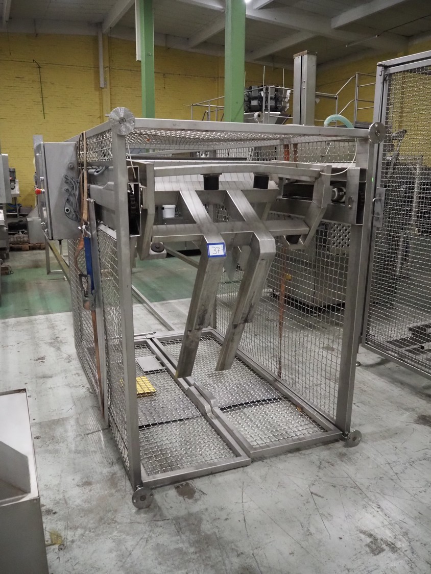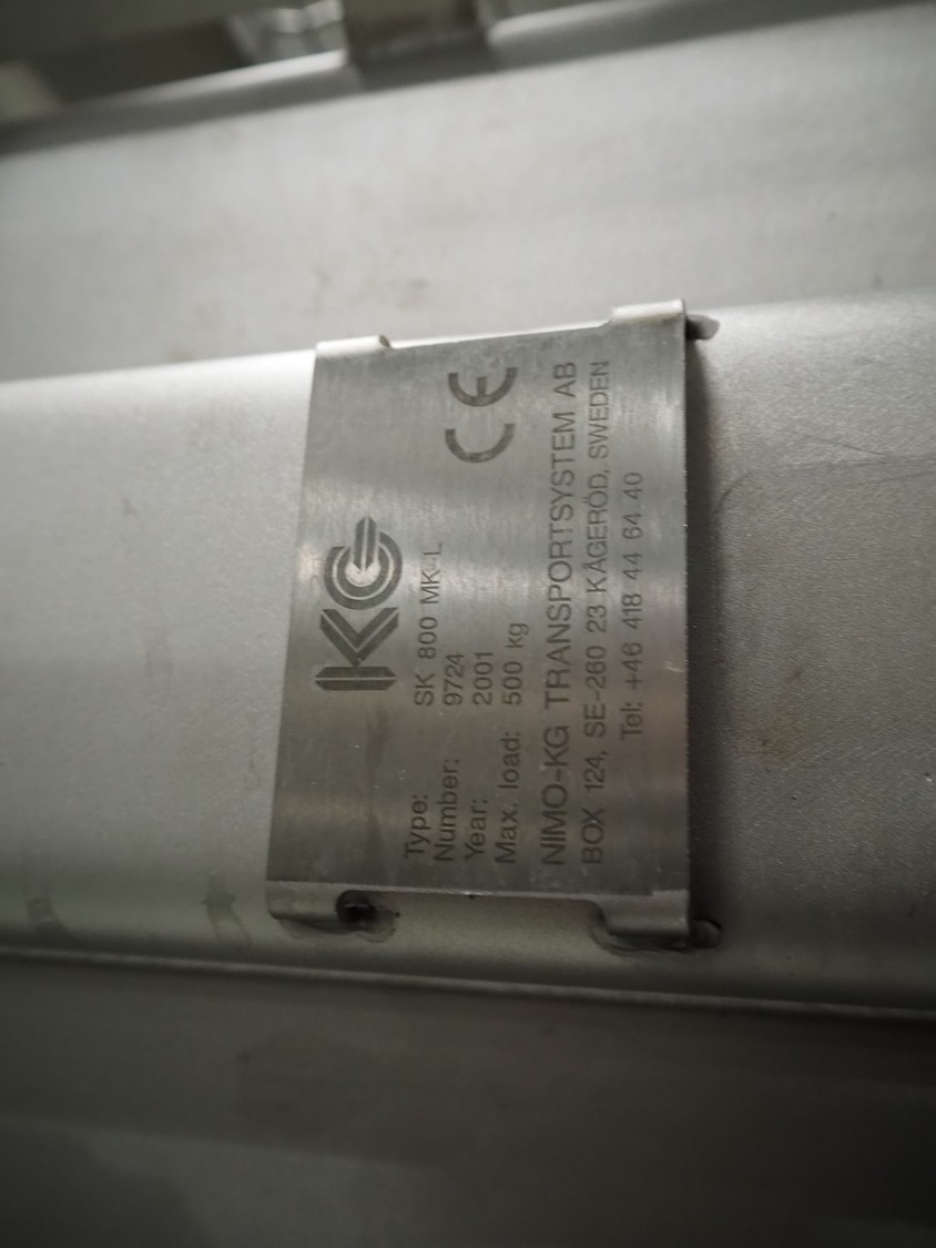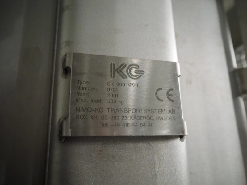 Nimo KG lifter for pallet boxes, type: SK 800 MK-L, number: 9724, year of construction: 2001, maximum loading capacity: 500 kg, lifting height: 6000 mm, total dimensions: 1760 mm x 1850 mm x 7250 mm.
