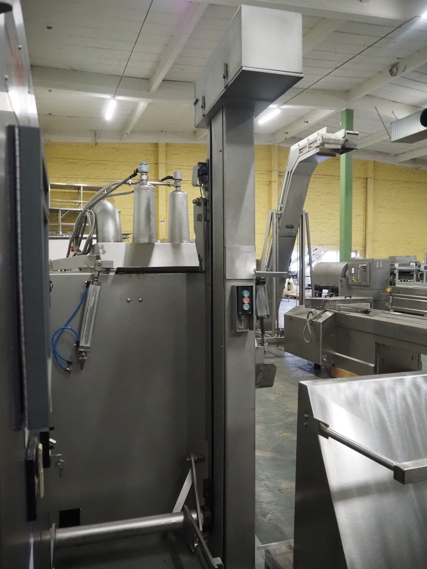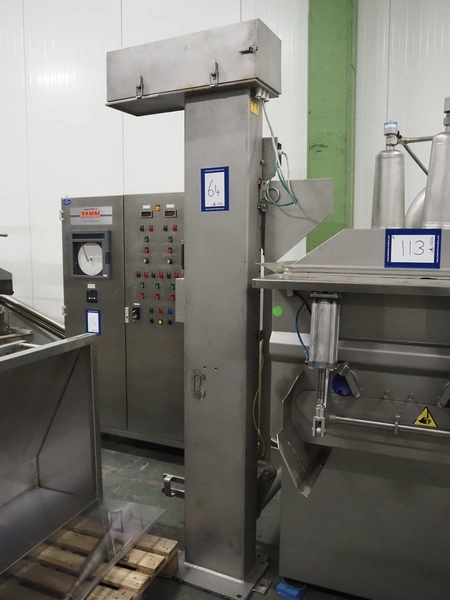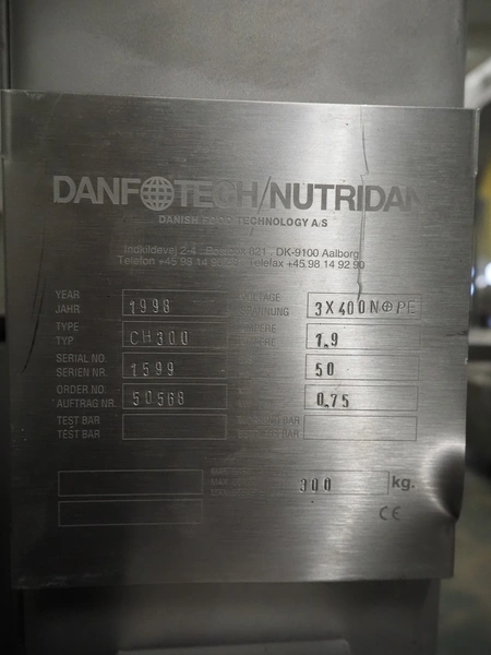 Danfotech lifter for 200 liter meat bins, type: CH300, serial number: 1599, year of construction: 1998, 400 V, 3 Ph, 50 Hz, 1.9 A, 0.75 kW, maximum capacity: 300 kg, lifting height: 1600 mm, total dimensions: 1100 mm x 1200 mm x 2600 mm.