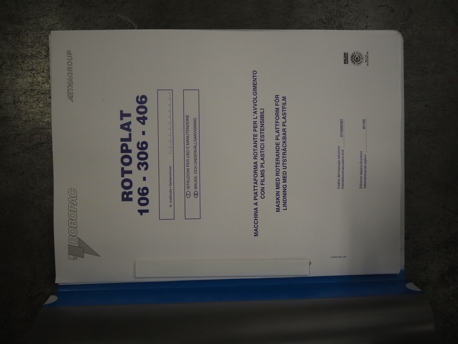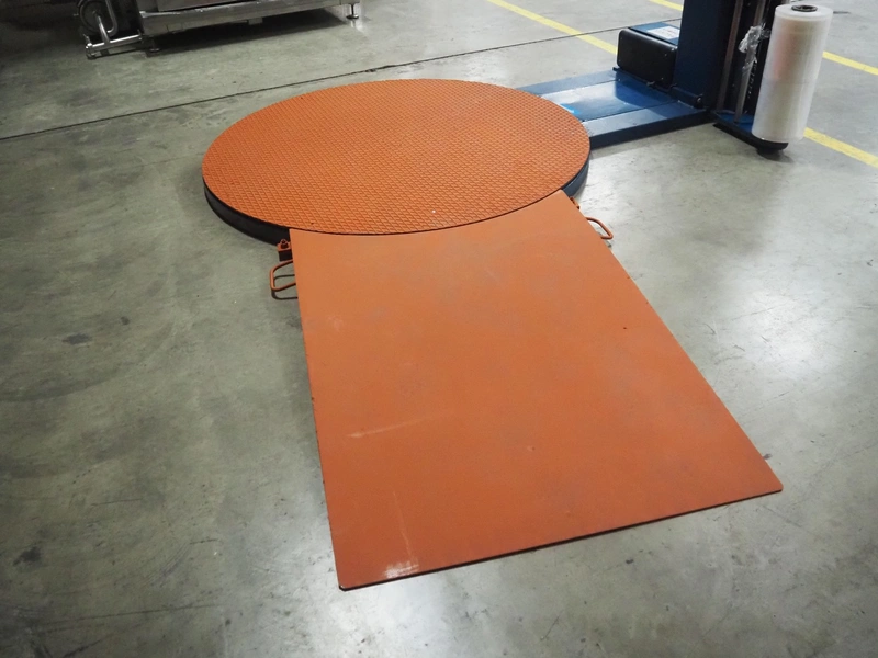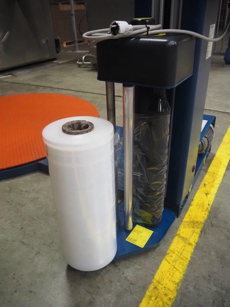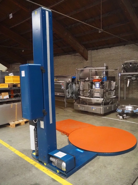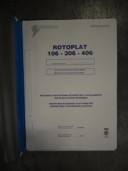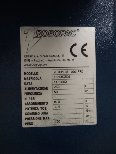 Robopac pallet wrapper, model: ROTOPLAT 106/FRD, serial number: KN/053506, year of construction: 11/2002, machine weight: 450 kg, 230 V, 50 Hz, 5 A, 1.4 kW, turning platform: Ø 1640 mm, total dimensions: 2900 mm x 2480 mm x 2680 mm.