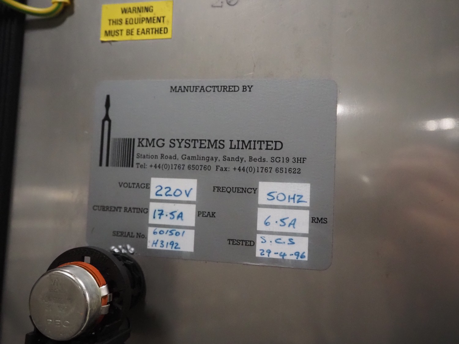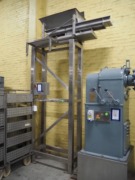 KMG vibrating gutter, number: 601501, 220 V, 50 Hz, 12.5 A, gutter length: 1700 mm, gutter width: 200 mm, total dimensions: 1900 mm x 800 mm x 3650 mm.