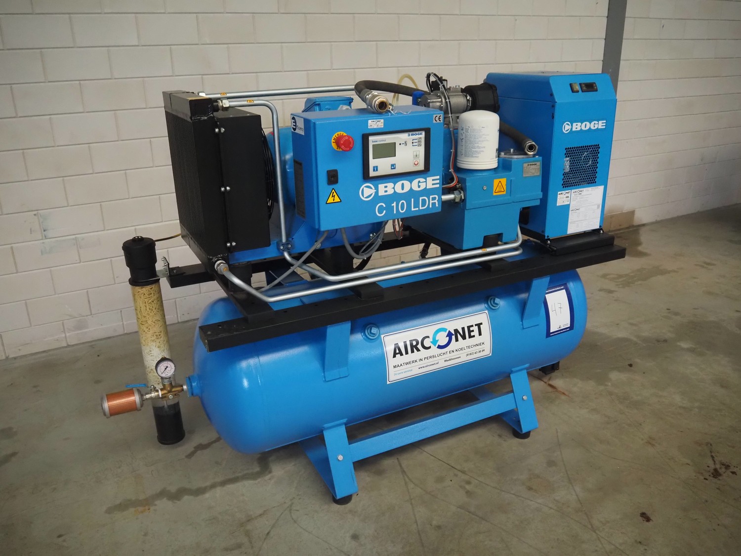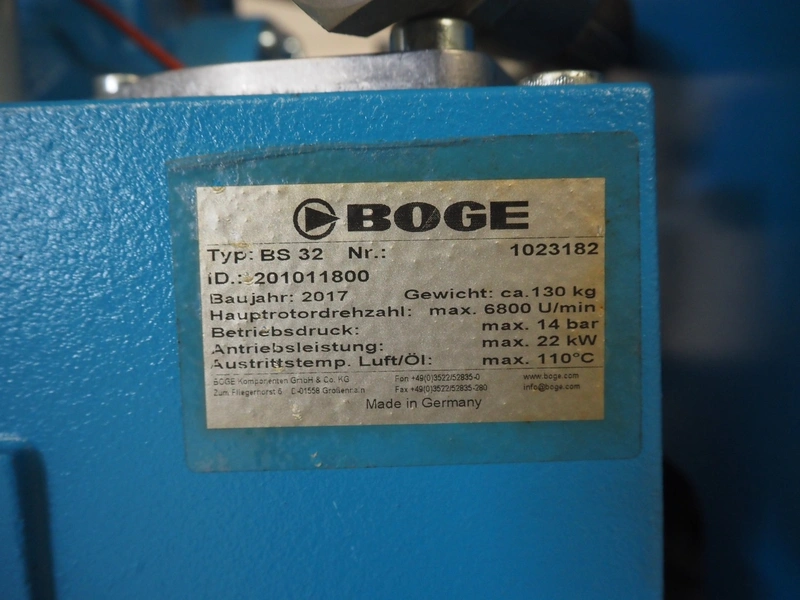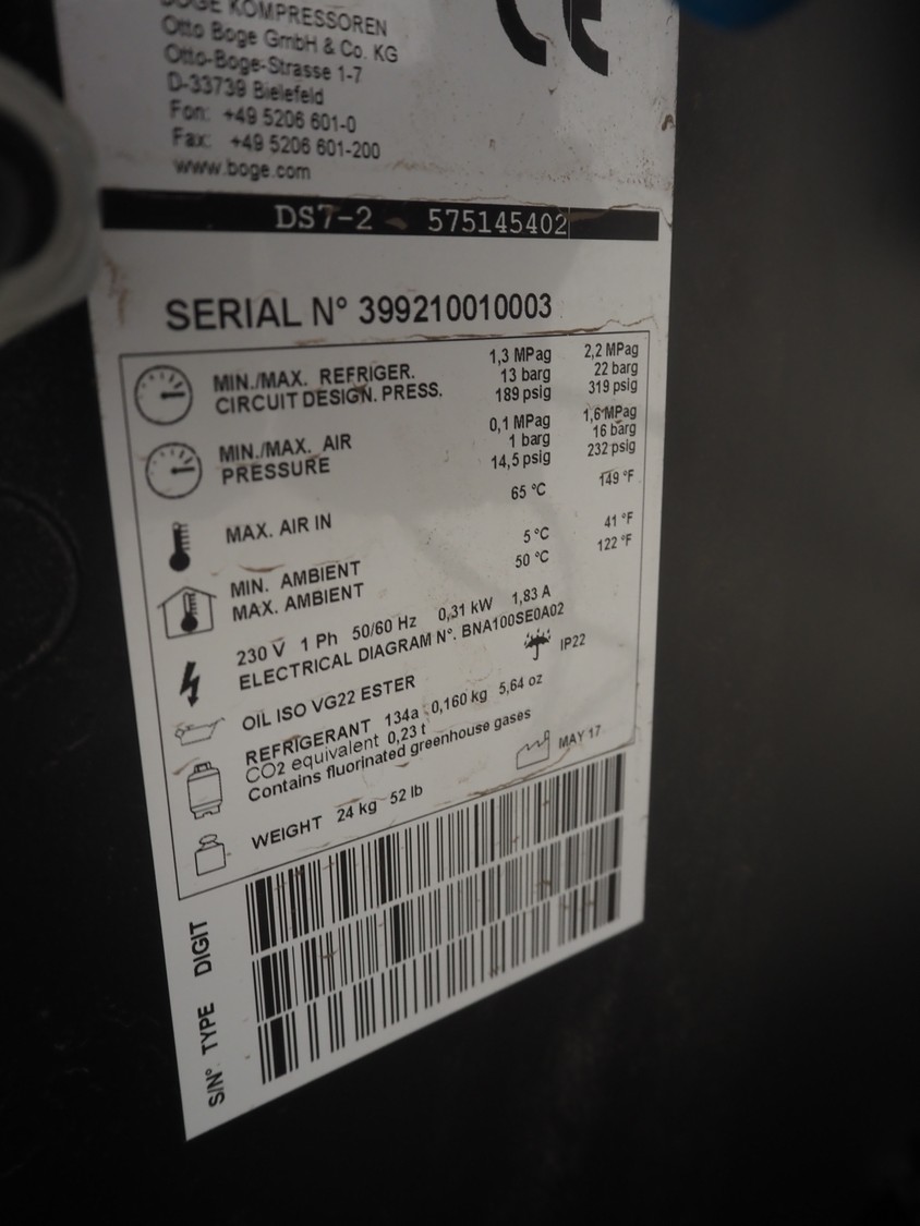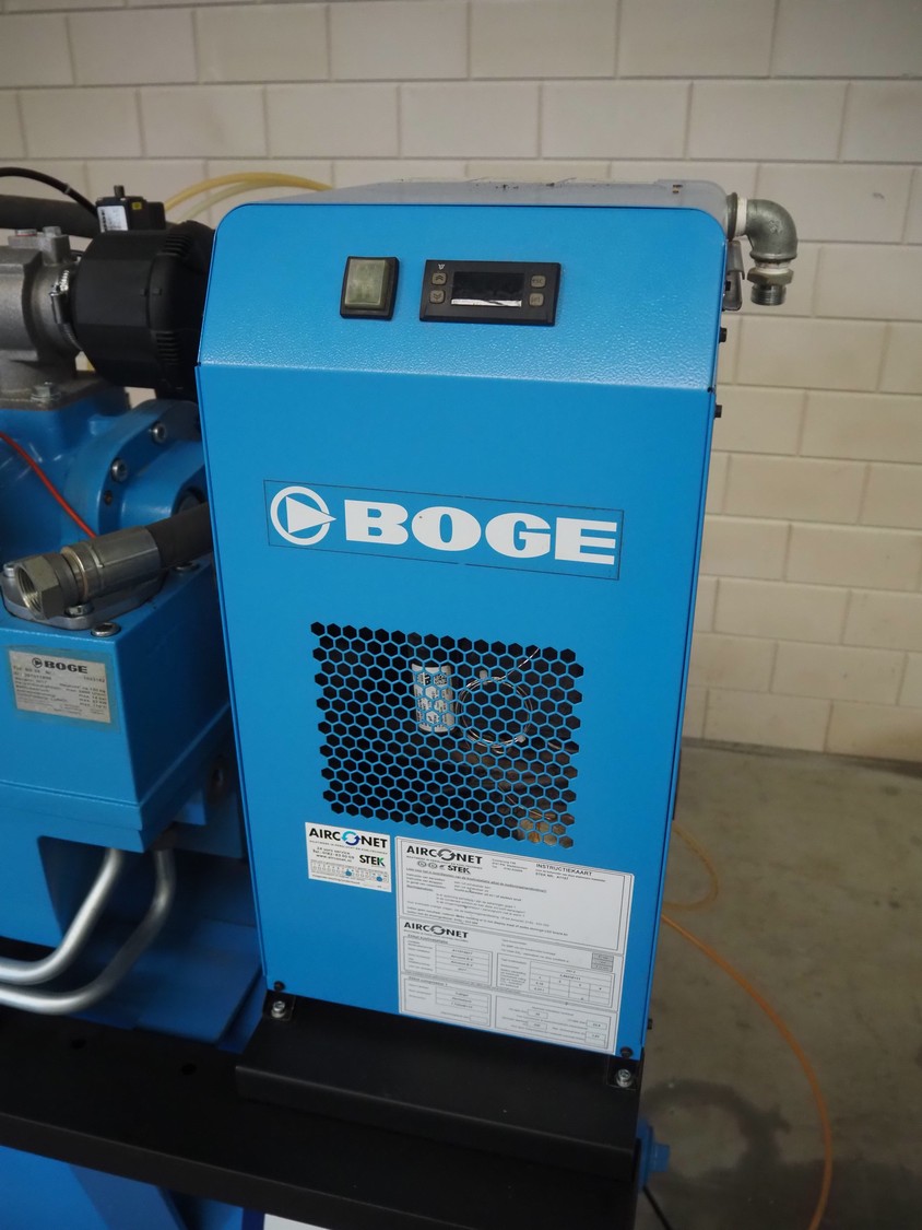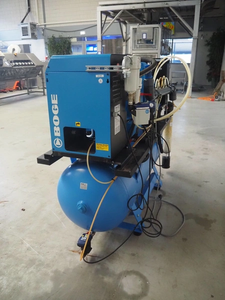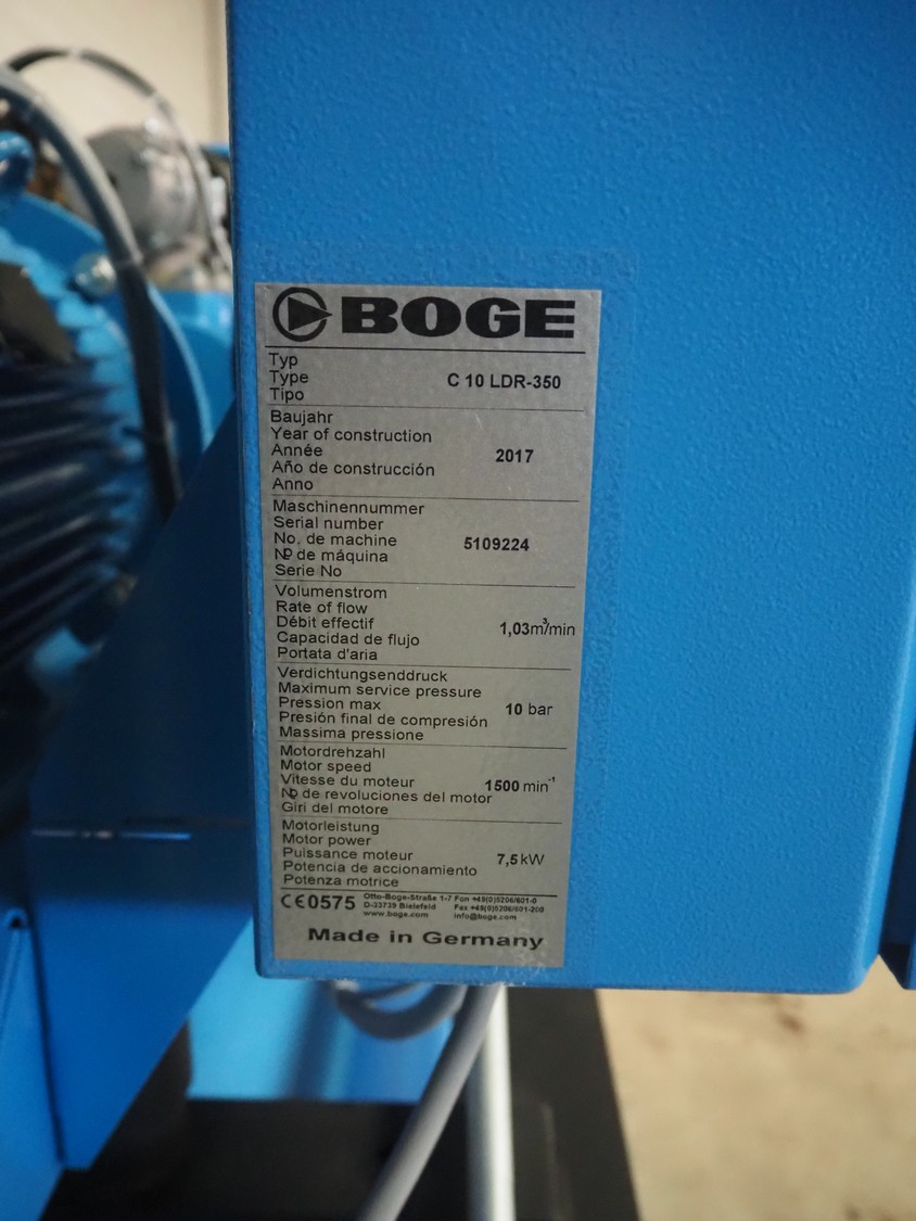 Boge screw compressor with dryer and pressure vessel, compressor type: C 10 LDR-350, serial number: 5109224, year of construction: 2017, 7.5 kW, type dryer: DS7-1, serial number: 399210010003, 230 V, 1 Ph, 50/60 Hz, 1.83 A, 0.31 kW, refrigerant: 134a, 0.160 kg, dimensions: 2000 mm x 750 mm x 1400 mm.