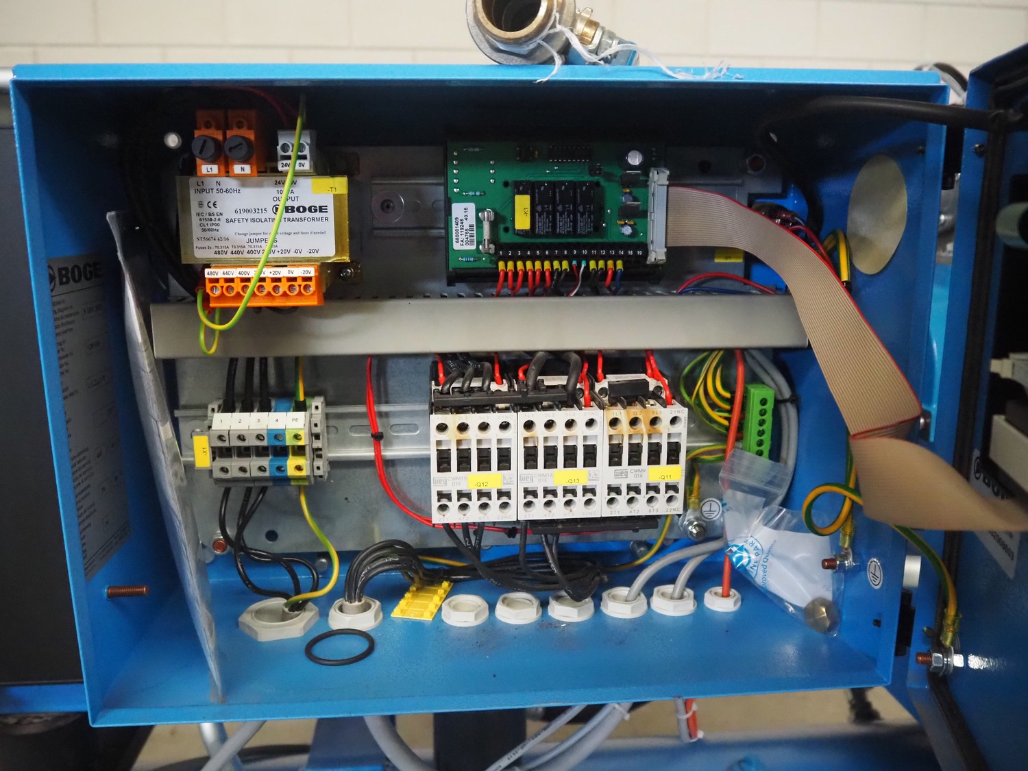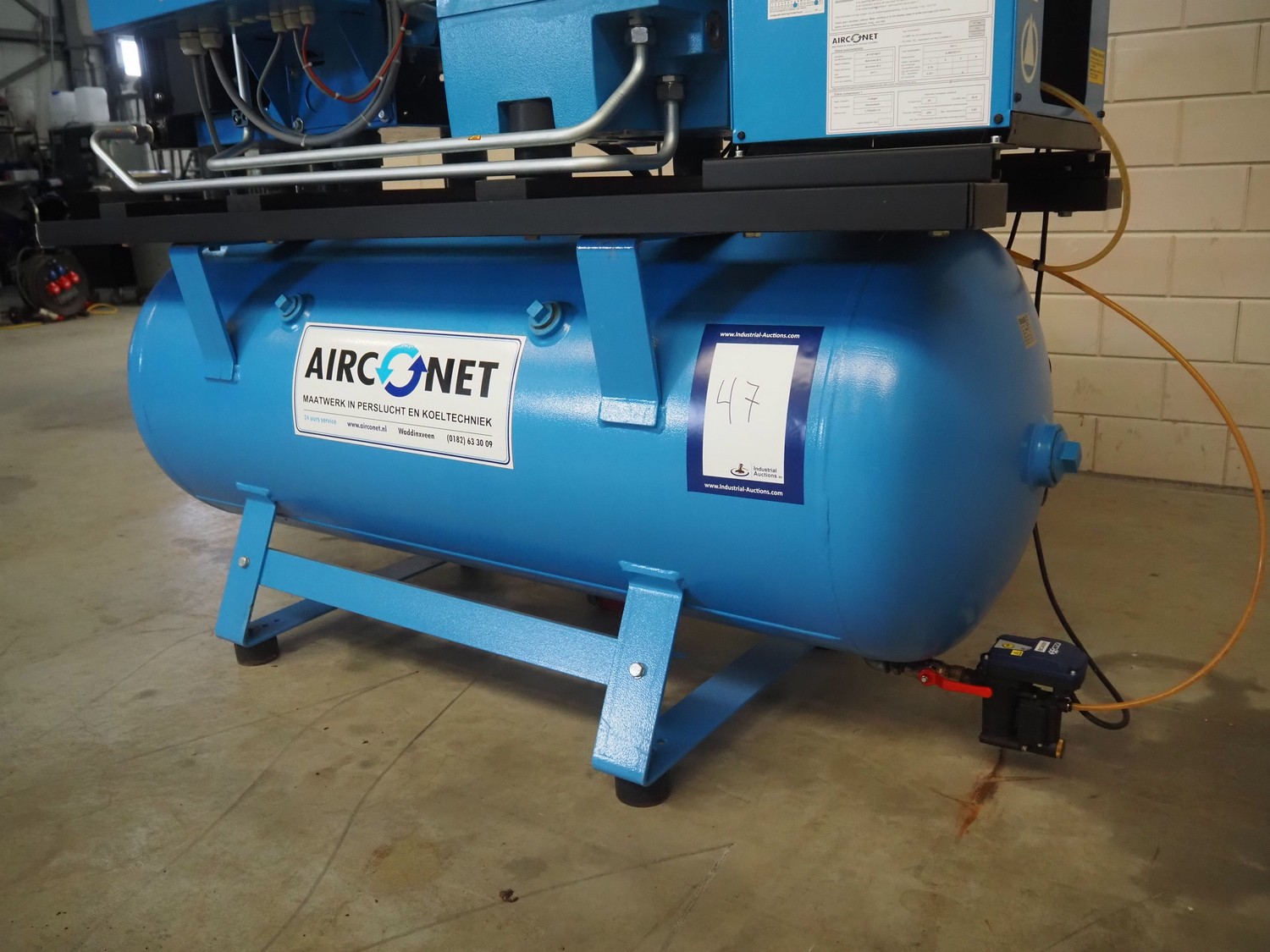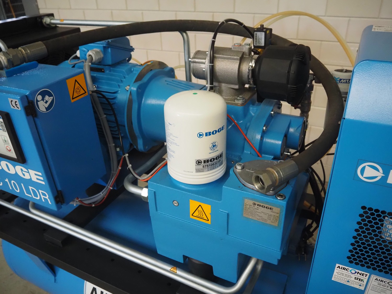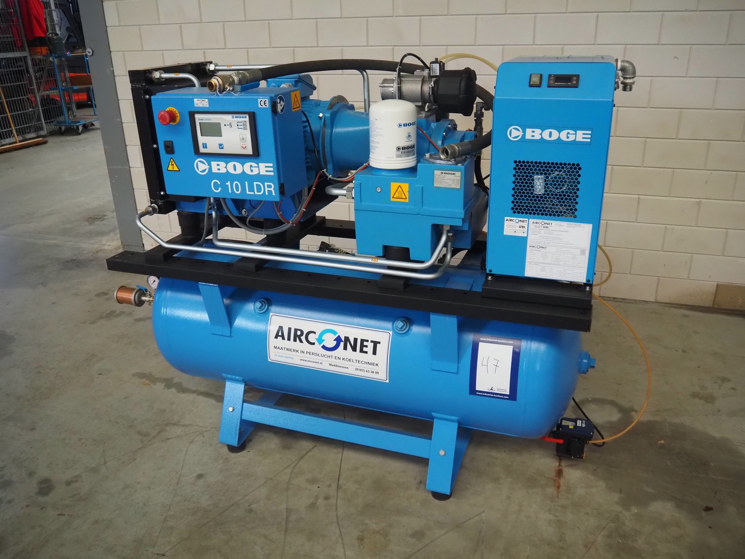 Boge screw compressor with dryer and pressure vessel, compressor type: C 10 LDR-350, serial number: 5109224, year of construction: 2017, 7.5 kW, type dryer: DS7-1, serial number: 399210010003, 230 V, 1 Ph, 50/60 Hz, 1.83 A, 0.31 kW, refrigerant: 134a, 0.160 kg, dimensions: 2000 mm x 750 mm x 1400 mm.