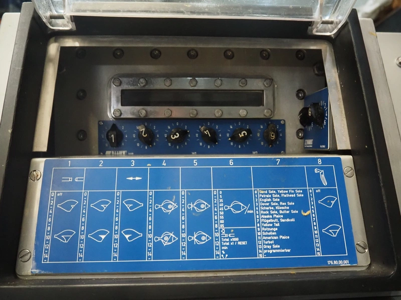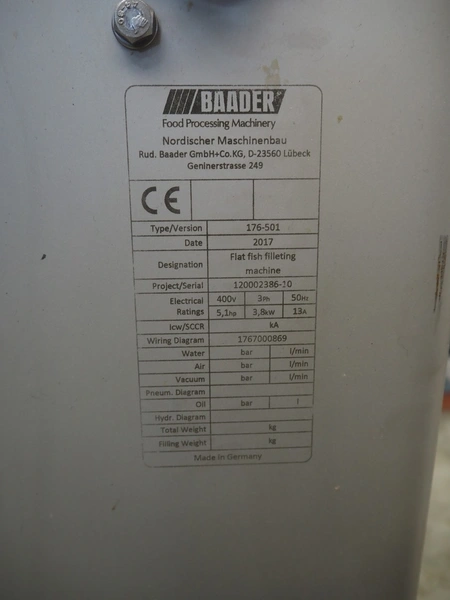 Baader flat fish filleting machine, type: 176-501, serial number: 120002386-10, year of construction: 2017, 400 V, 3 Ph, 50 Hz, 13 A, 3,8 kW, dimensions: 2350 mm x 2100 mm x 1900 mm.