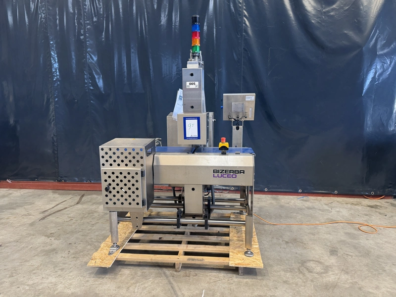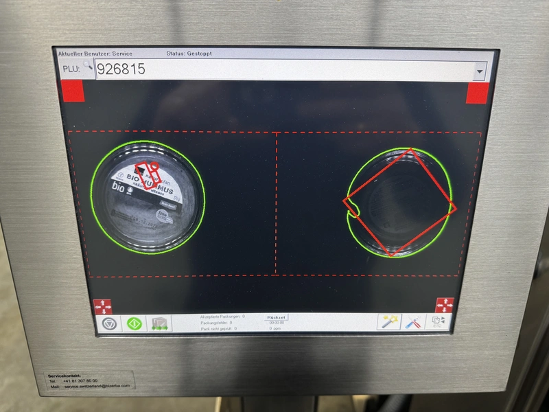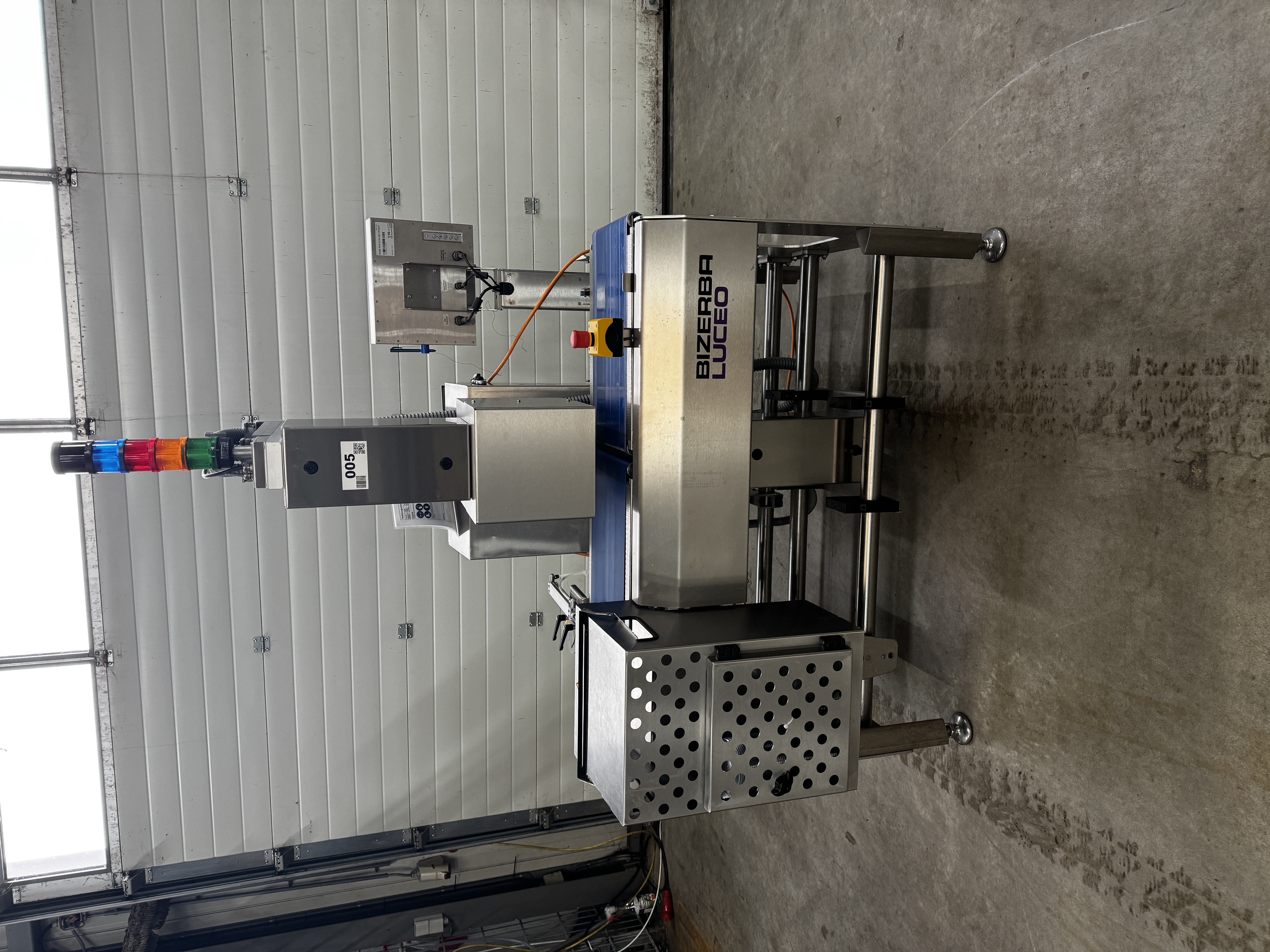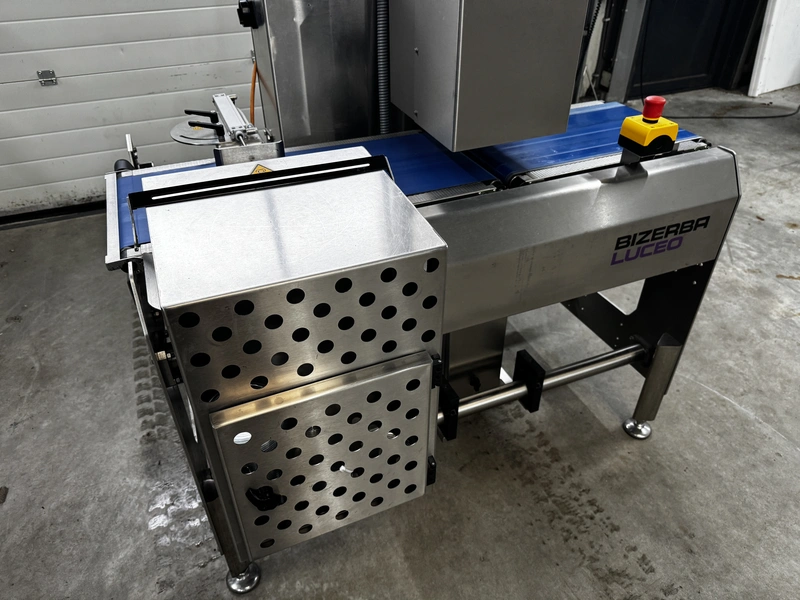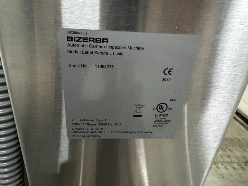 Bizerba labelling machine with ejector, model: Label Secure L Basic, serial number: 11698075, year of construction: 2019, 230 V, 1 Ph, 50/60 Hz, 10 A, dimensions: 1300 mm x 1200 mm x 2100 mm.