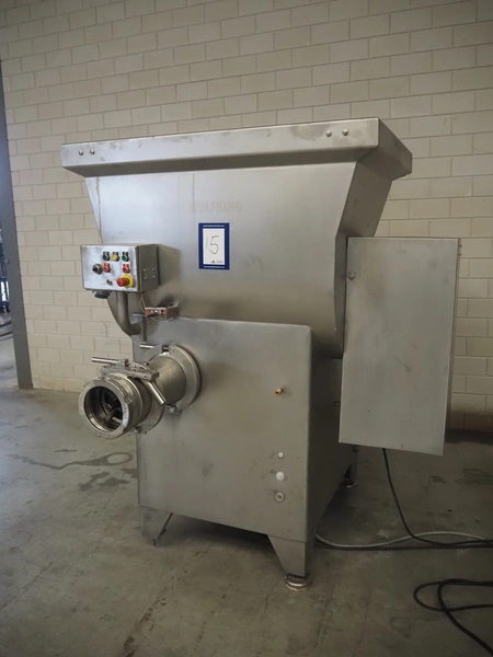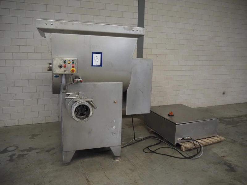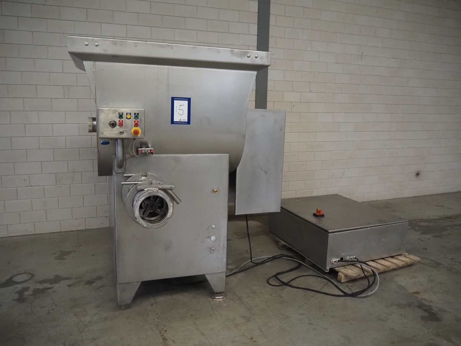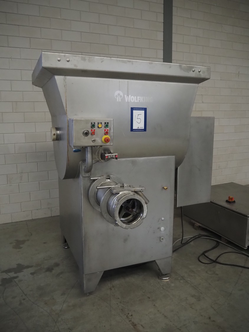 Wolfking mixer-grinder, type: SFG 850/200, 22 kW, plate diameter: 200 mm, total dimensions: 1670 mm x 1600 mm x 2030 mm. Dimensions switch cabinet: 1200 mm x 100 mm x 450 mm. Including plates and knife.