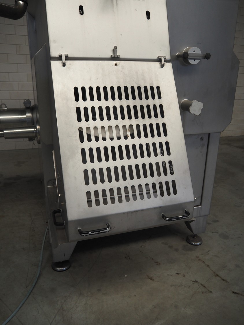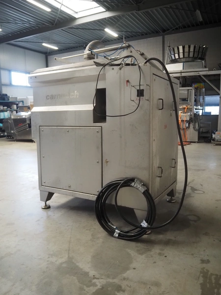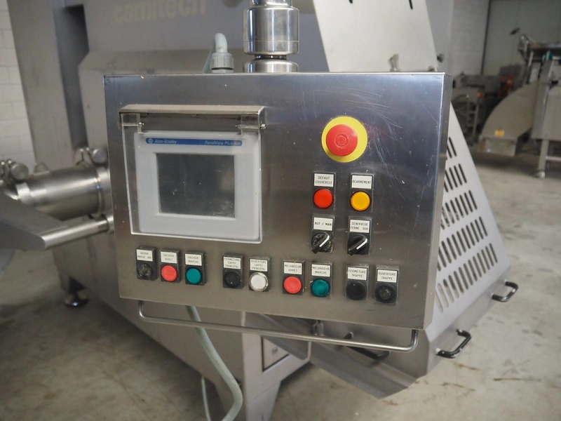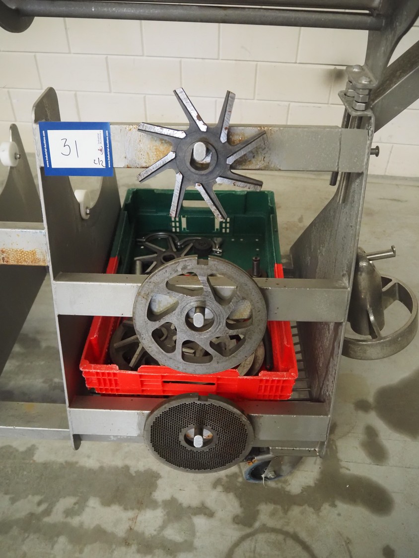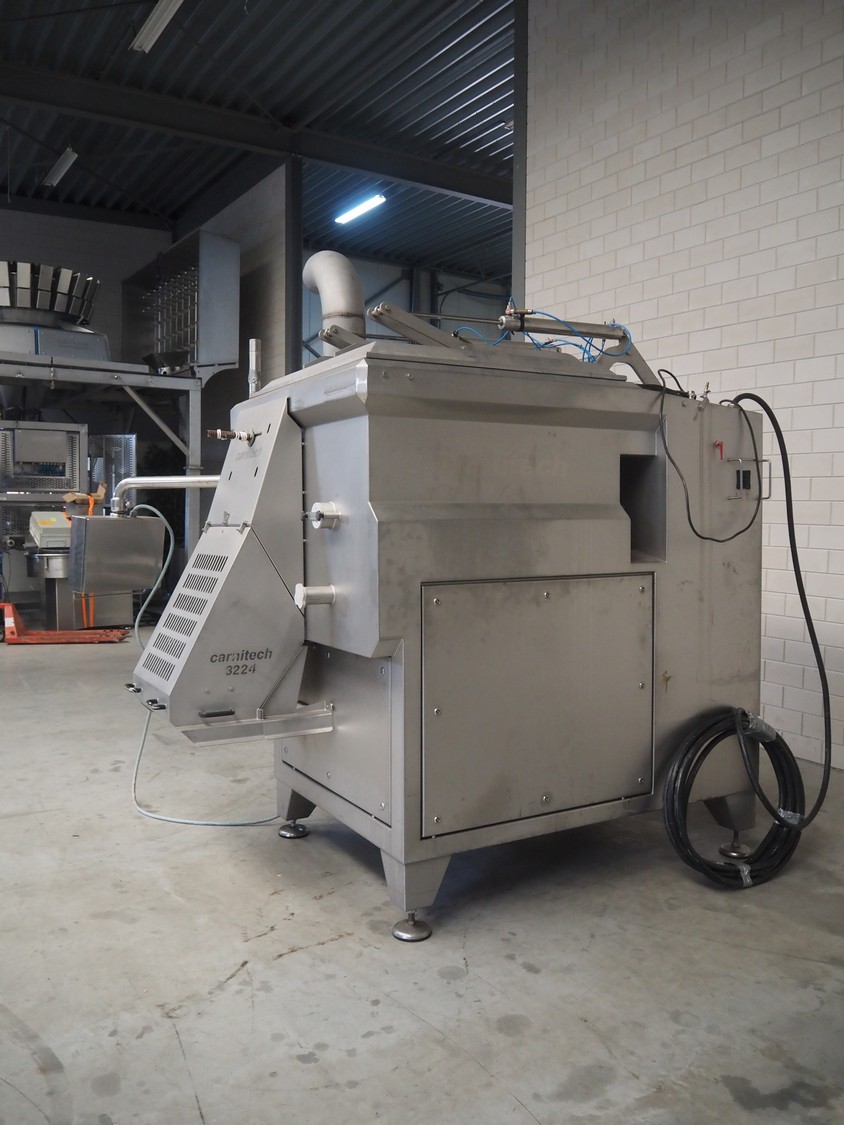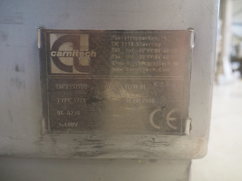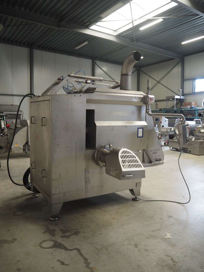 Carnitech double shaft paddle mixer-grinder, type: 3224, number: 2391900, year of construction: 2004, 400 V, 3 Ph, plate diameter: 210 mm, total dimensions: 2700 mm x 2260 mm x 2200 mm. Including s/s trolley with knives and plates, dimensions: 1010 mm x 700 mm x 1000 mm.