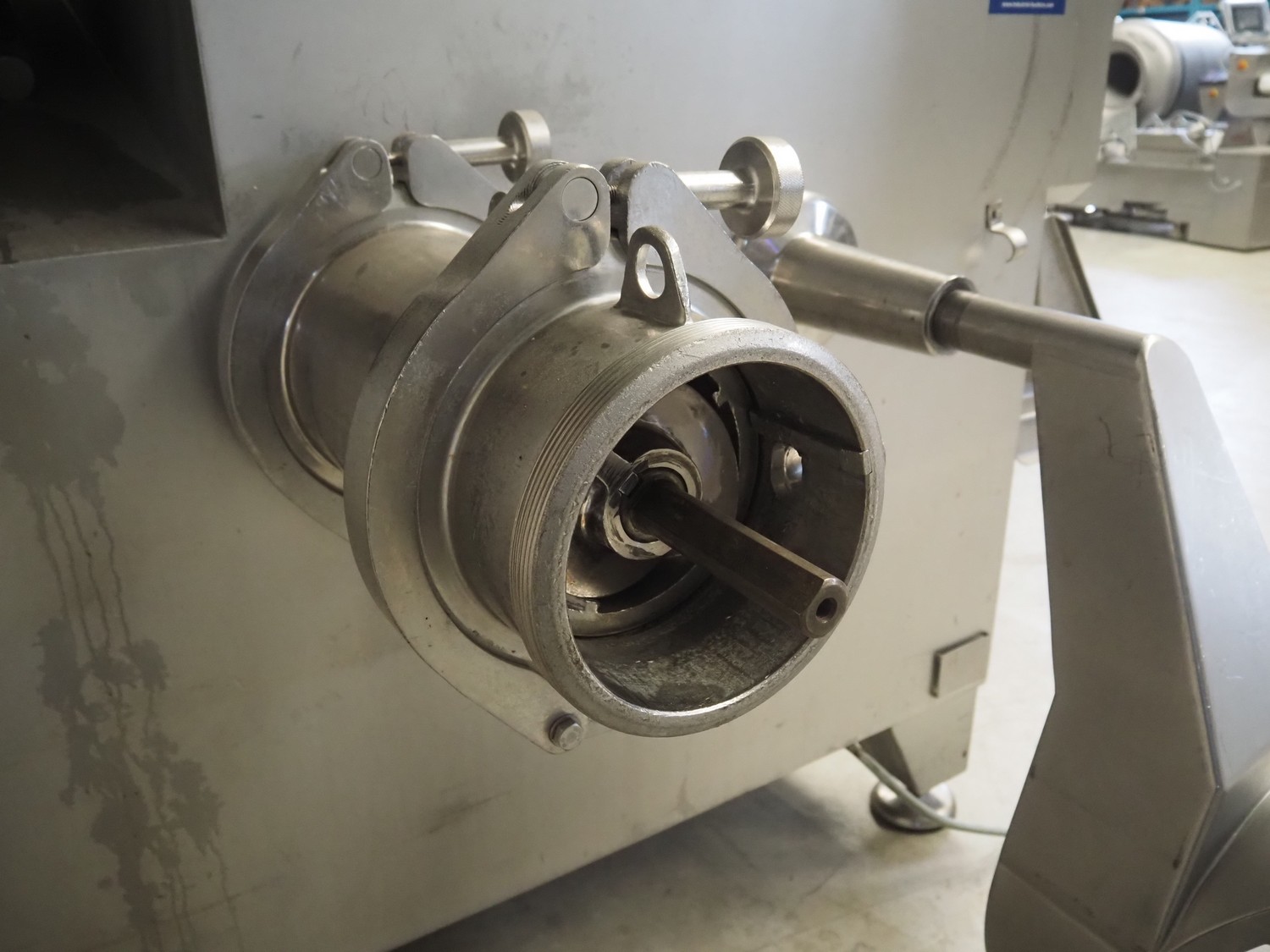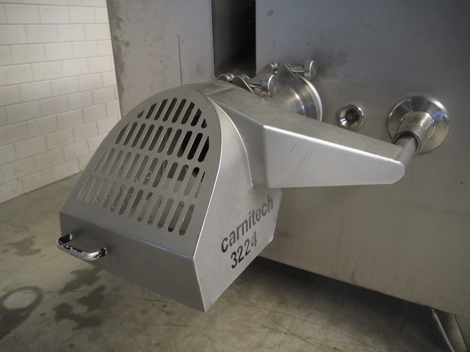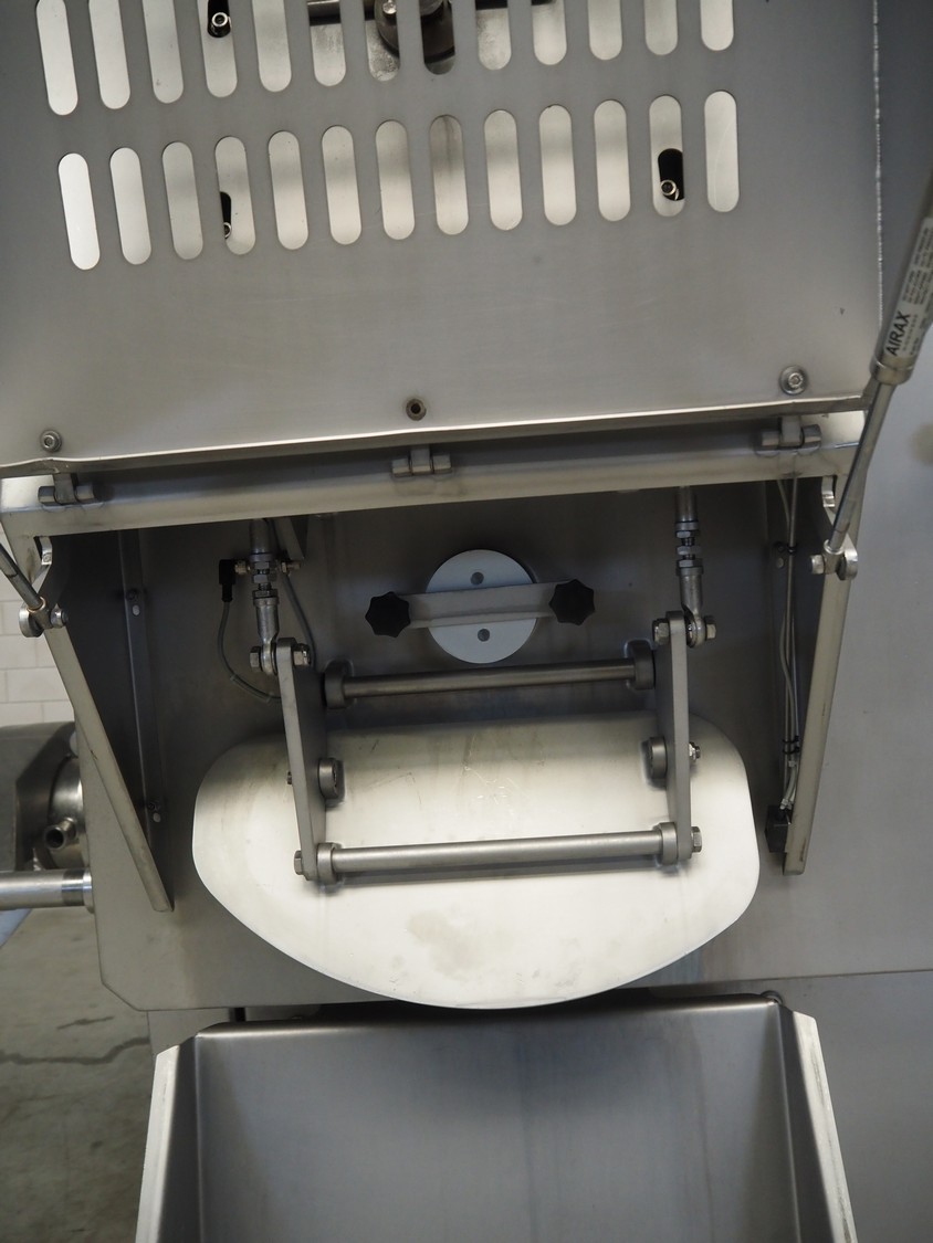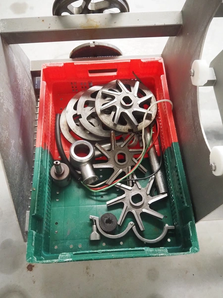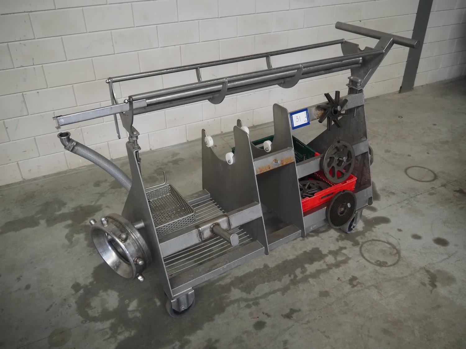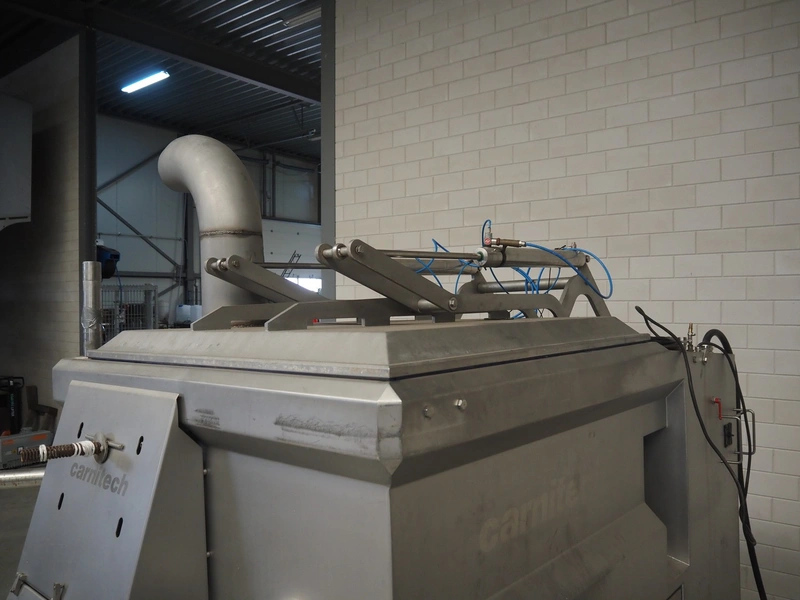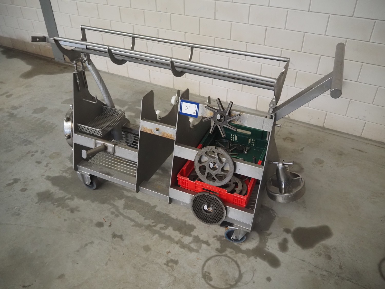 Carnitech double shaft paddle mixer-grinder, type: 3224, number: 2391900, year of construction: 2004, 400 V, 3 Ph, plate diameter: 210 mm, total dimensions: 2700 mm x 2260 mm x 2200 mm. Including s/s trolley with knives and plates, dimensions: 1010 mm x 700 mm x 1000 mm.