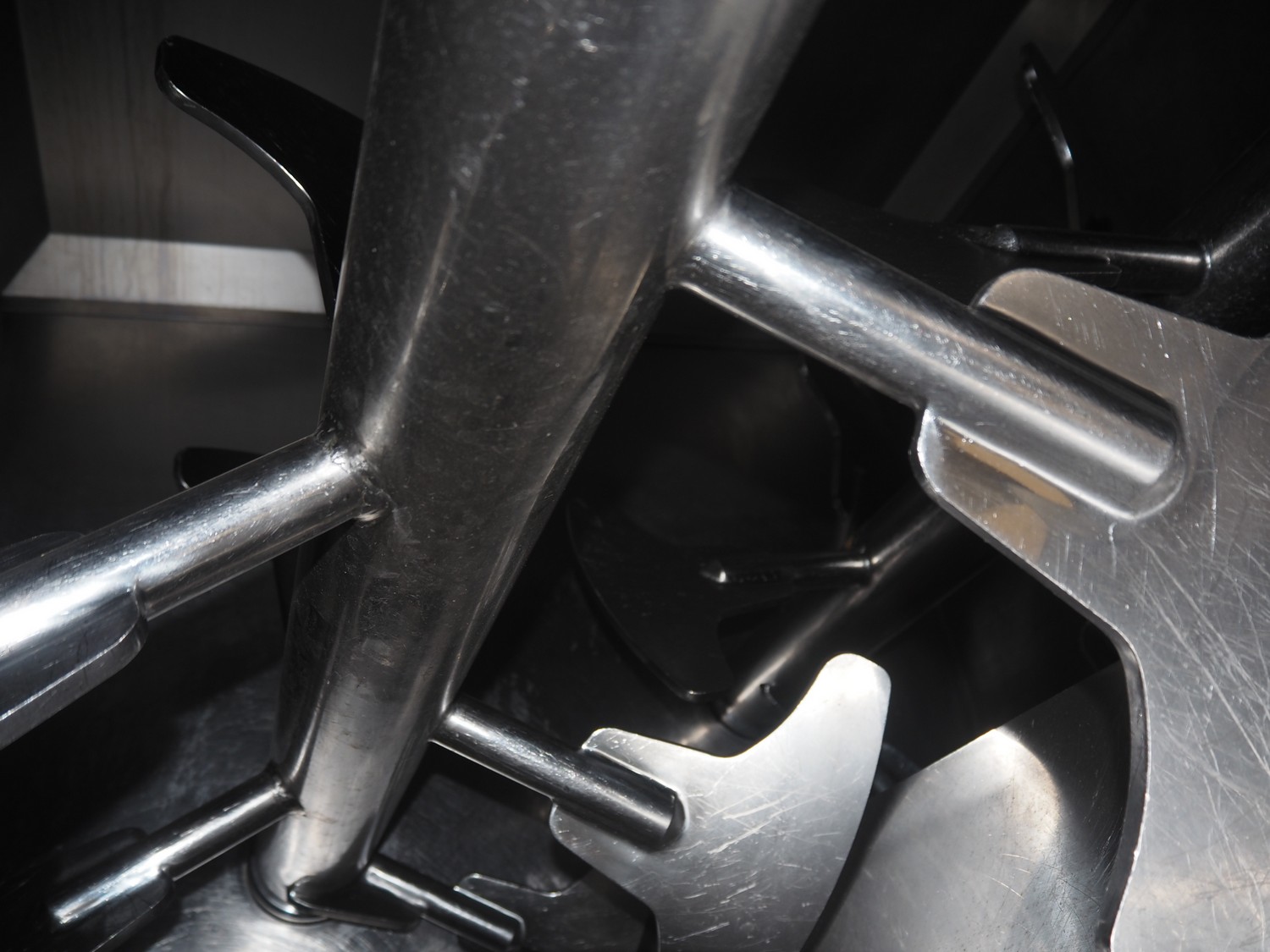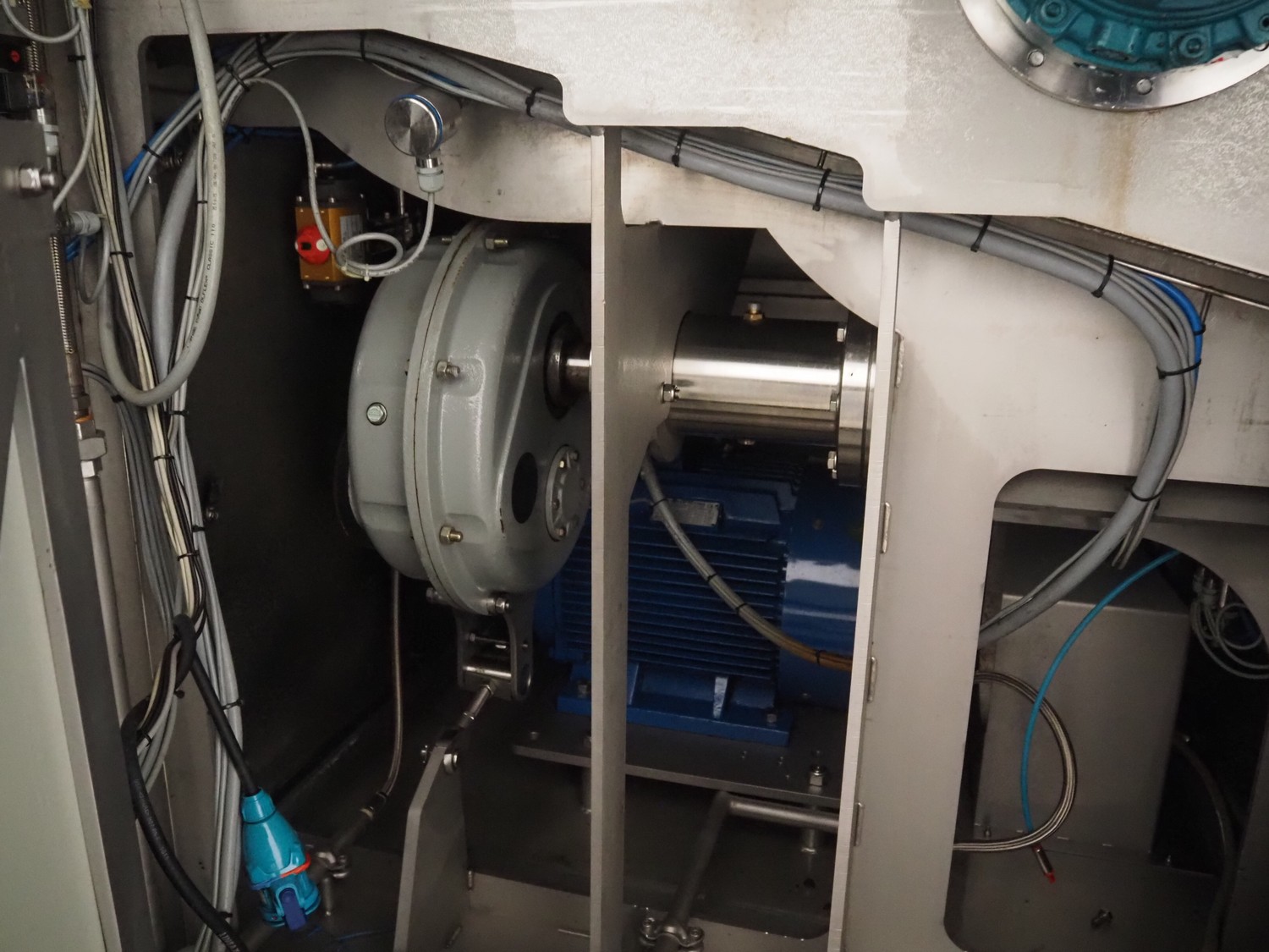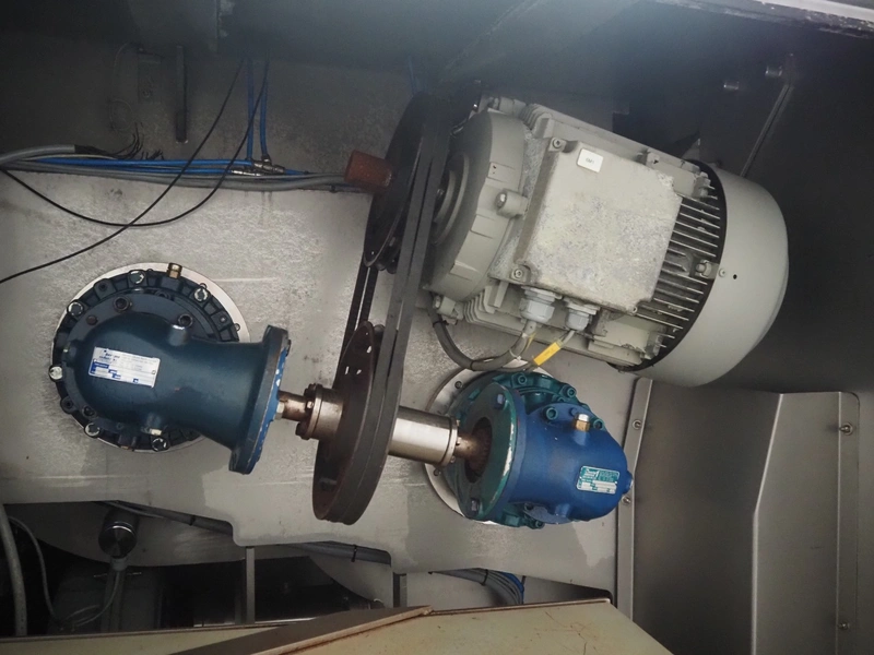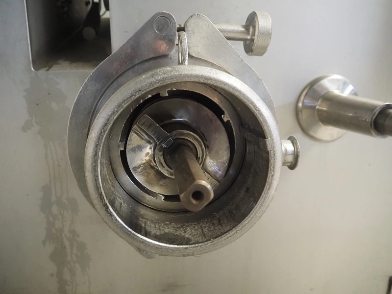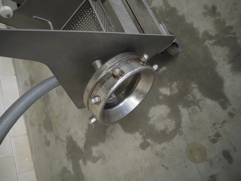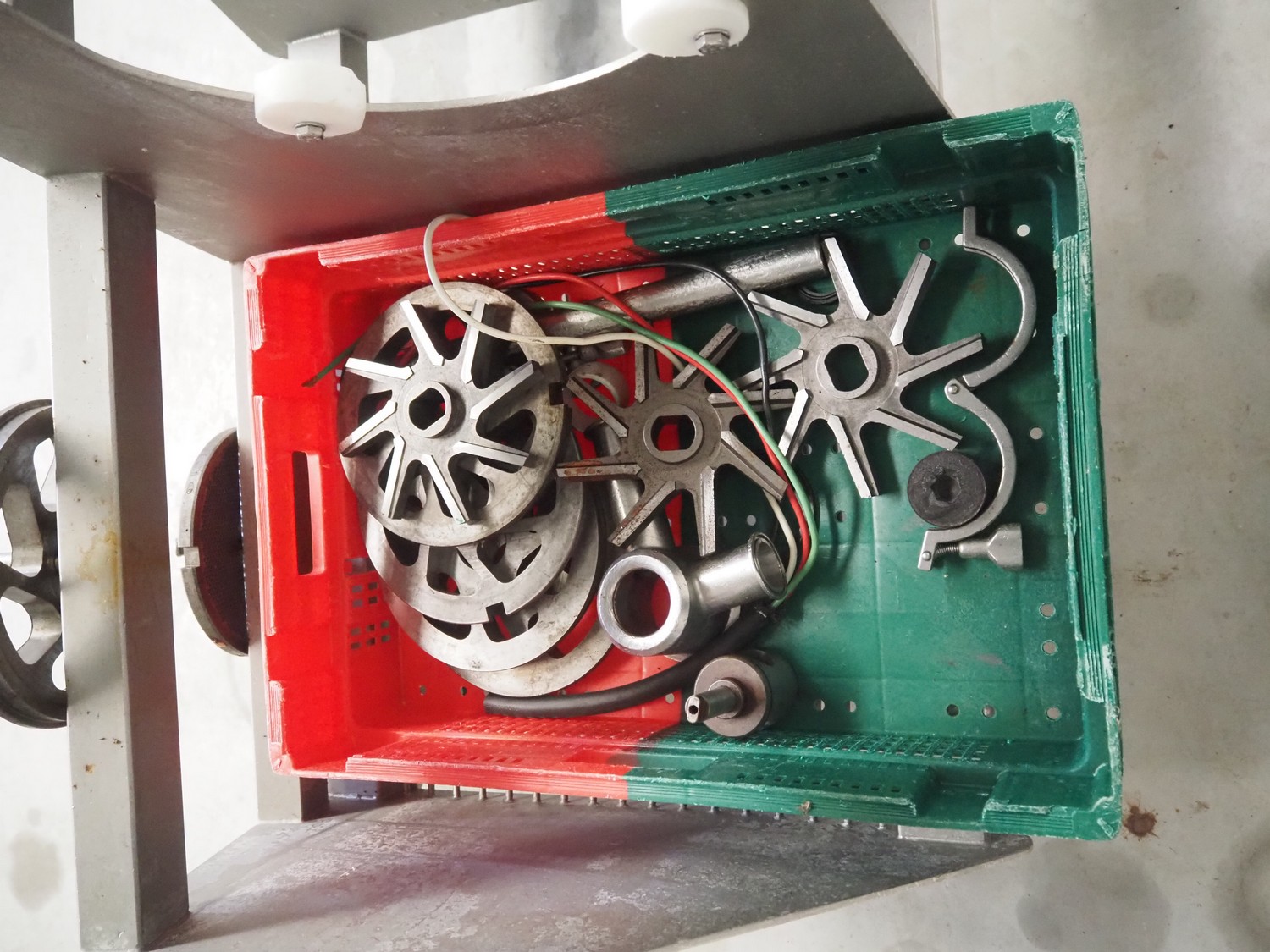 Carnitech double shaft paddle mixer-grinder, type: 3224, number: 2391900, year of construction: 2004, 400 V, 3 Ph, plate diameter: 210 mm, total dimensions: 2700 mm x 2260 mm x 2200 mm. Including s/s trolley with knives and plates, dimensions: 1010 mm x 700 mm x 1000 mm.