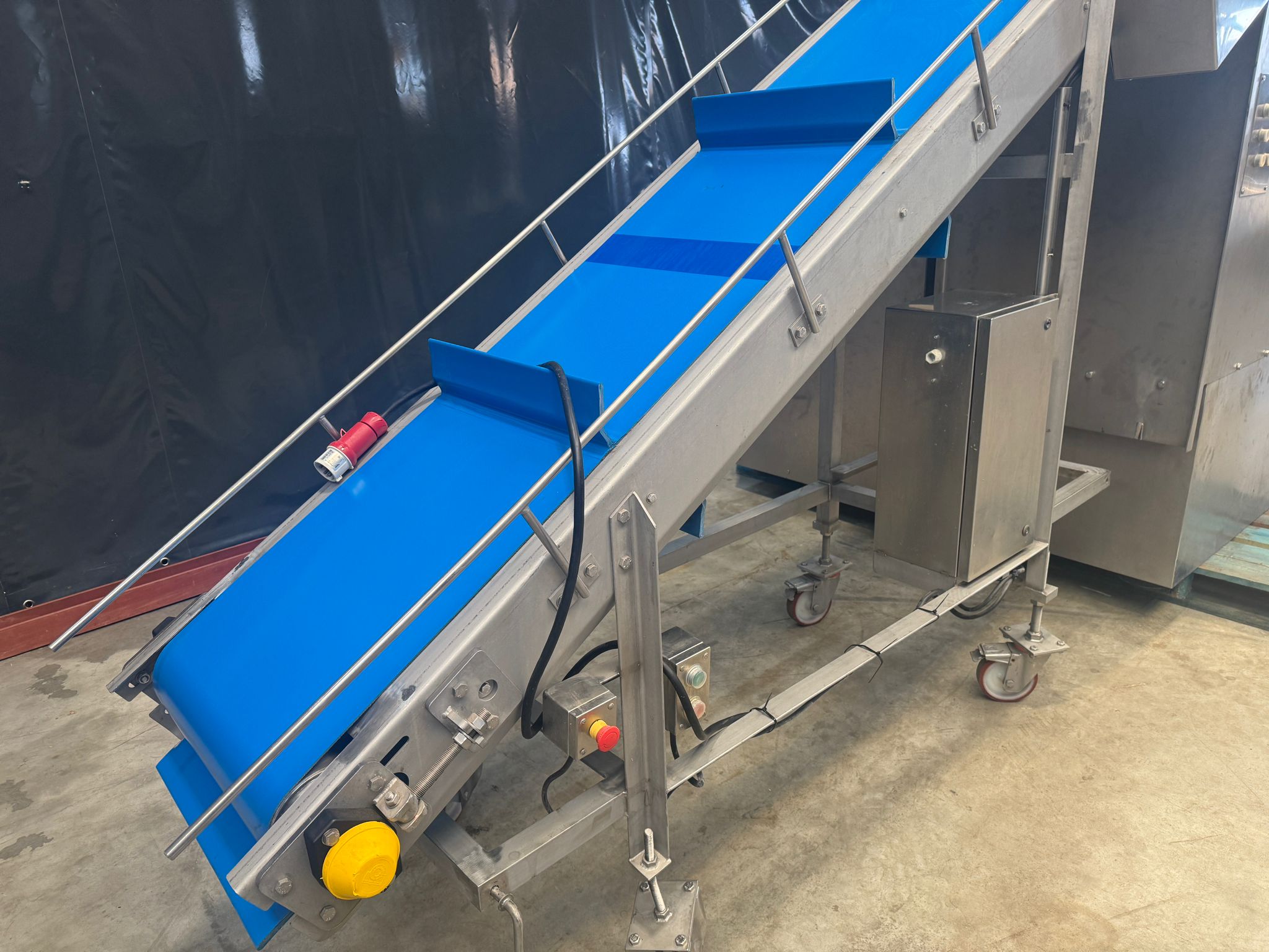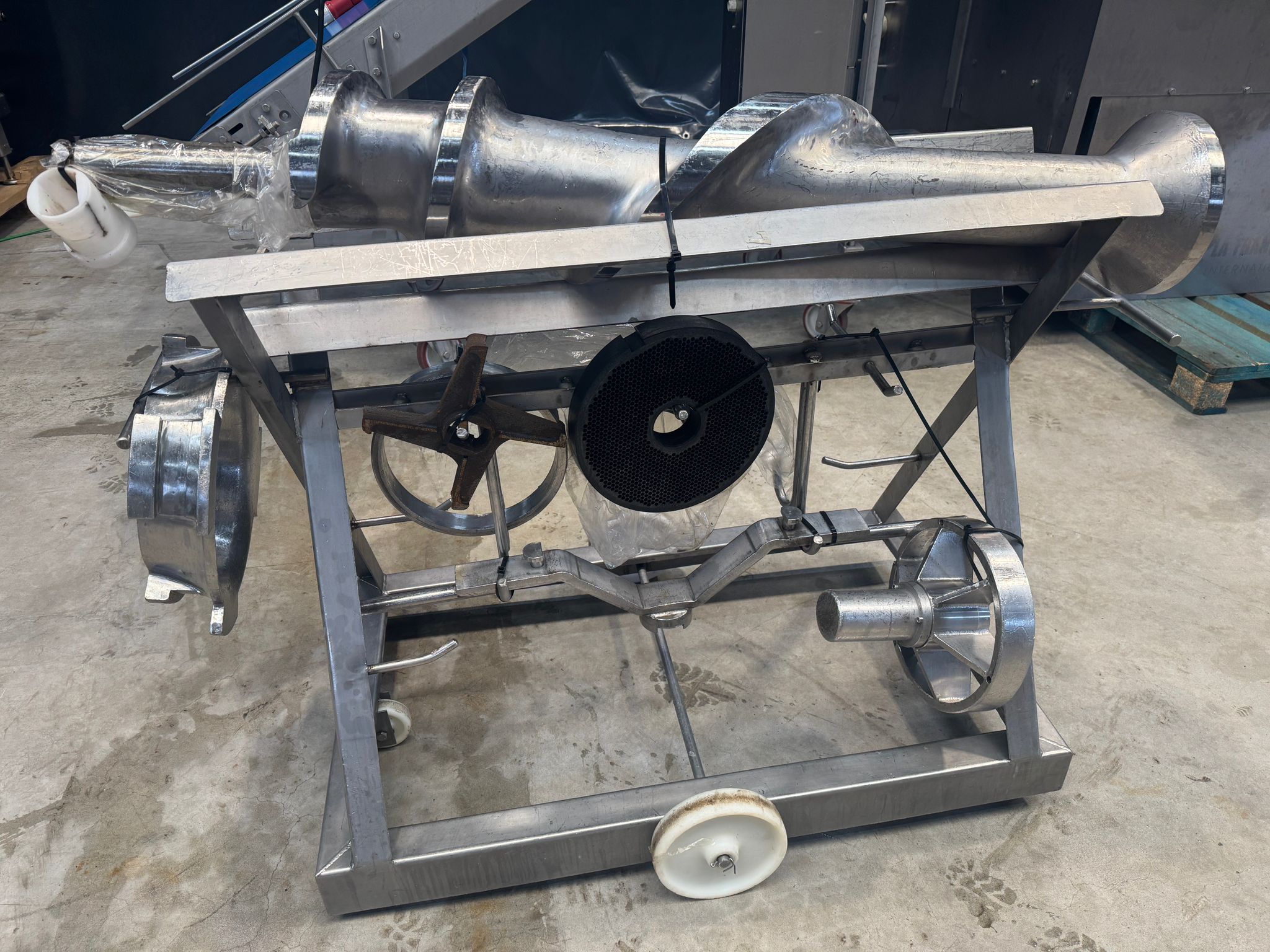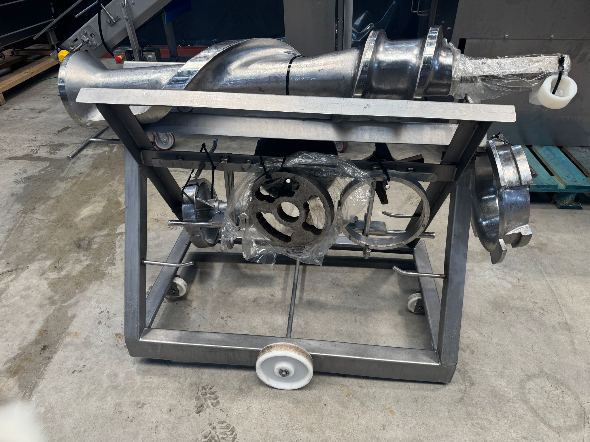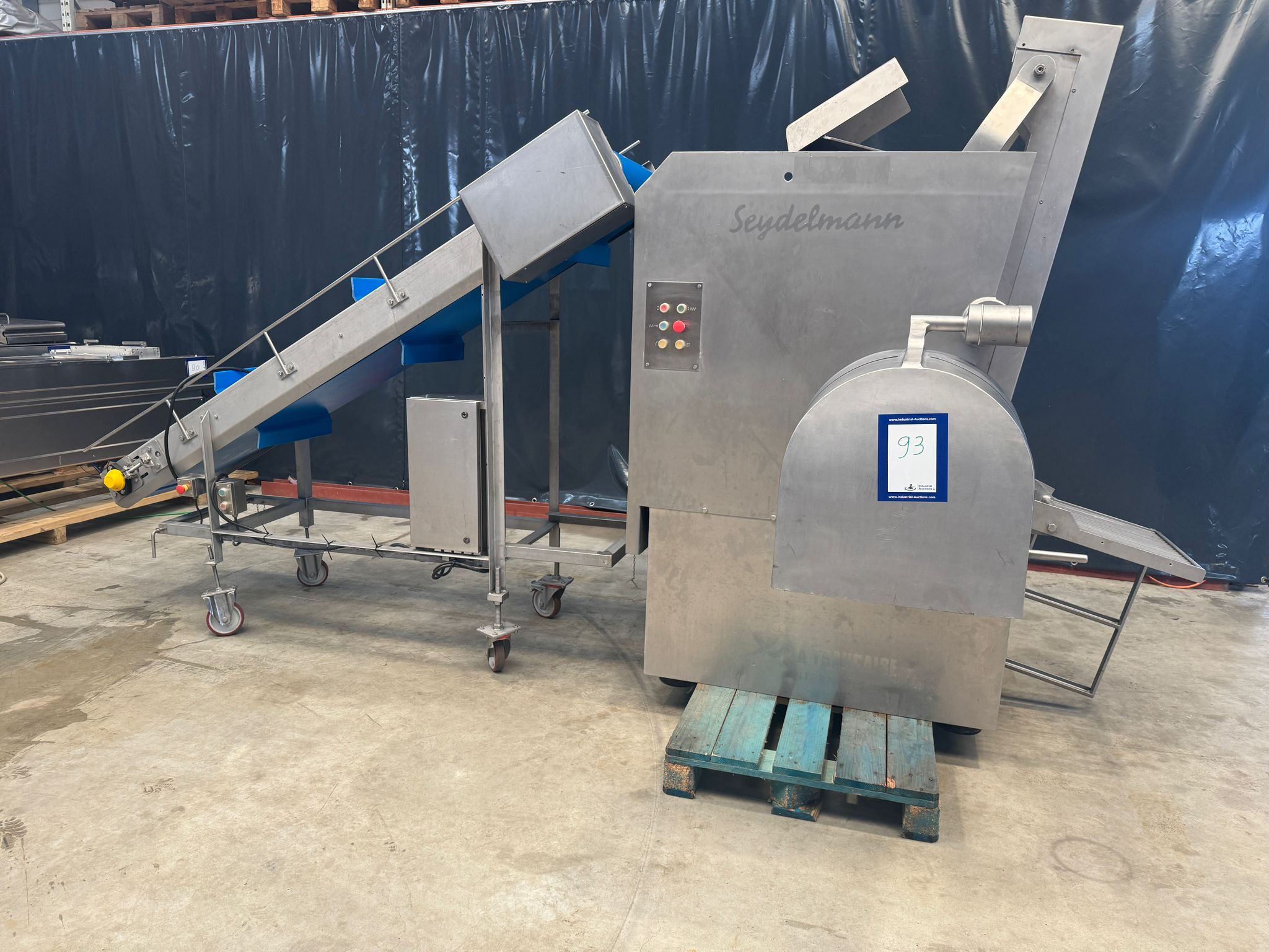 Seydelmann grinder with mobile elevating belt, model: GW 300, 78/105 kW, weight: 3300 kg, capacity: 10.000 kg per hour, plate diameter: 300 mm, total dimensions: 2700 mm x 1500 mm x 2400 mm. Dimensions elevating belt: 2500 mm x 900 mm x 2100 mm.