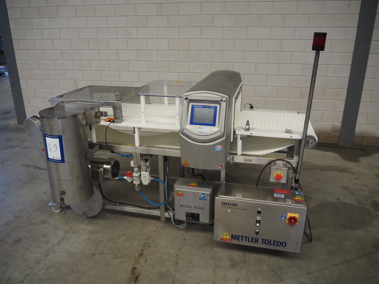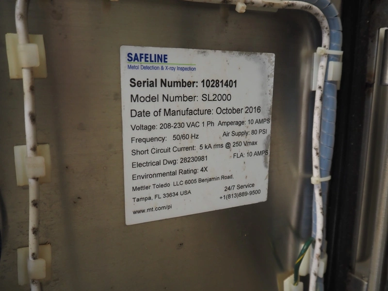 Mettler Toledo mobile metal detector with rejector, model: SL2000, serial number: 10281401, year of construction: 10/2016, 208/230 V, 1 Ph, 50/60 Hz, 10 A, clearance: 500 mm x 175 mm, plastic mesh belt, belt width: 455 mm, total dimensions: 2200 mm x 1000 mm x 1500 mm.