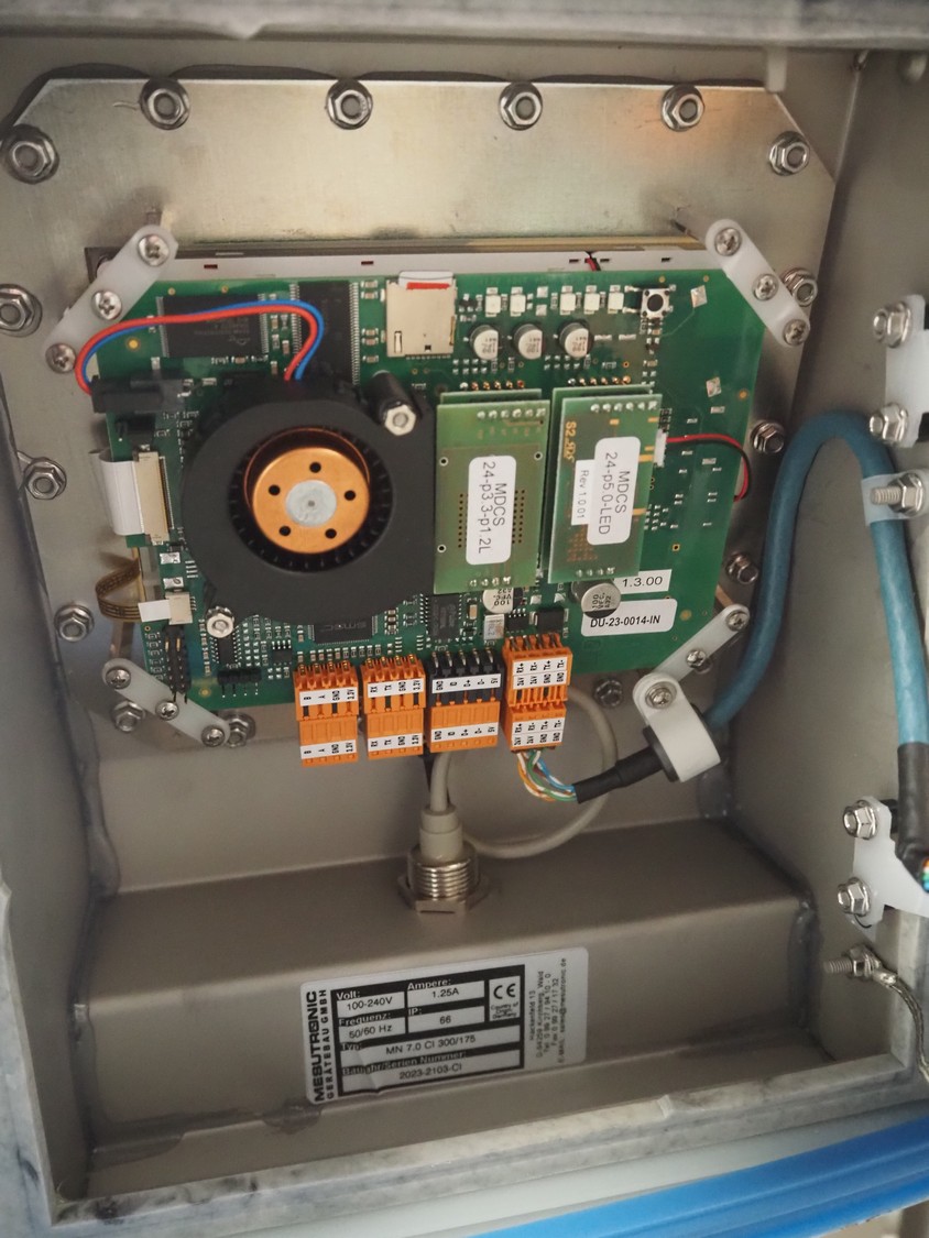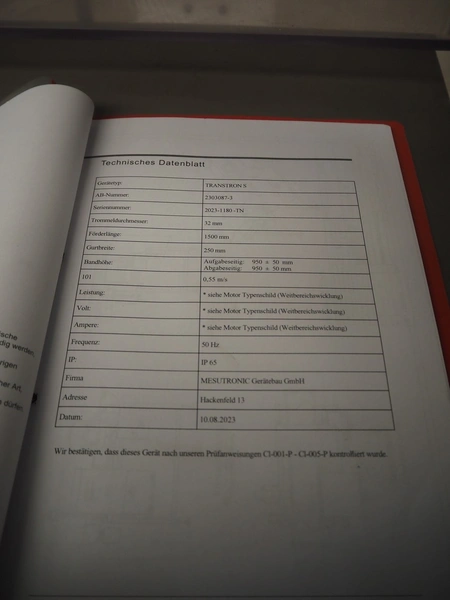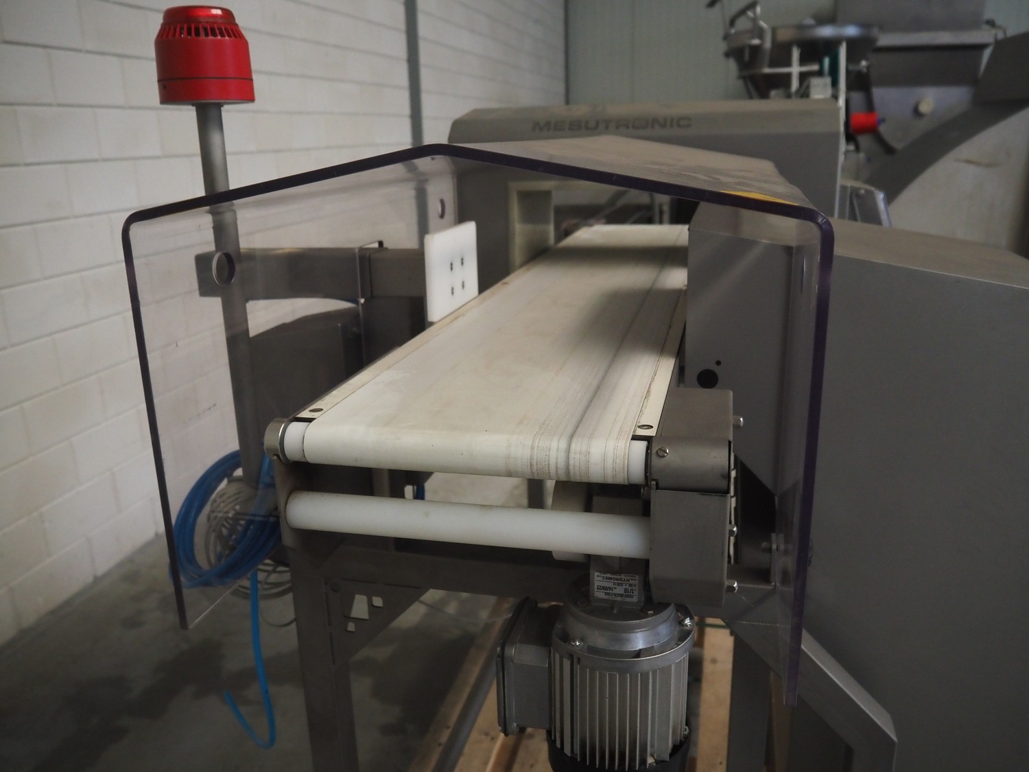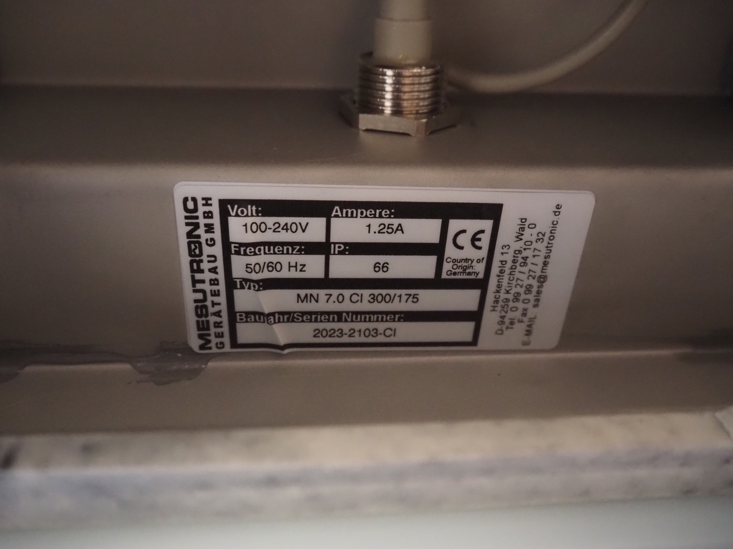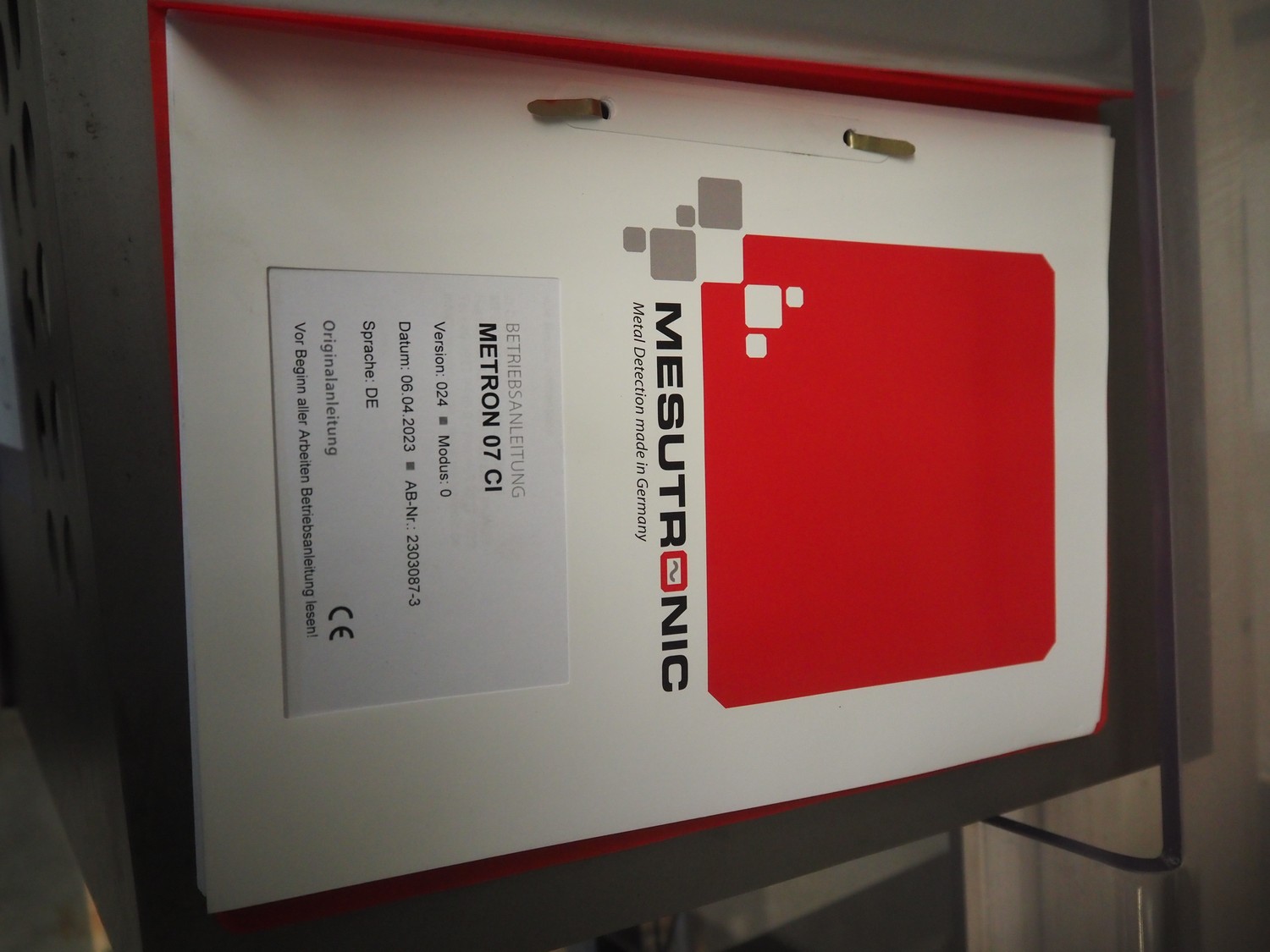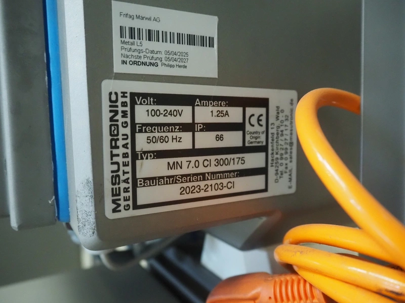 Mesutronic Gerätebau GmbH metal detector with rejector, type: MN 7.0 CI 300/175, serial number: 2103-CI, year of construction: 2023, 100/240 V, 50/60 Hz, 1.25 A, clearance: 300 mm x 125 mm, plastic belt, belt width: 250 mm, total dimensions: 1250 mm x 1000 mm x 1250 mm.