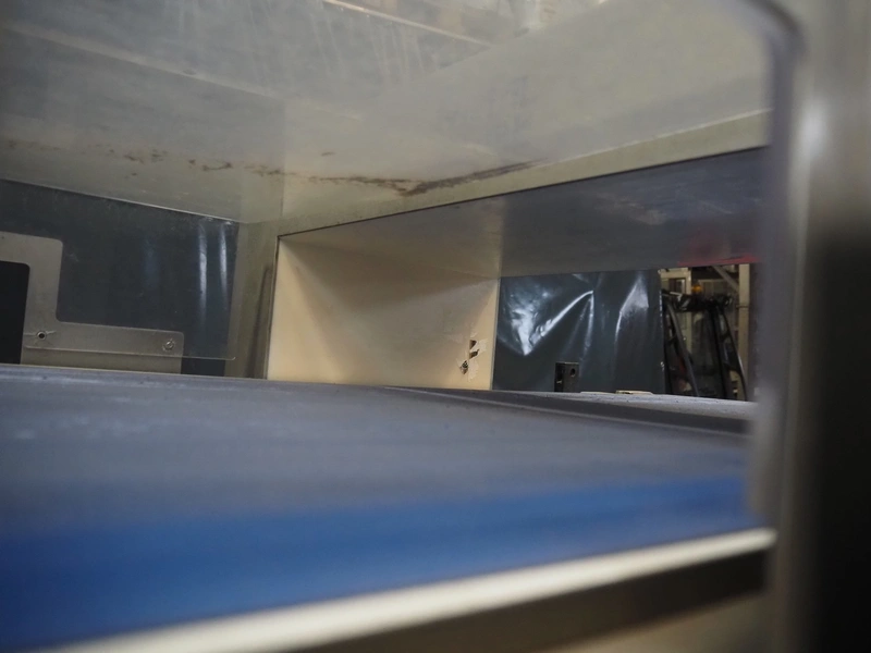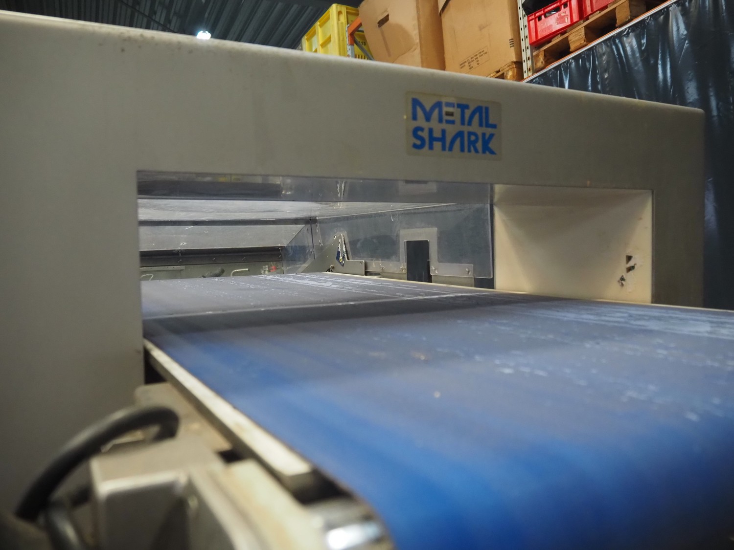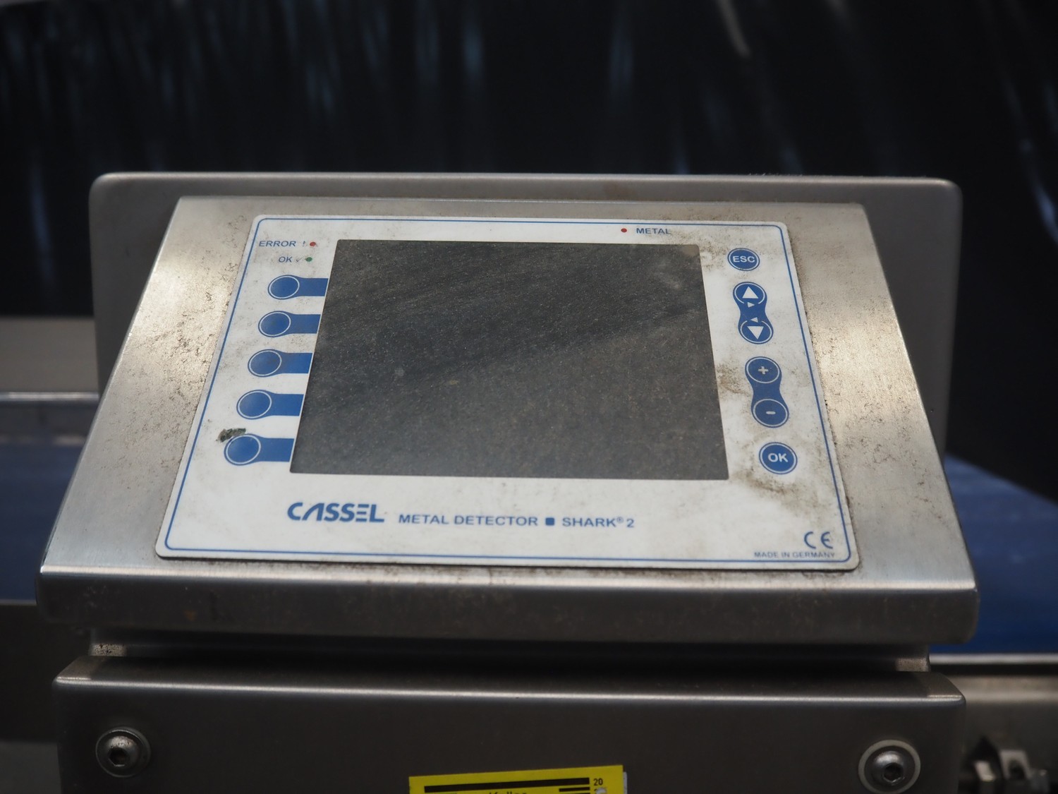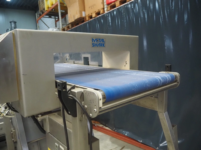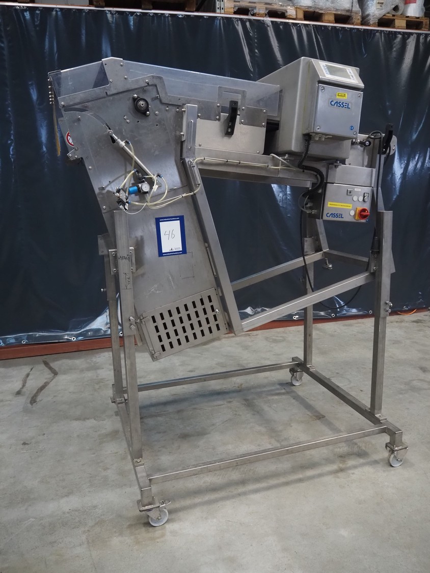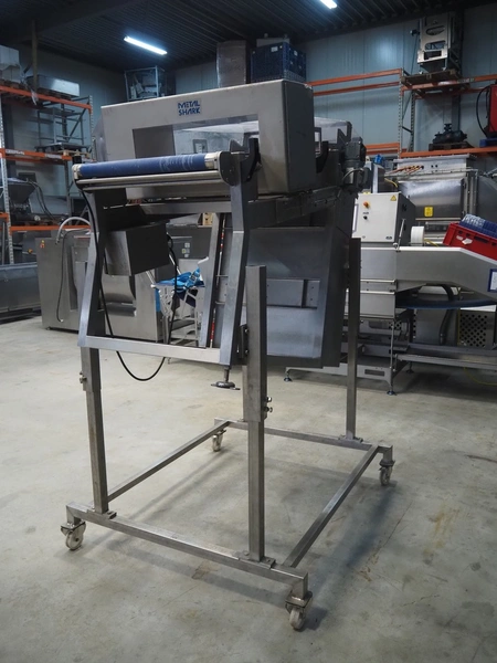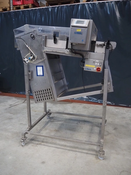 Cassel mobile metal detector with rejector belt, type: Shark 2, clearance: 670 mm x 150 mm, plastic belt, belt width: 600 mm, total dimensions: 1900 mm x 1200 mm x 2250 mm.