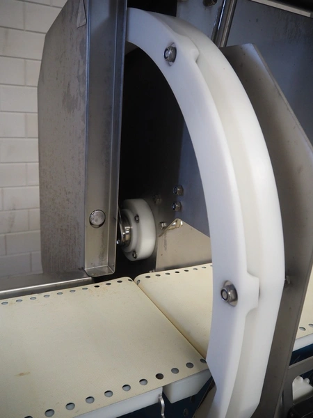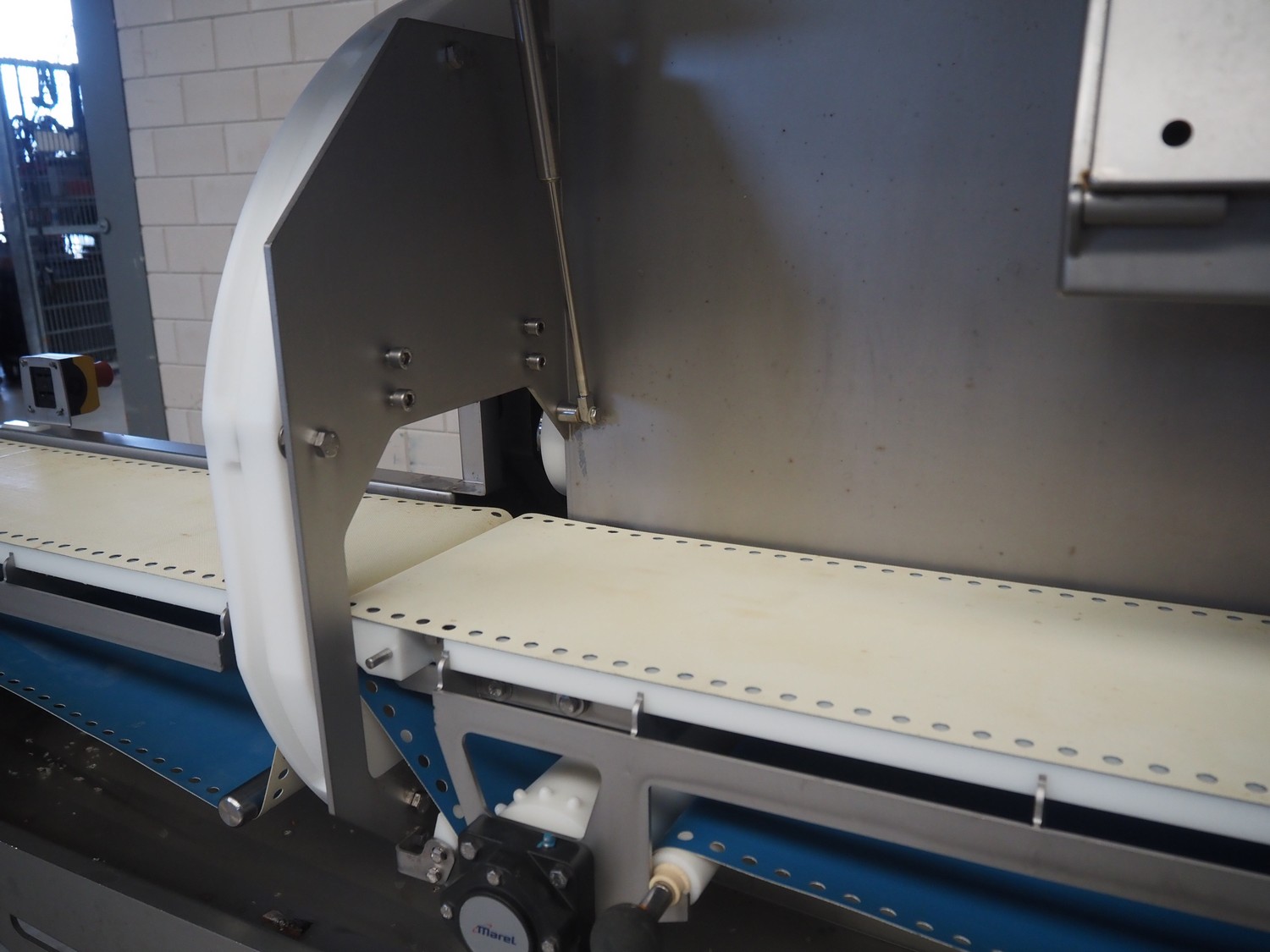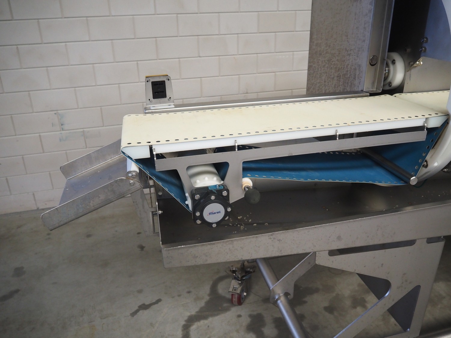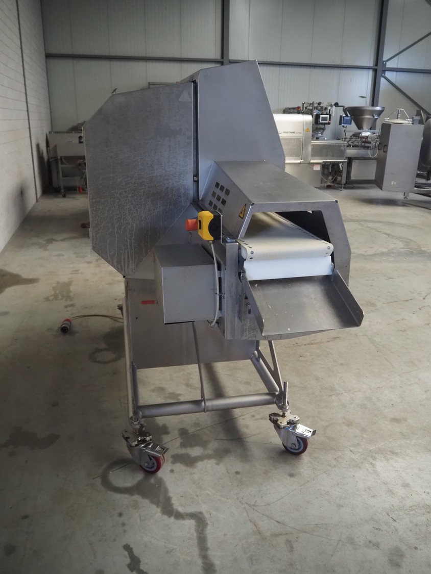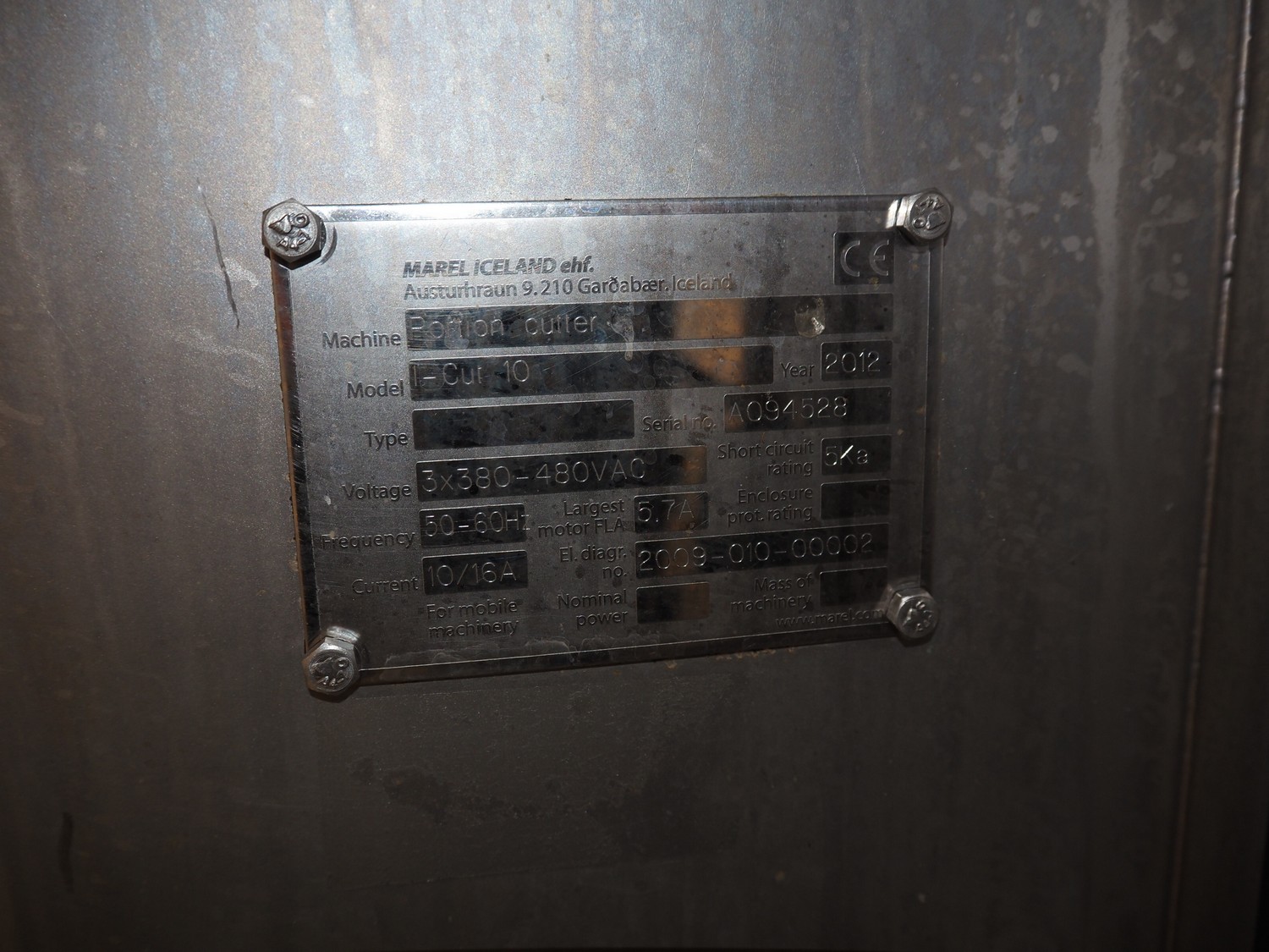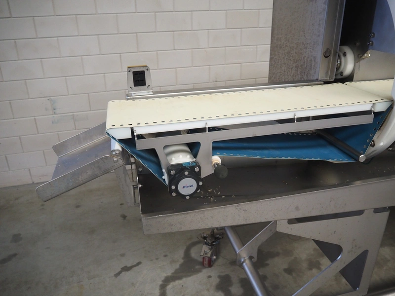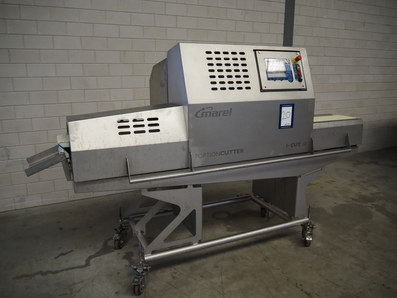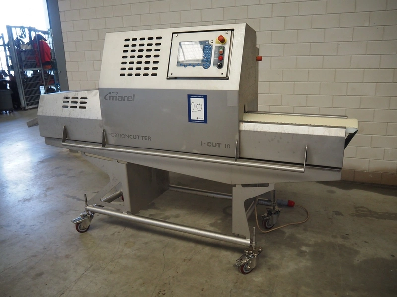 Marel mobile portion cutter, model: I-Cut 10, serial number: A094528, year of construction: 2012, 380/480 V, 3 Ph, 50/60 Hz, 5.7/10/16 A, clearance: 280 mm x 105 mmm, plastic belt, belt width: 280 mm, total dimensions: 2880 mm x 1750 mm x 1750 mm.