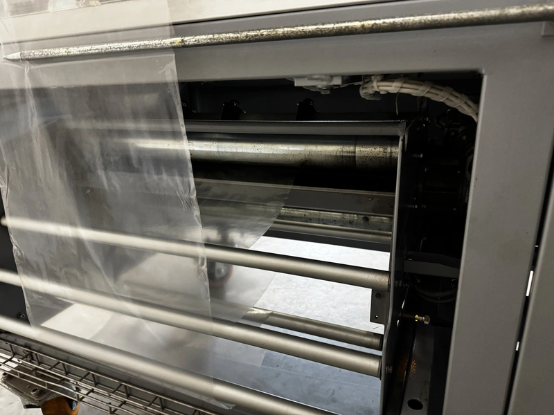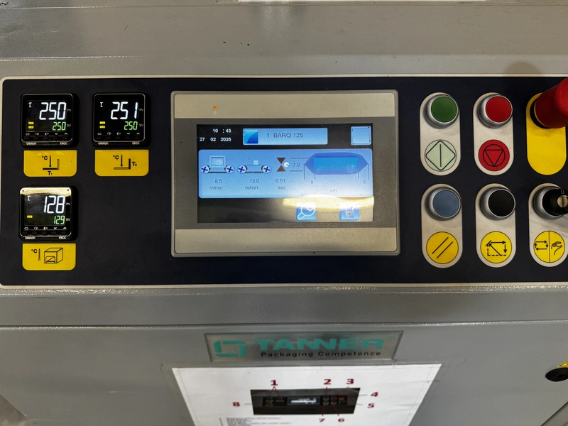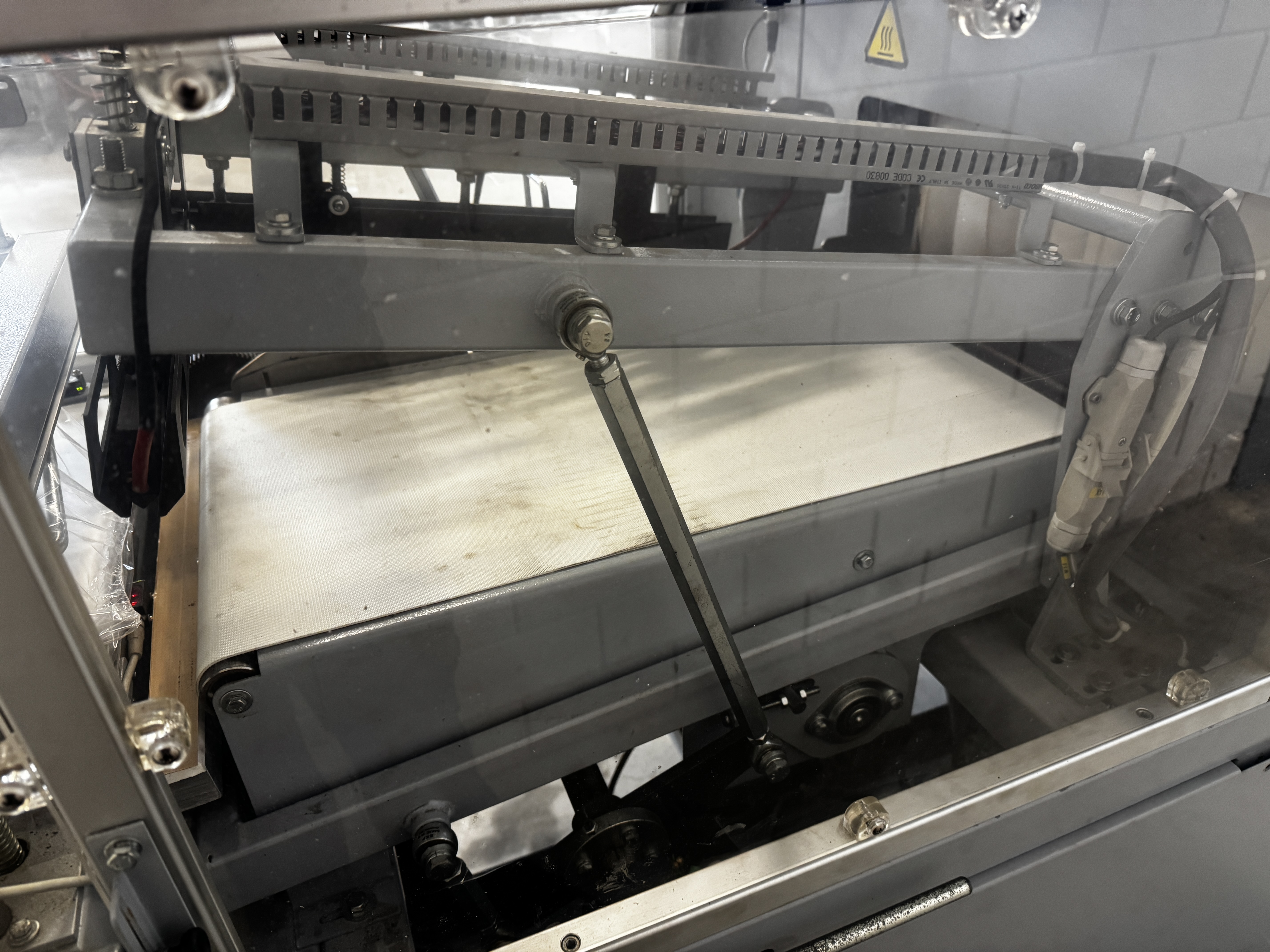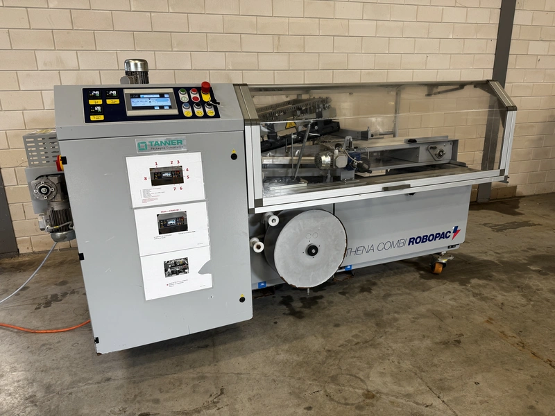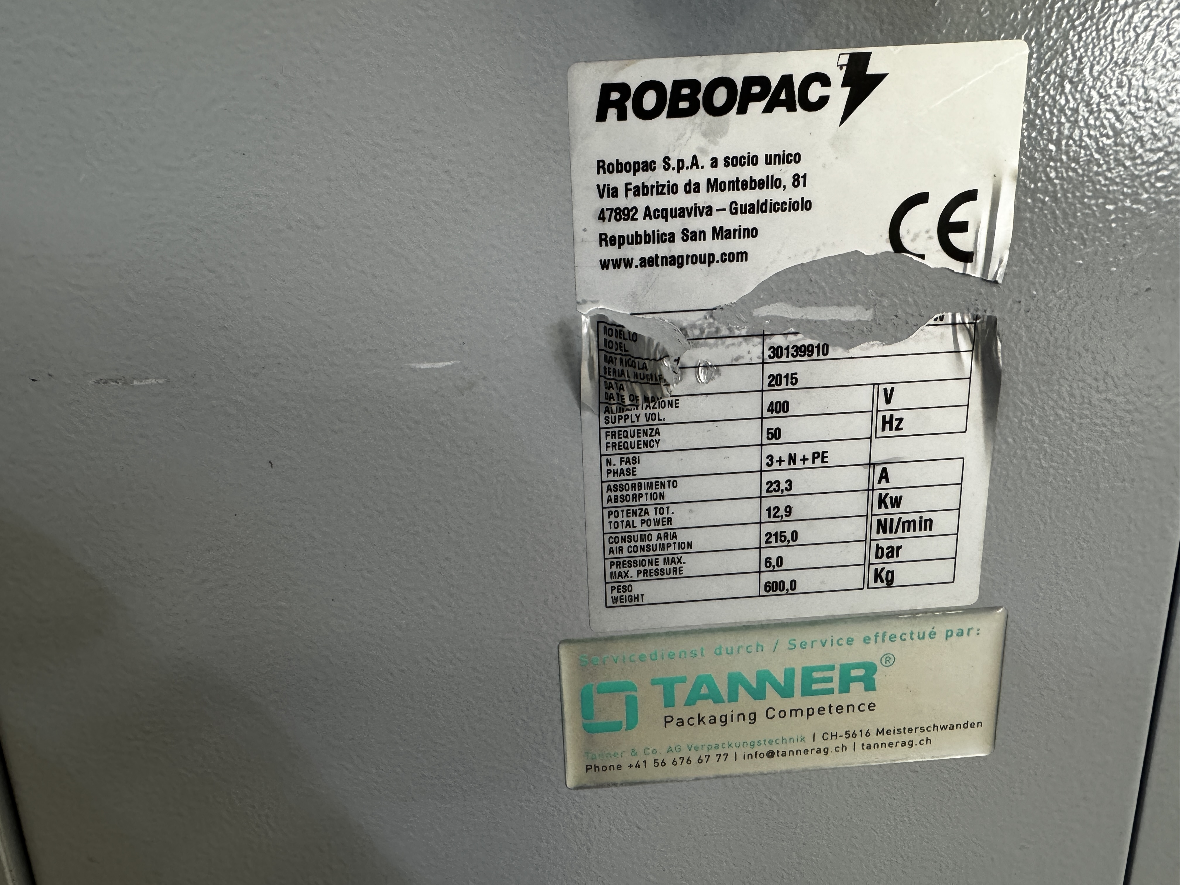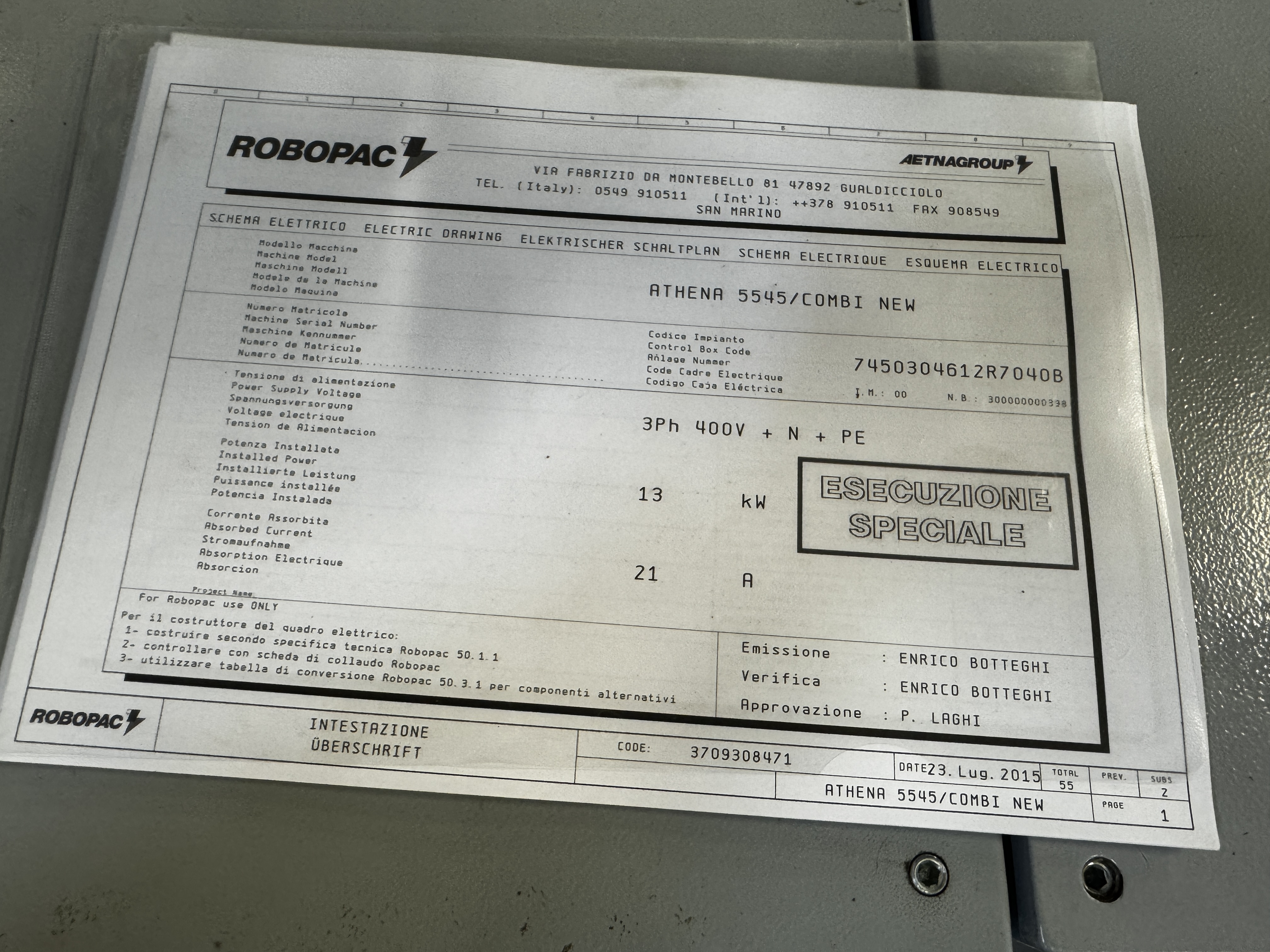 Robopac S.p.A. shrink packaging machine, model: Athena 5545/Combi new, serial number: 30139910, year of construction: 2015, 400 V, 3 Ph, 50 Hz, 23.3 A, 12.9 kW, 6 bar, weight: 600 kg, maximum product height: 120 mm, total dimensions: 2700 mm x 1200 mm x 1500 mm.