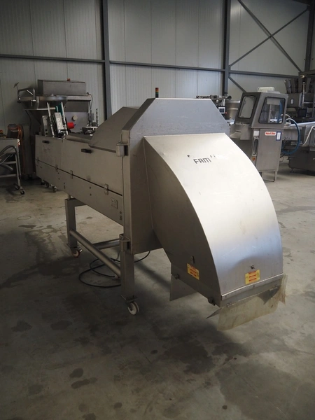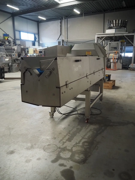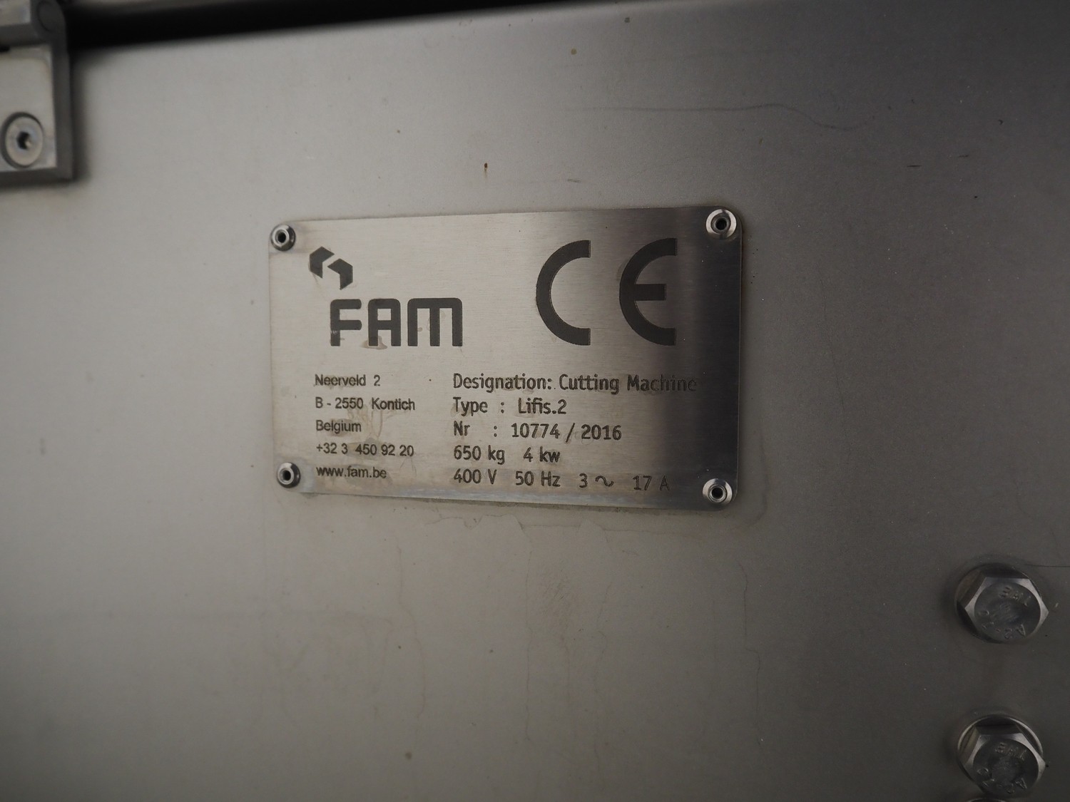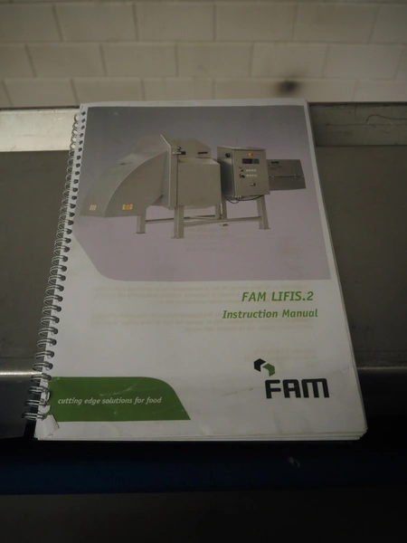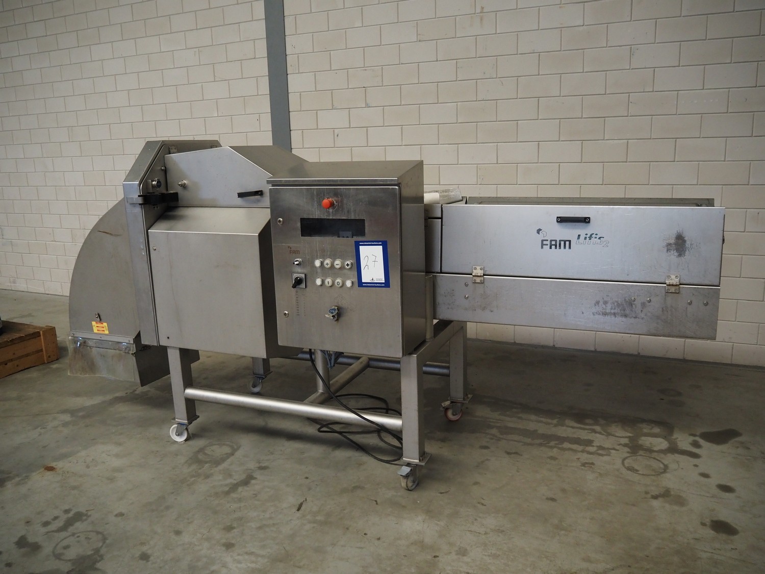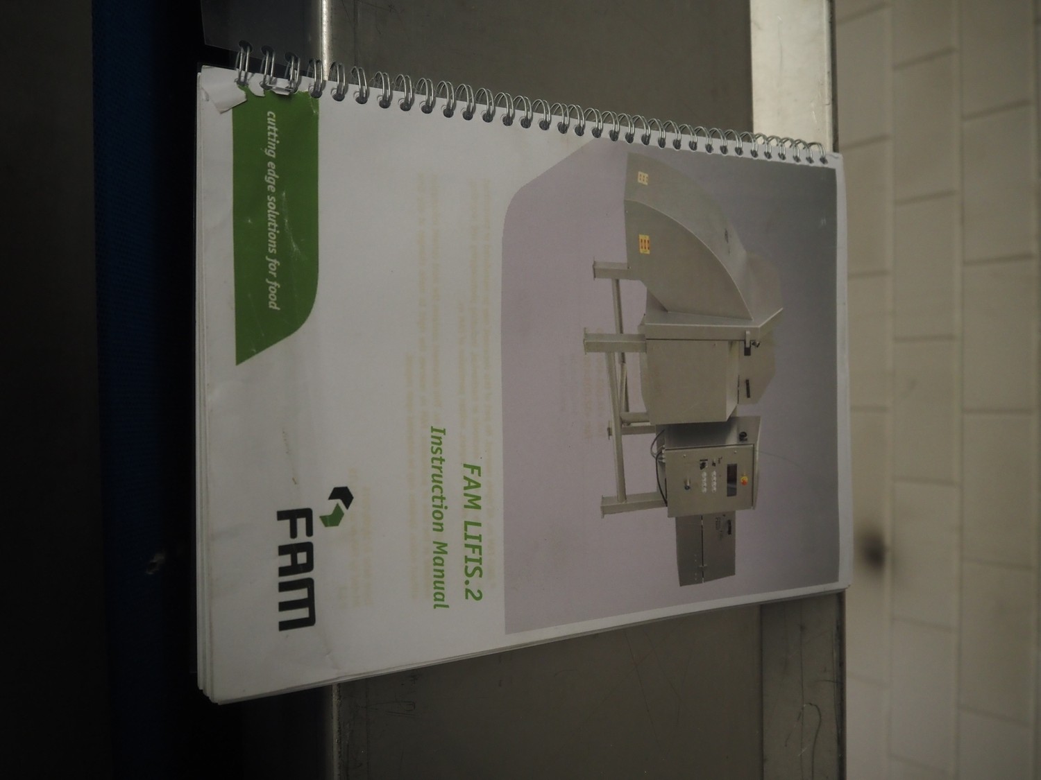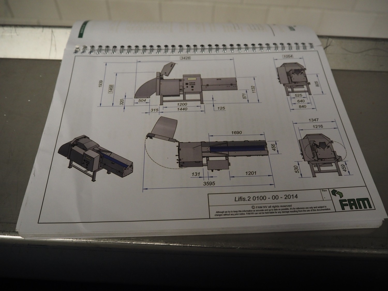 FAM mobile vegetable slicer, type: Lifis.2, number: 10774, year of construction: 2016, 400 V, 3 Ph, 50 Hz, 17 A, 4 kW, plastic belts, belt width: (2x) 140 mm, total dimensions: 3610 mm x 1280 mm x 1820 mm. Including extra knife, plastic belt and tools.