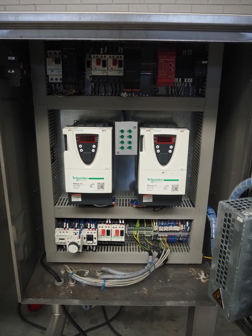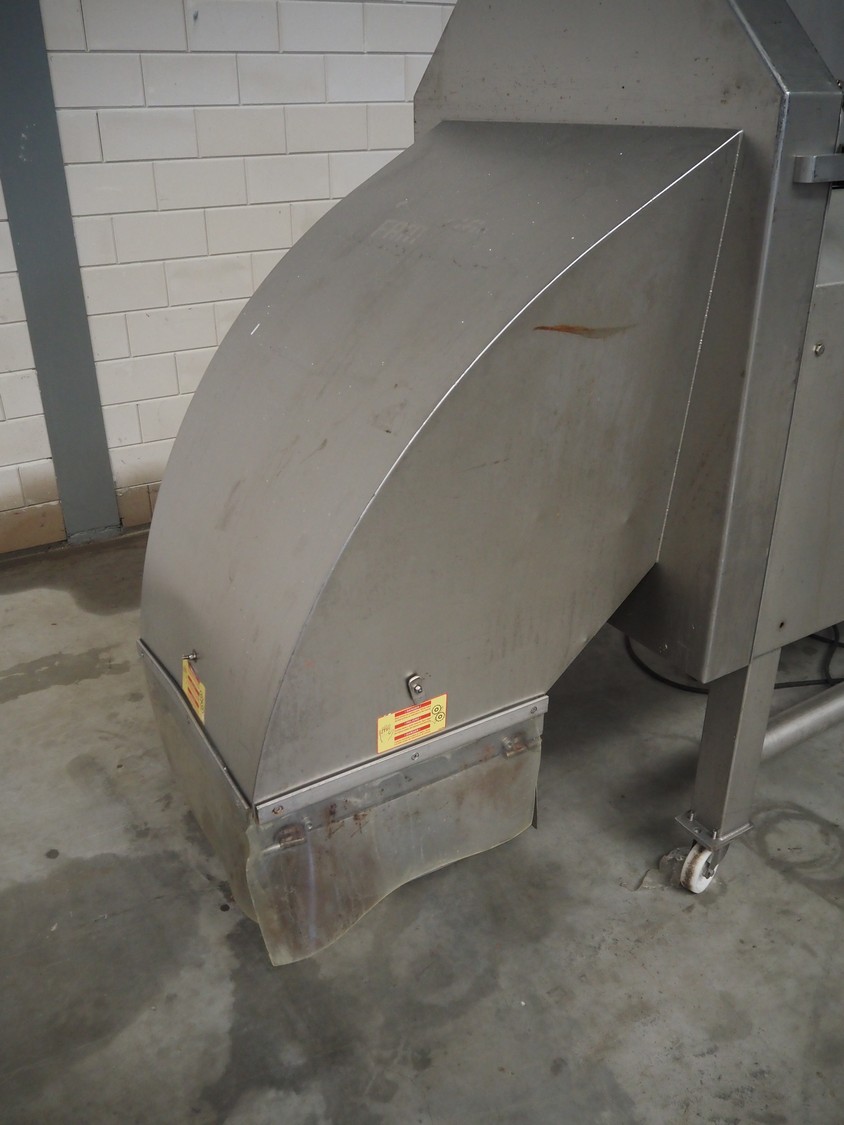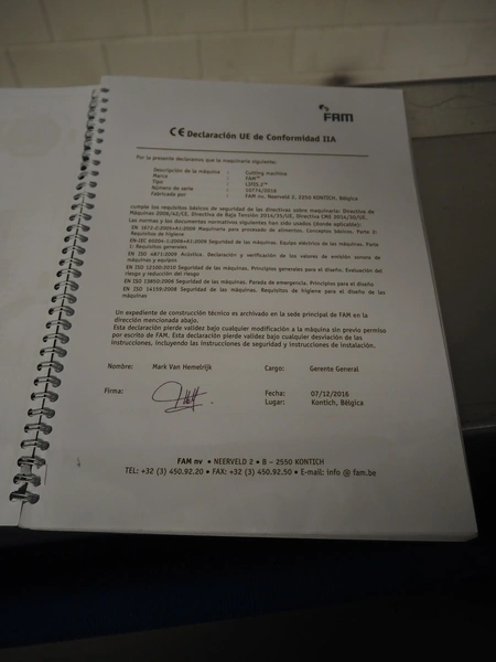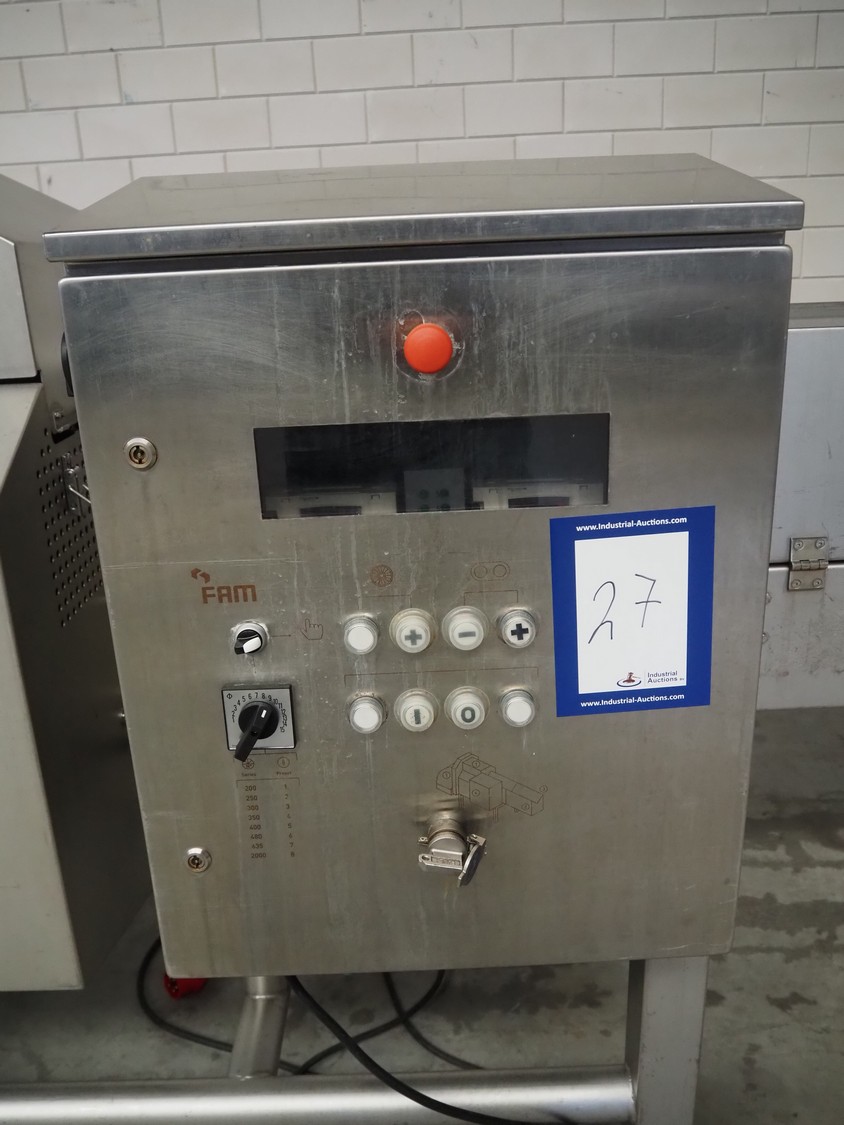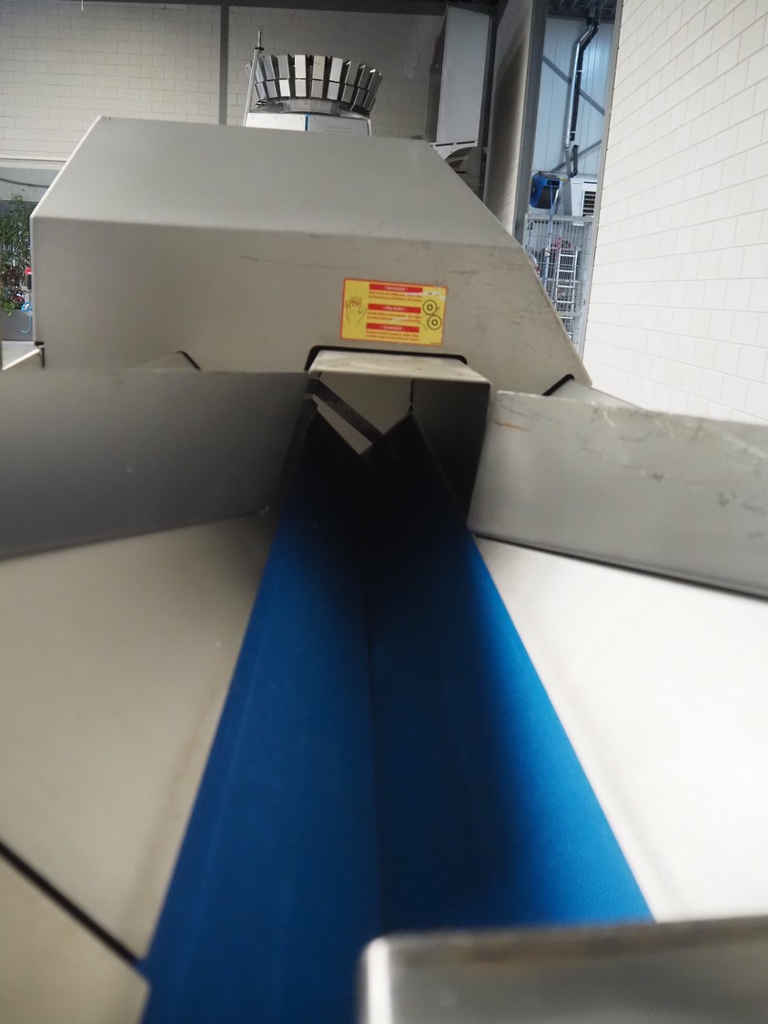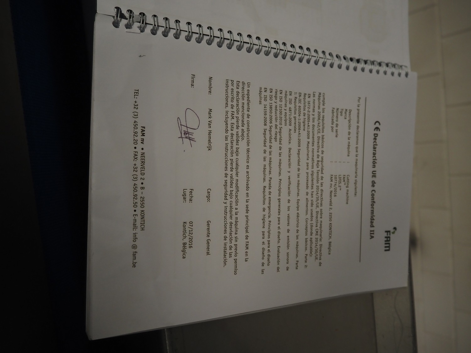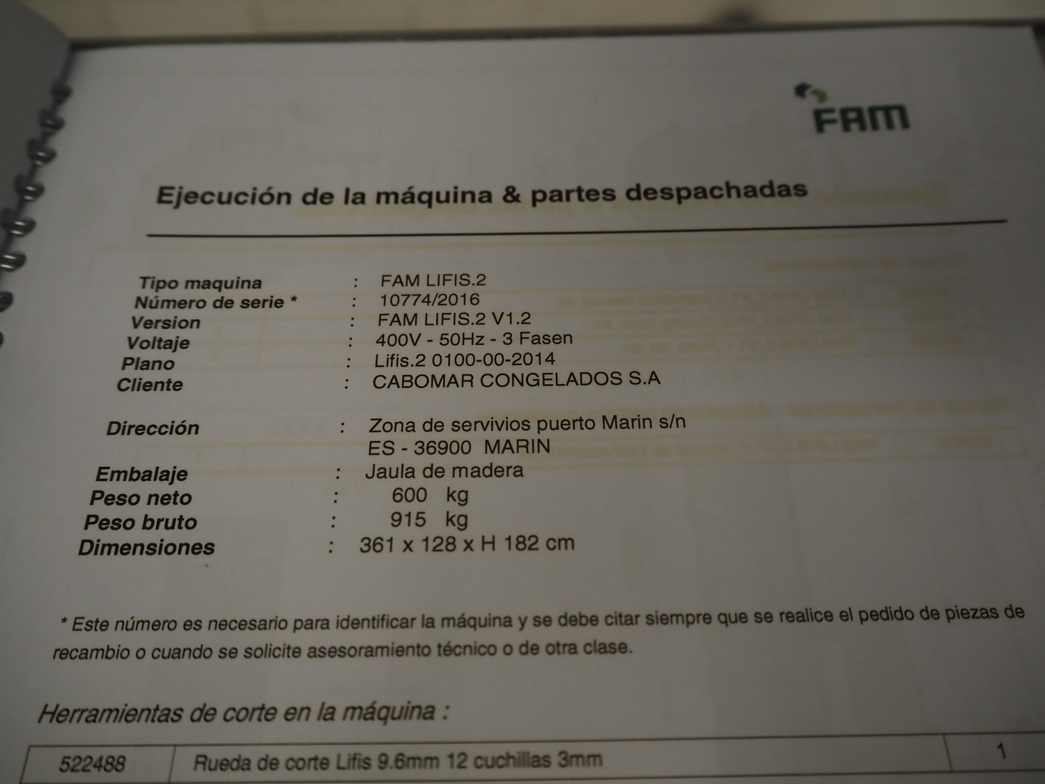FAM mobile vegetable slicer, type: Lifis.2, number: 10774, year of construction: 2016, 400 V, 3 Ph, 50 Hz, 17 A, 4 kW, plastic belts, belt width: (2x) 140 mm, total dimensions: 3610 mm x 1280 mm x 1820 mm. Including extra knife, plastic belt and tools.